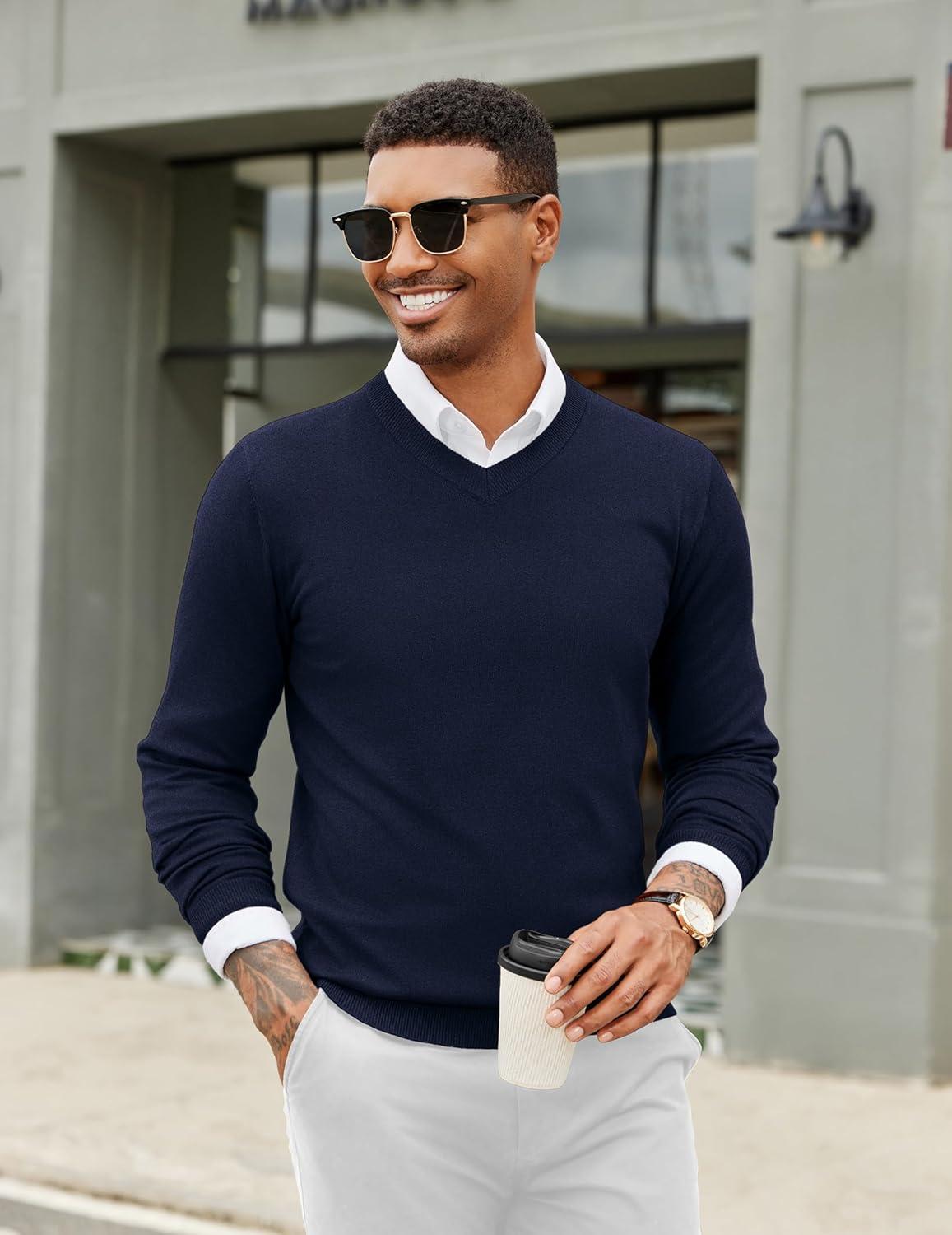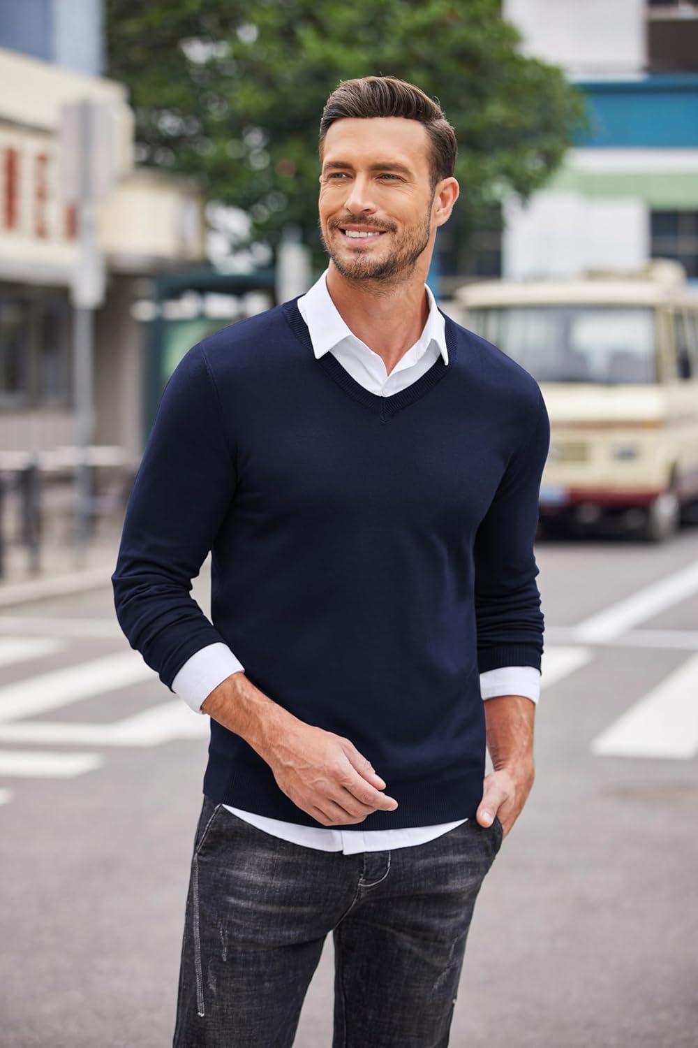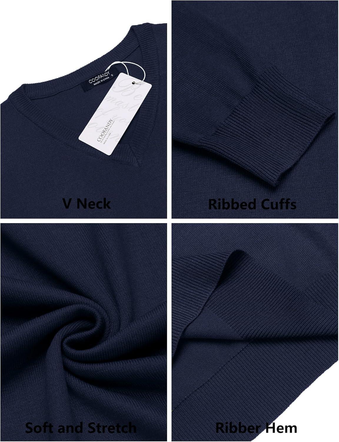 COOFANDY Men Casual V Neck Sweater Ribbed Knit Slim Fit Long Sleeve Pullover Top(Blue)
