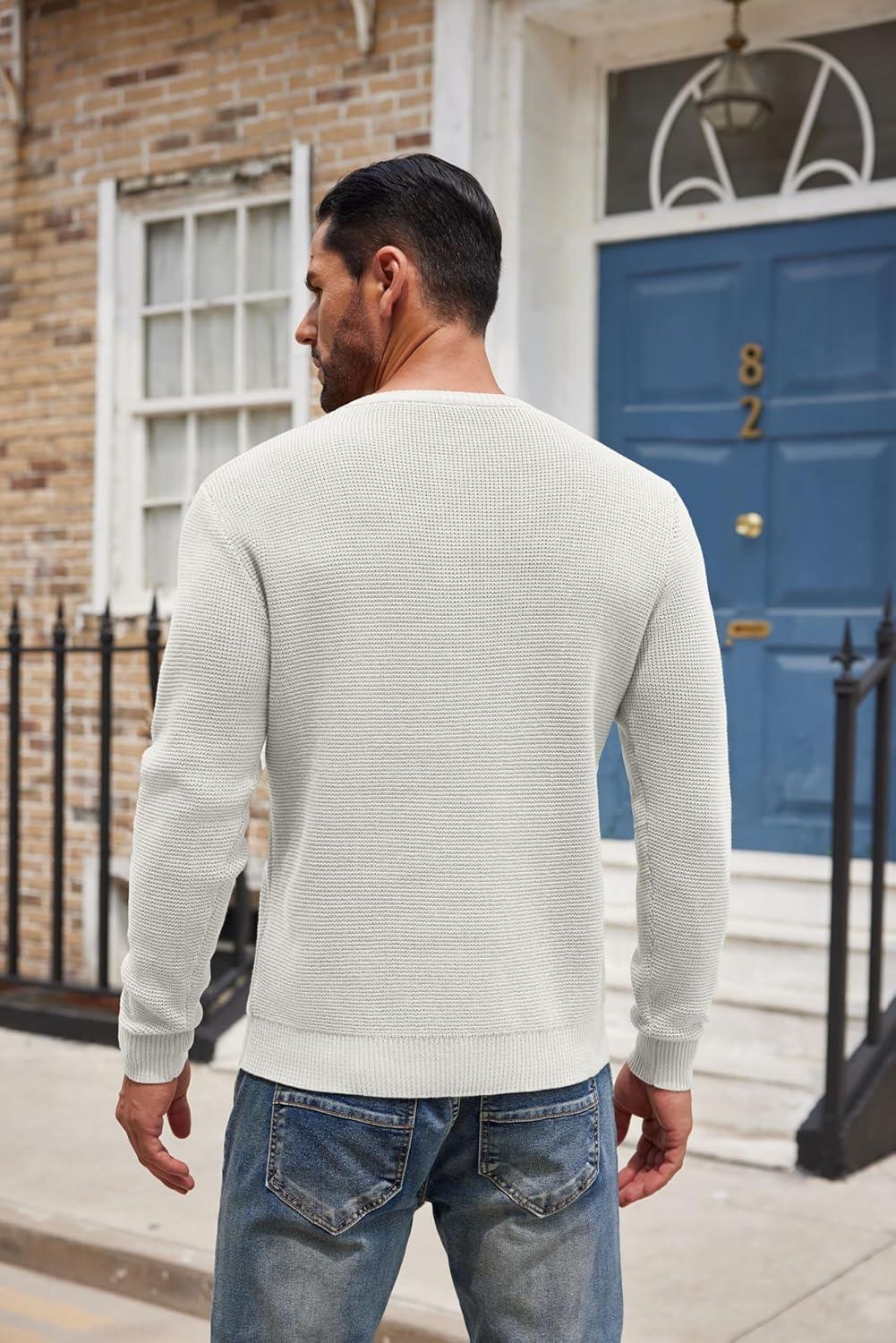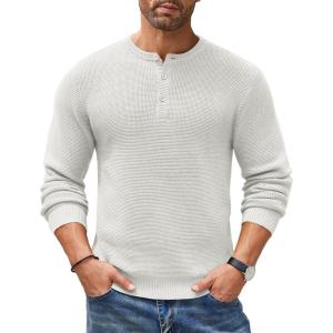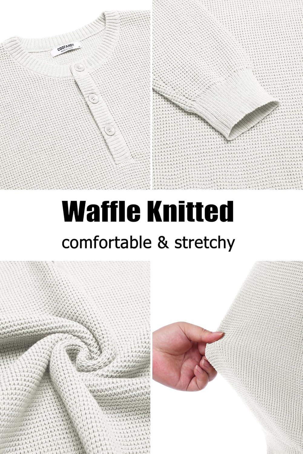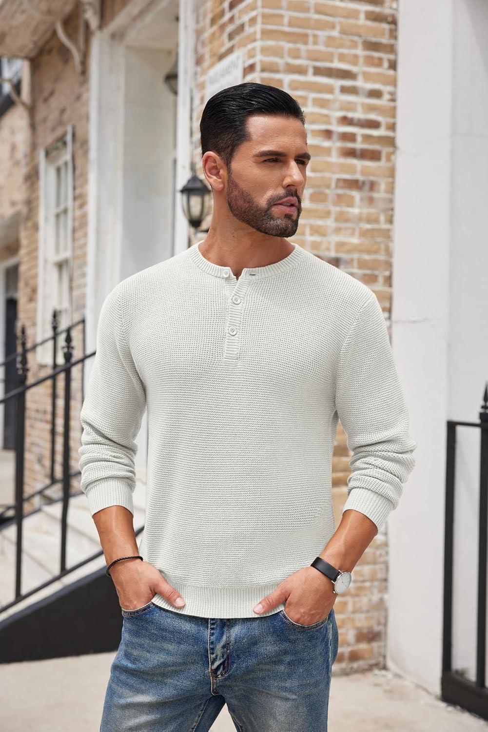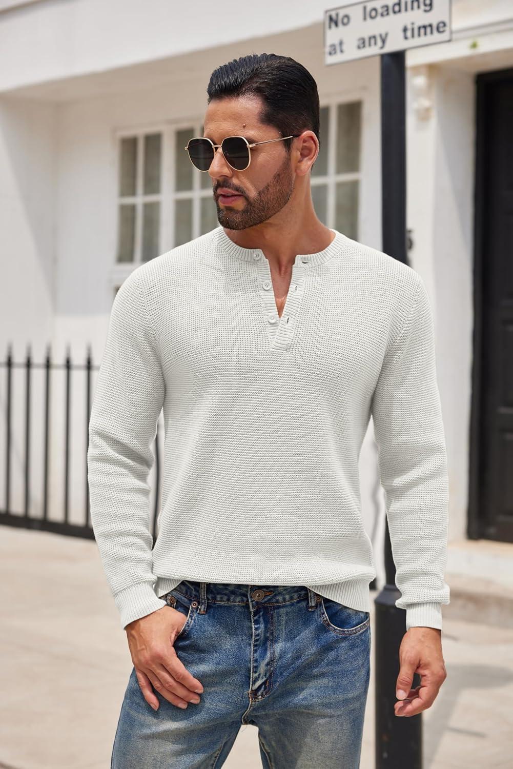COOFANDY Men’s Henley Knit Sweater Long Sleeve Button Pullover Sweater Casual Waffle Texture Fashion Henley Sweater(White)