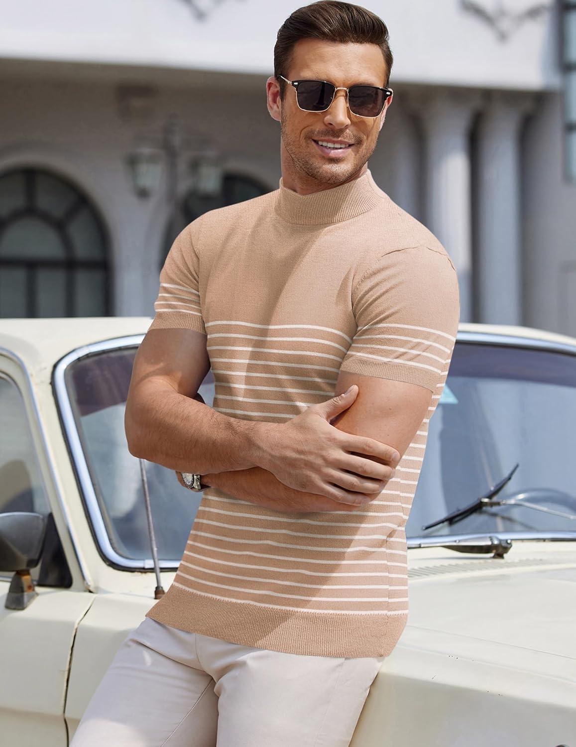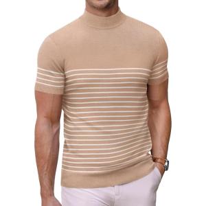 COOFANDY Mens Mock Turtleneck Sweater Short Sleeve Casual Dress Sweater Slim Fit Pullover Basic Knit Tee(Striped Khaki)