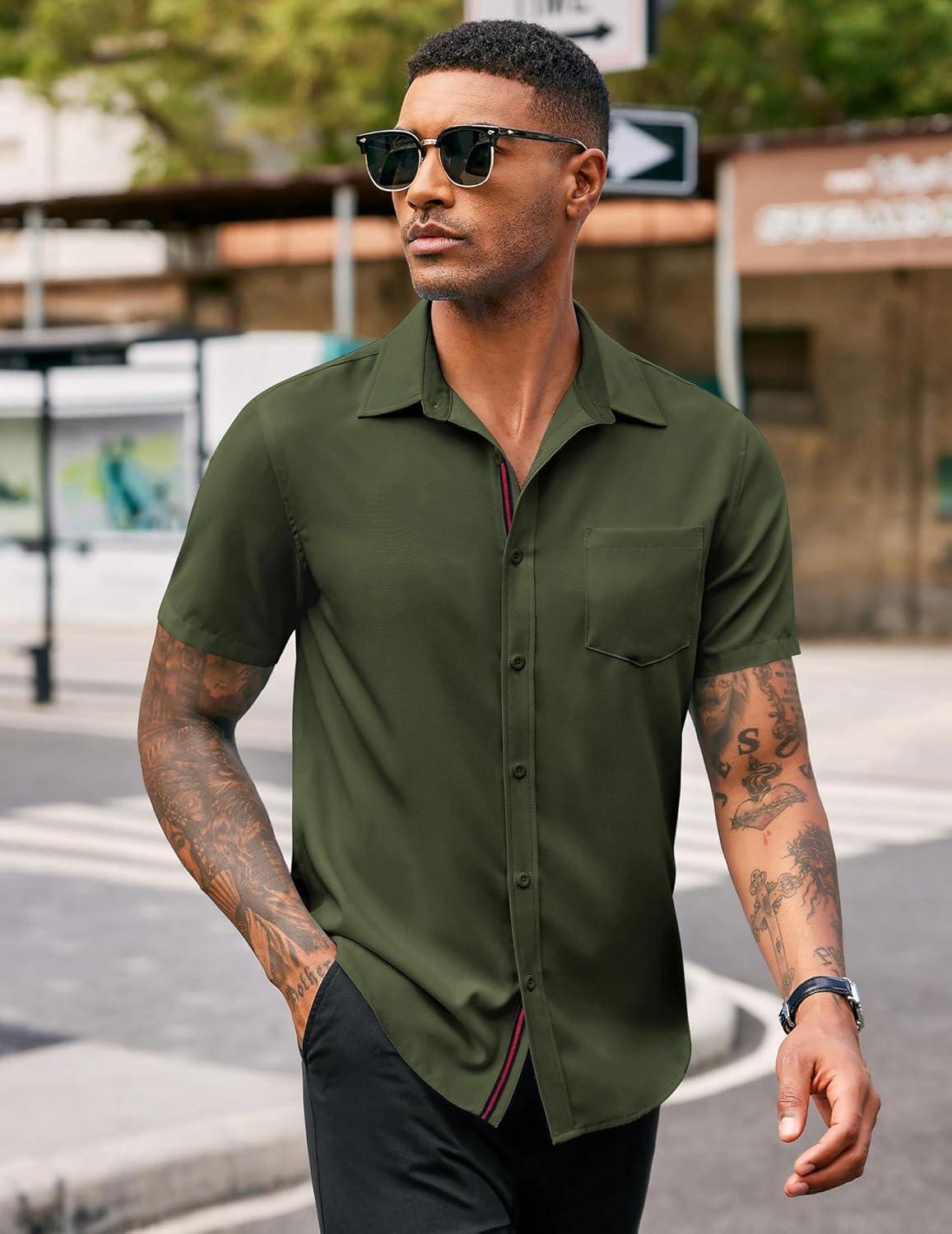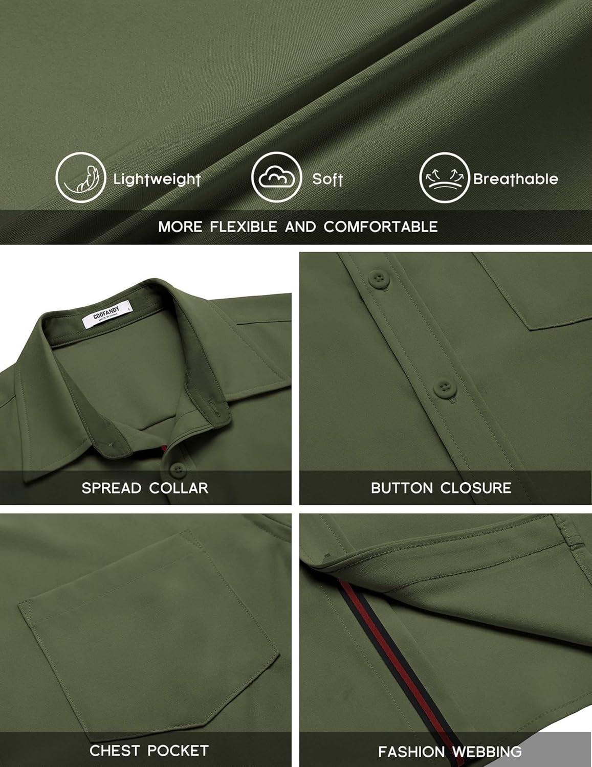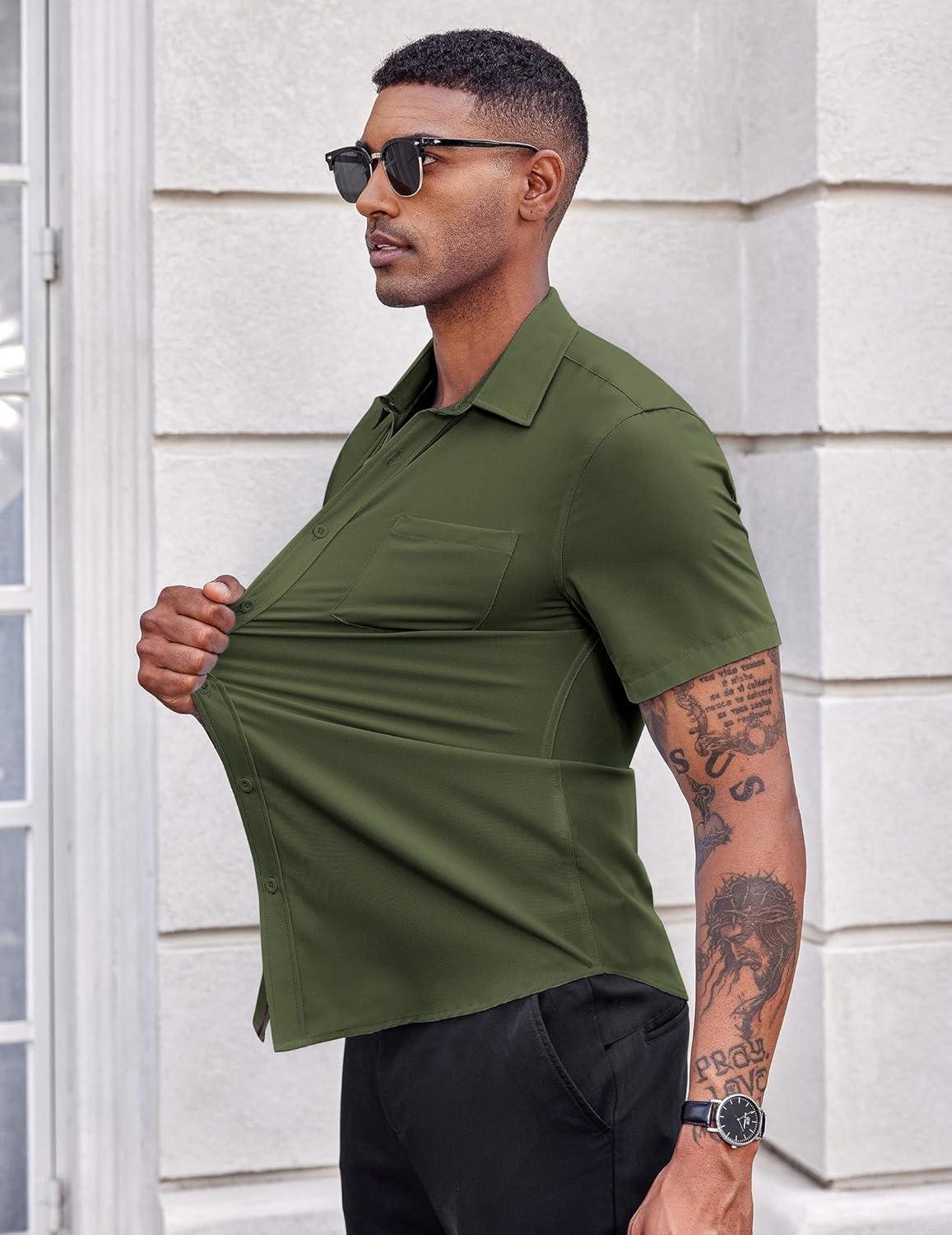 COOFANDY Men’s Casual Button Down Shirts Stretch Short Sleeve Business Dress Shirt with Pocket(Army Green)