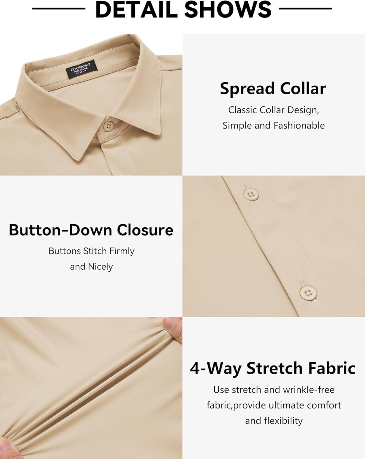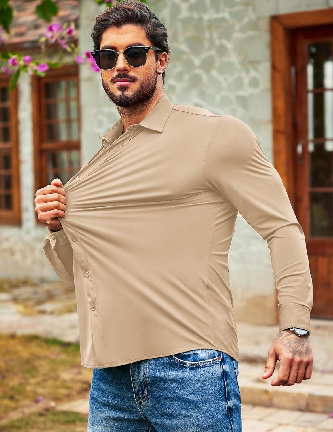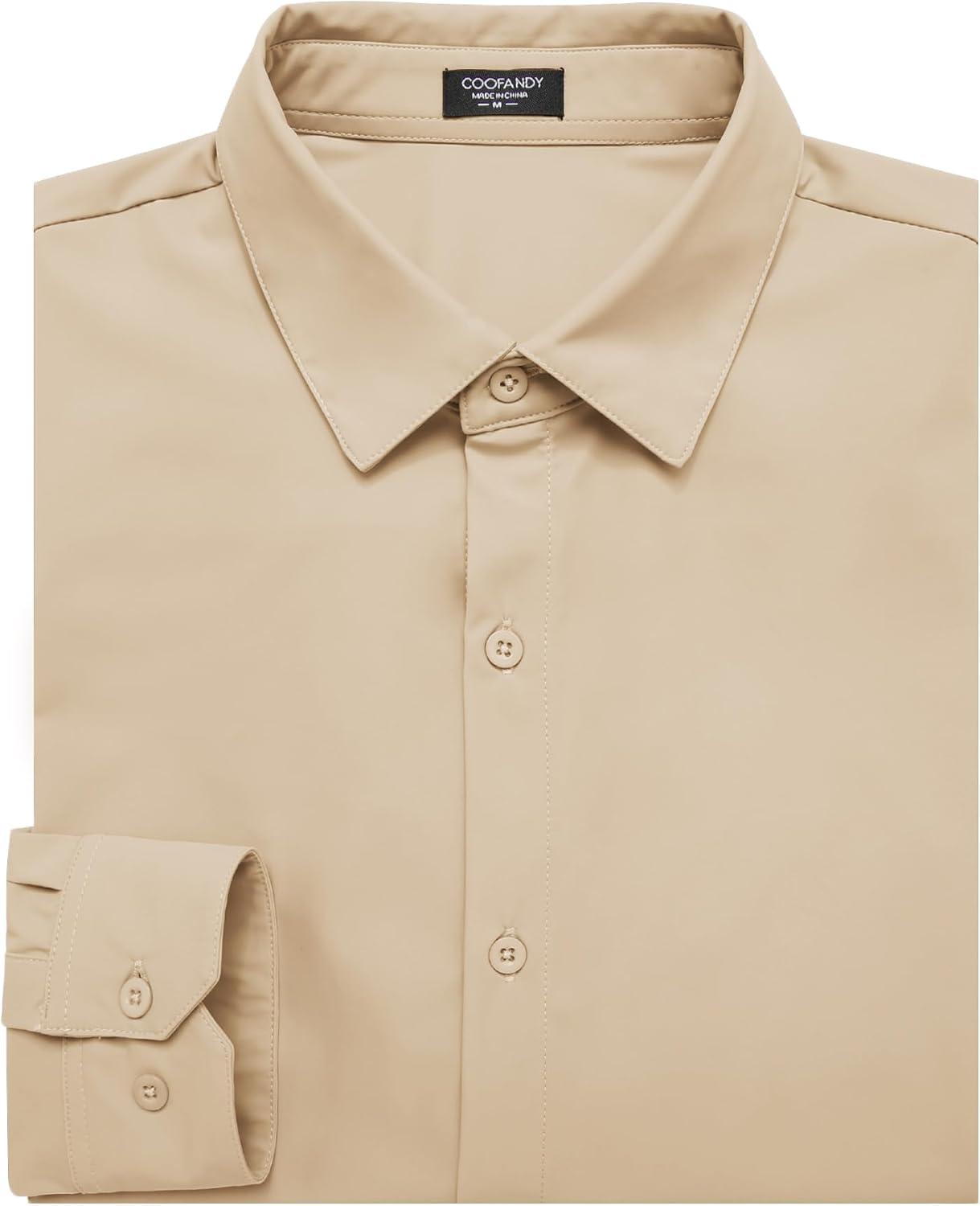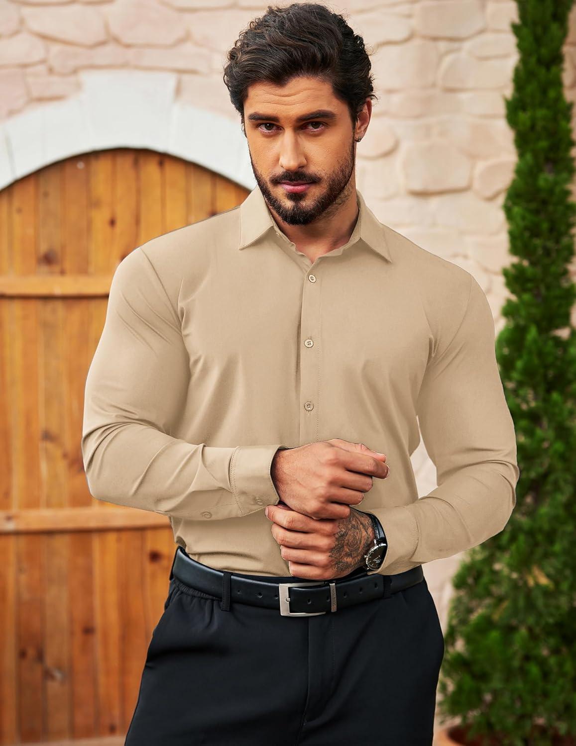 COOFANDY Men’s Muscle Fit Dress Shirts Wrinkle Free Long Sleeve Button Down Shirt Stretch Business Shirt(Light Khaki)