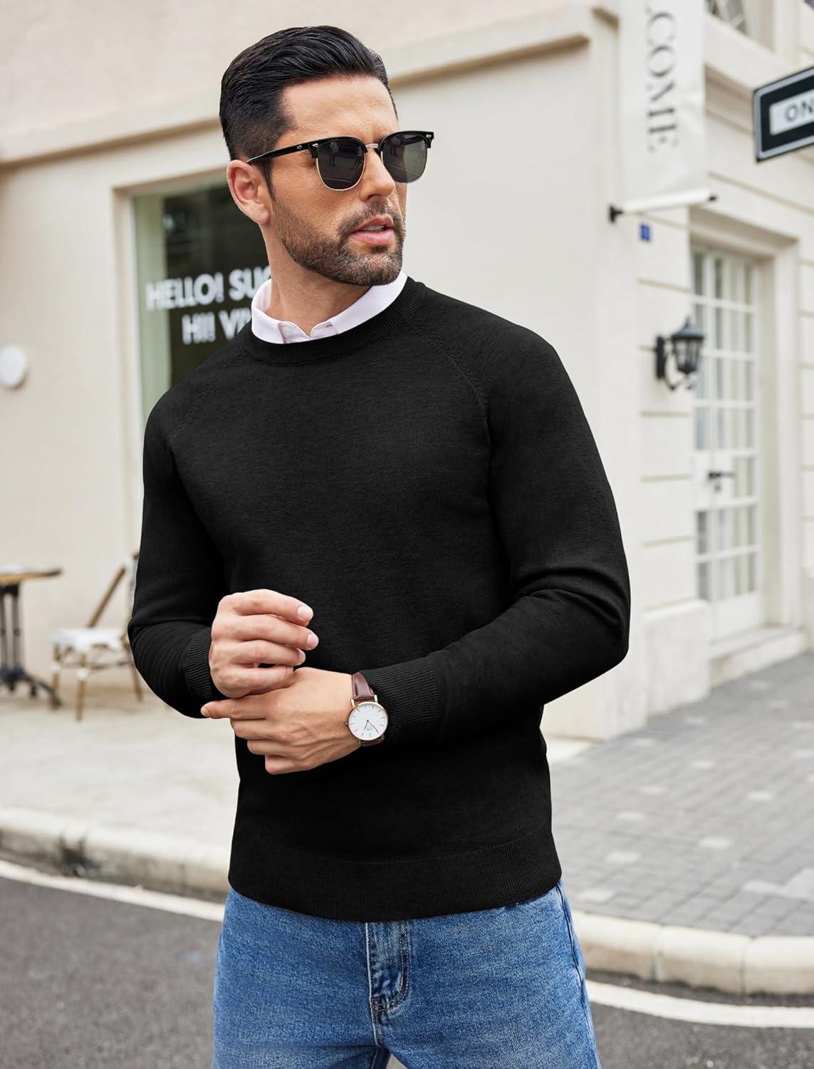 COOFANDY Men’s Crewneck Sweater Casual Dress Pullover Sweaters Slim Fit Lightweight Long Sleeve Raglan Sweaters(Black)