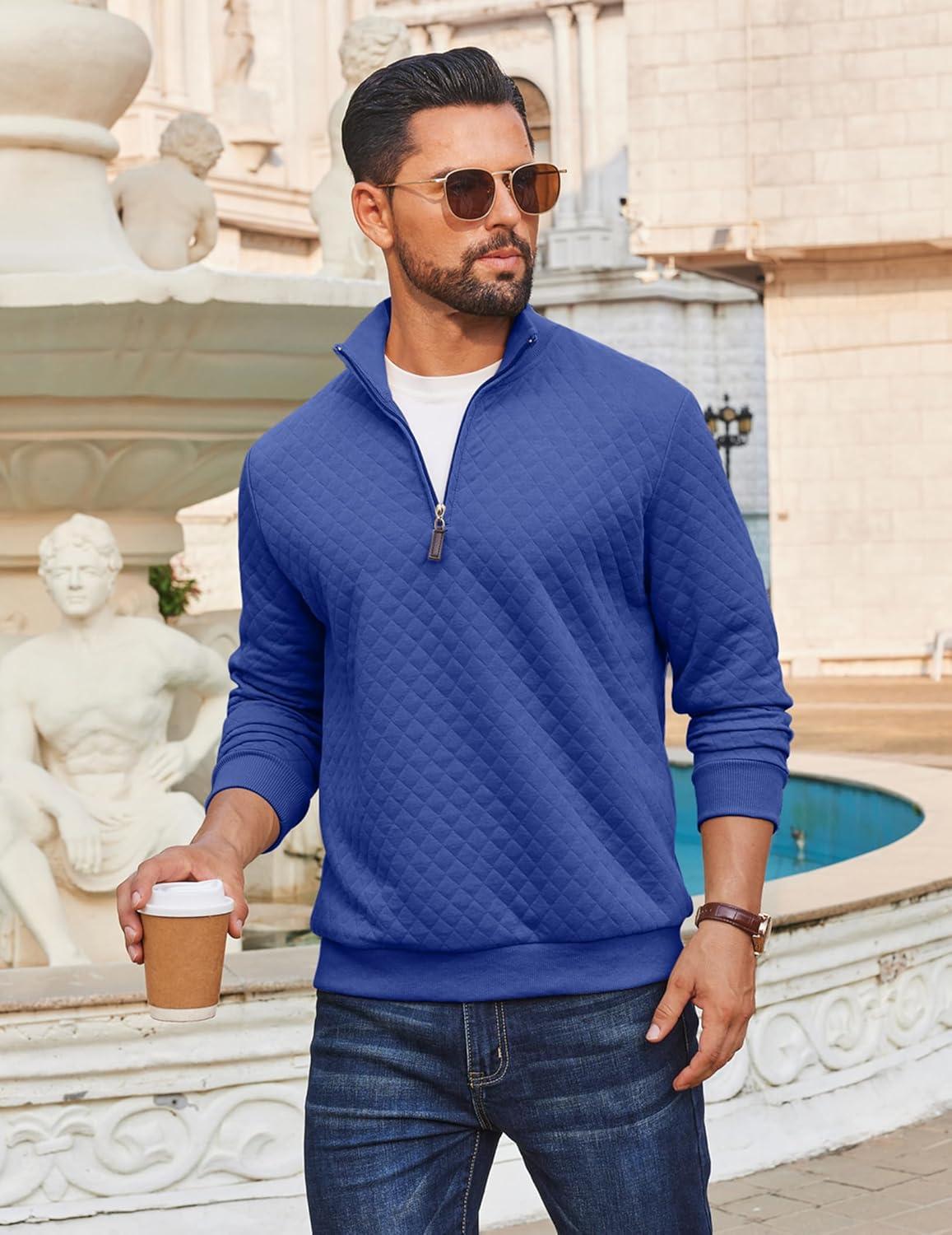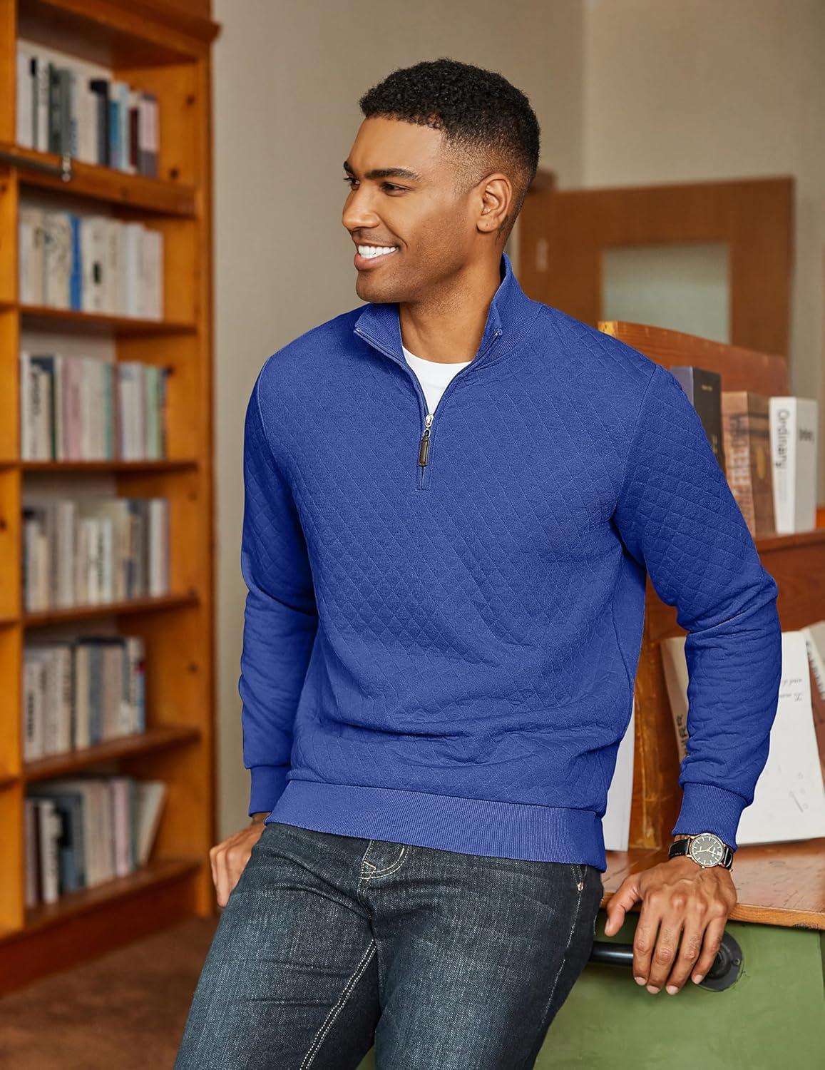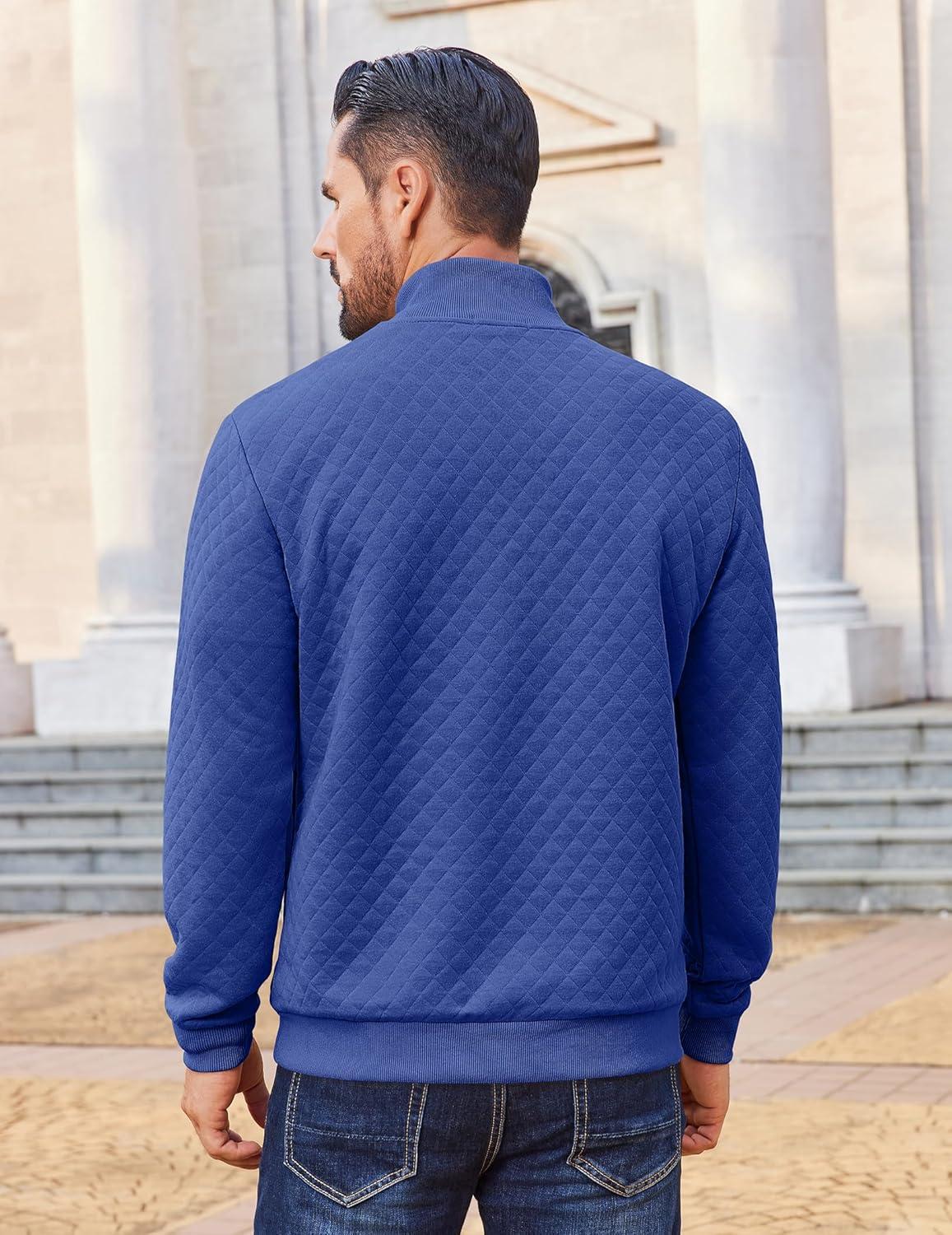 COOFANDY Men Quarter Zip Pullover Long Sleeve Quilted Sweatshirt Waffle Casual Collared Sweatshirts Mock Neck Winter Polo(Deep Blue)
