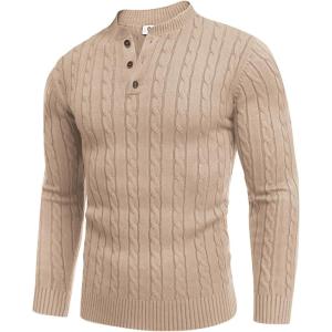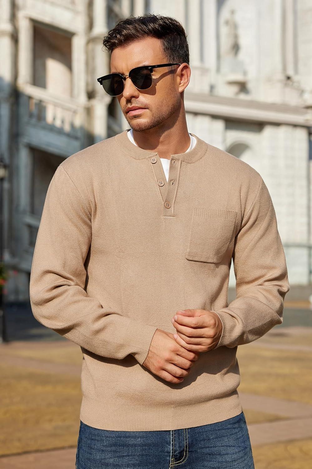 COOFANDY Men’s Henley Knit Sweater Long Sleeve Mid-Weight Soft Pullover Shirt with Chest Pocket(Light Khaki)
