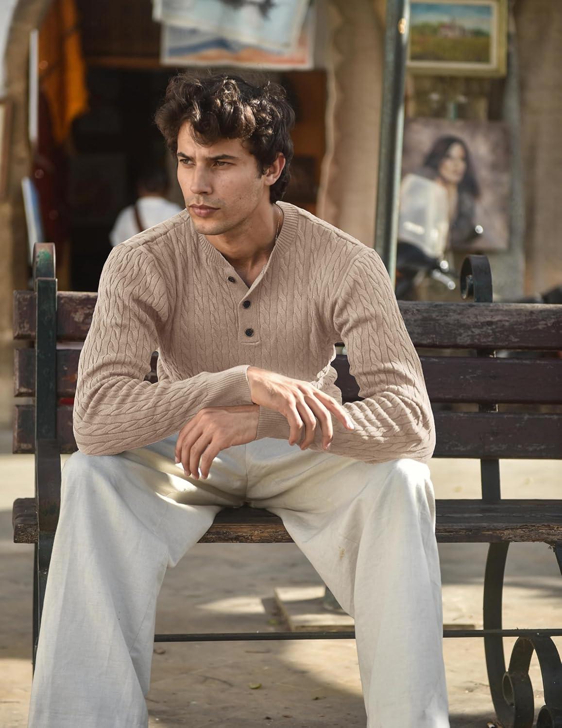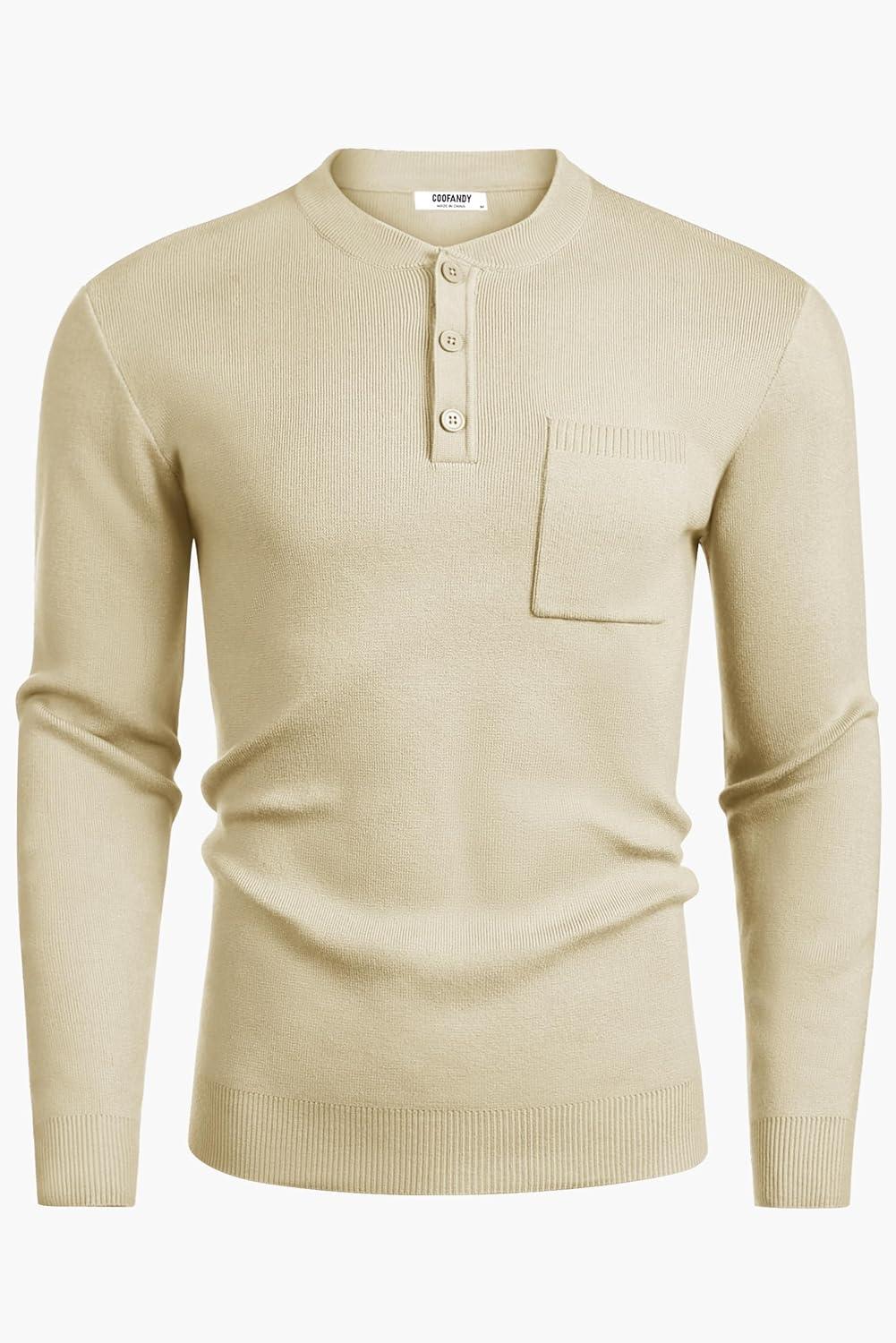 COOFANDY Men’s Henley Knit Sweater Long Sleeve Mid-Weight Soft Pullover Shirt with Chest Pocket(Beige)