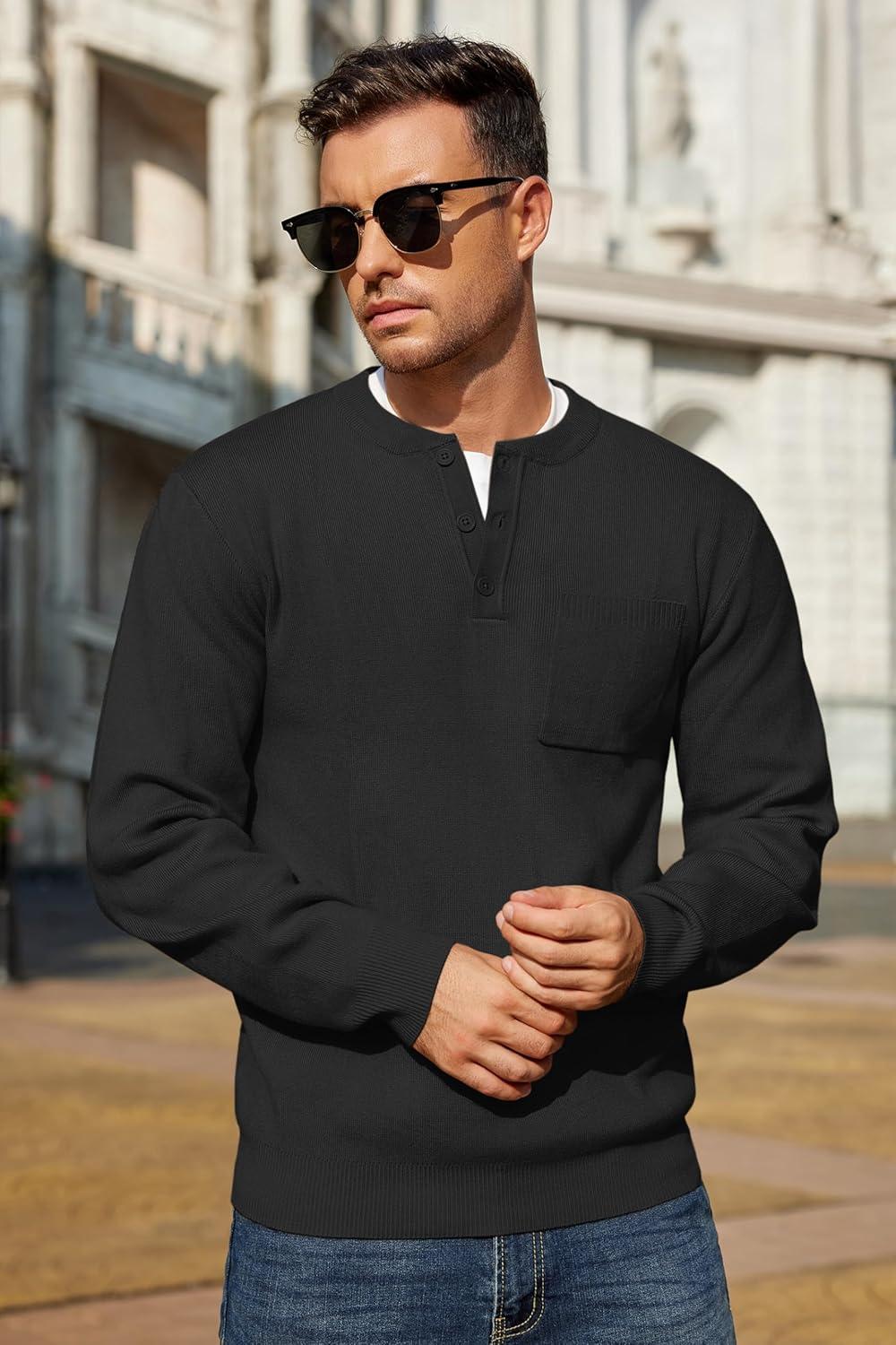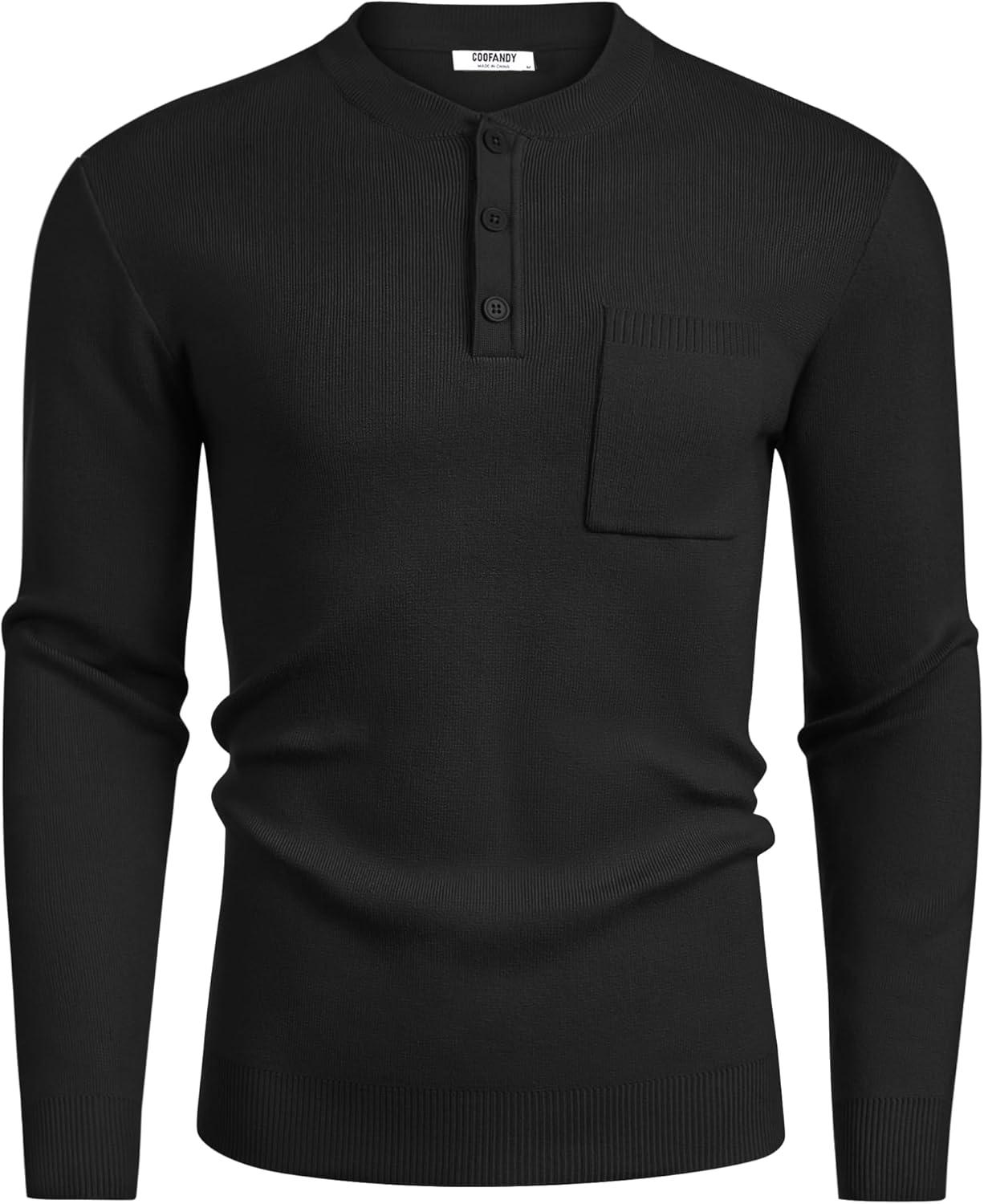 COOFANDY Men’s Henley Knit Sweater Long Sleeve Mid-Weight Soft Pullover Shirt with Chest Pocket(Black)