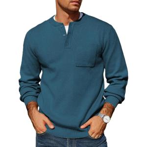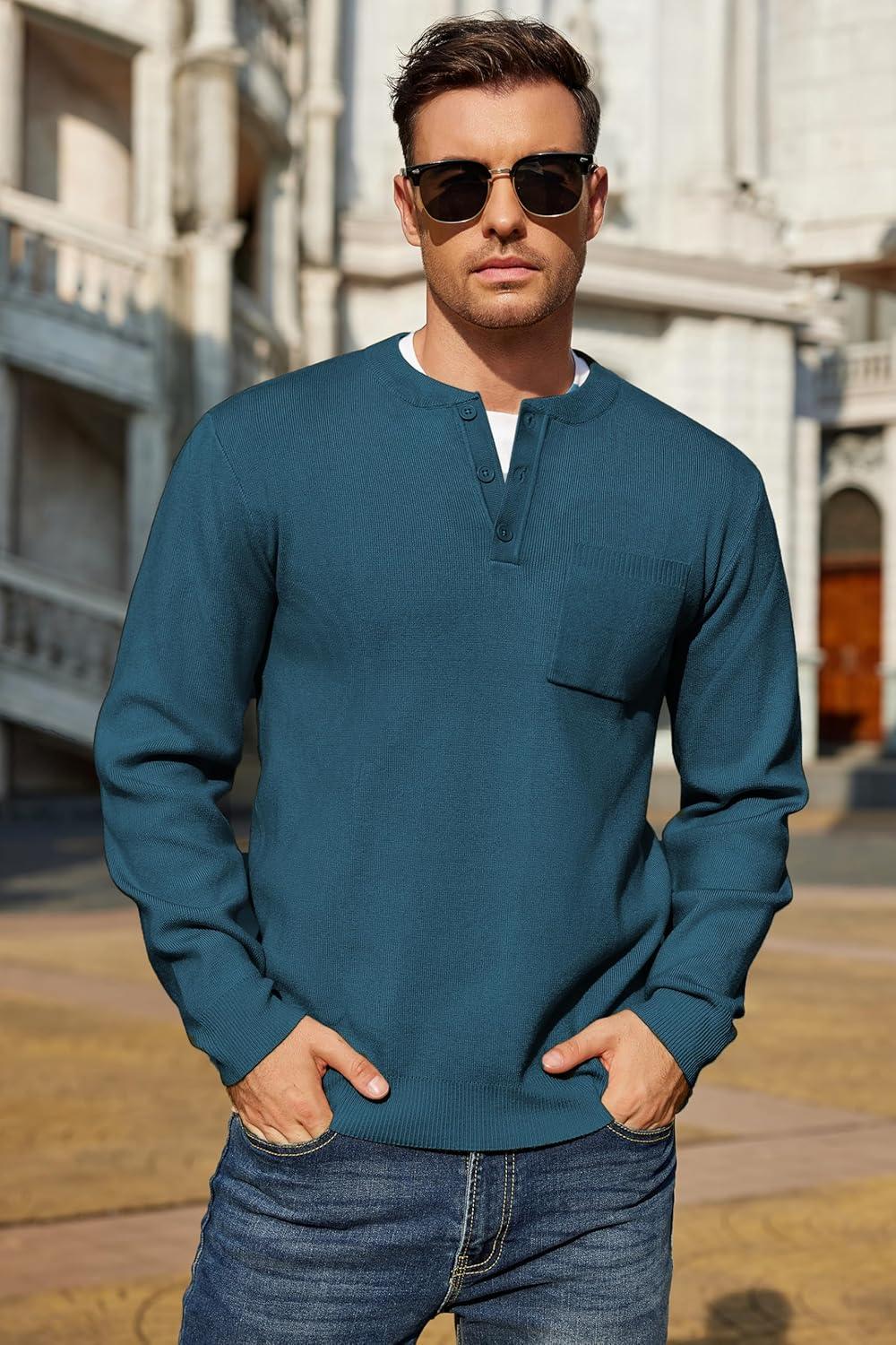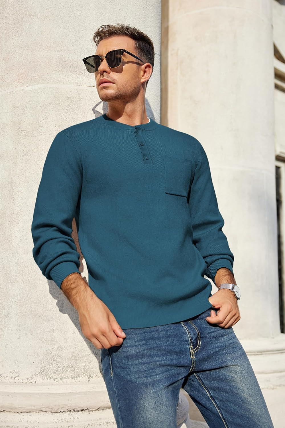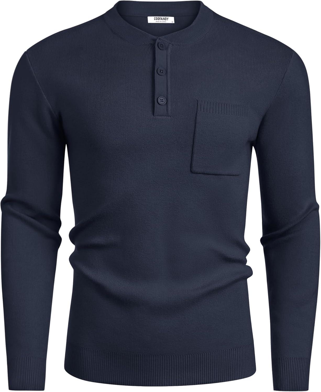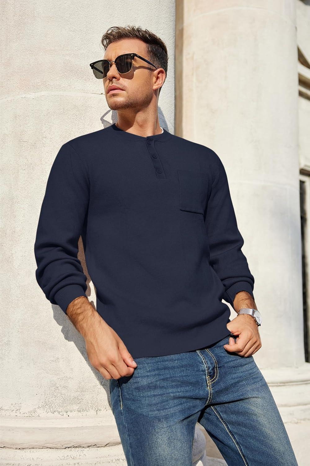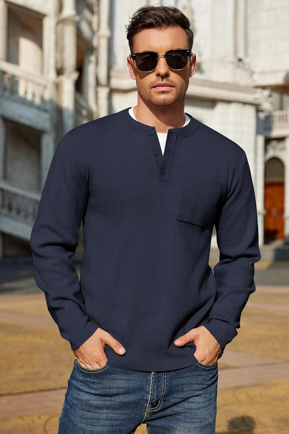 COOFANDY Men’s Henley Knit Sweater Long Sleeve Mid-Weight Soft Pullover Shirt with Chest Pocket(Deep Blue)