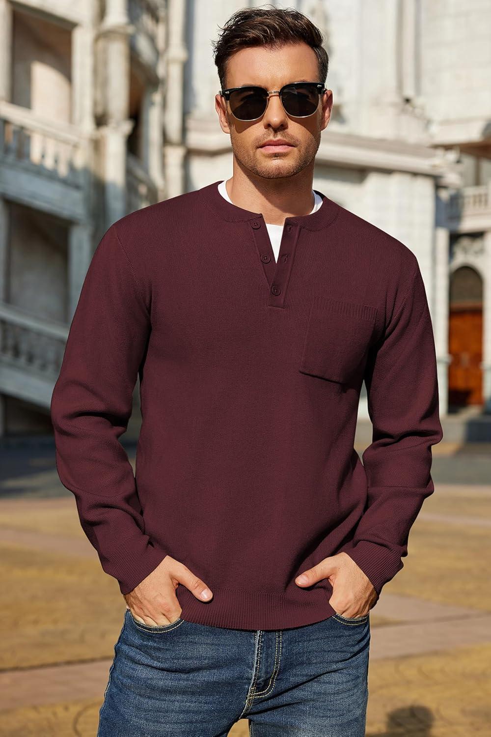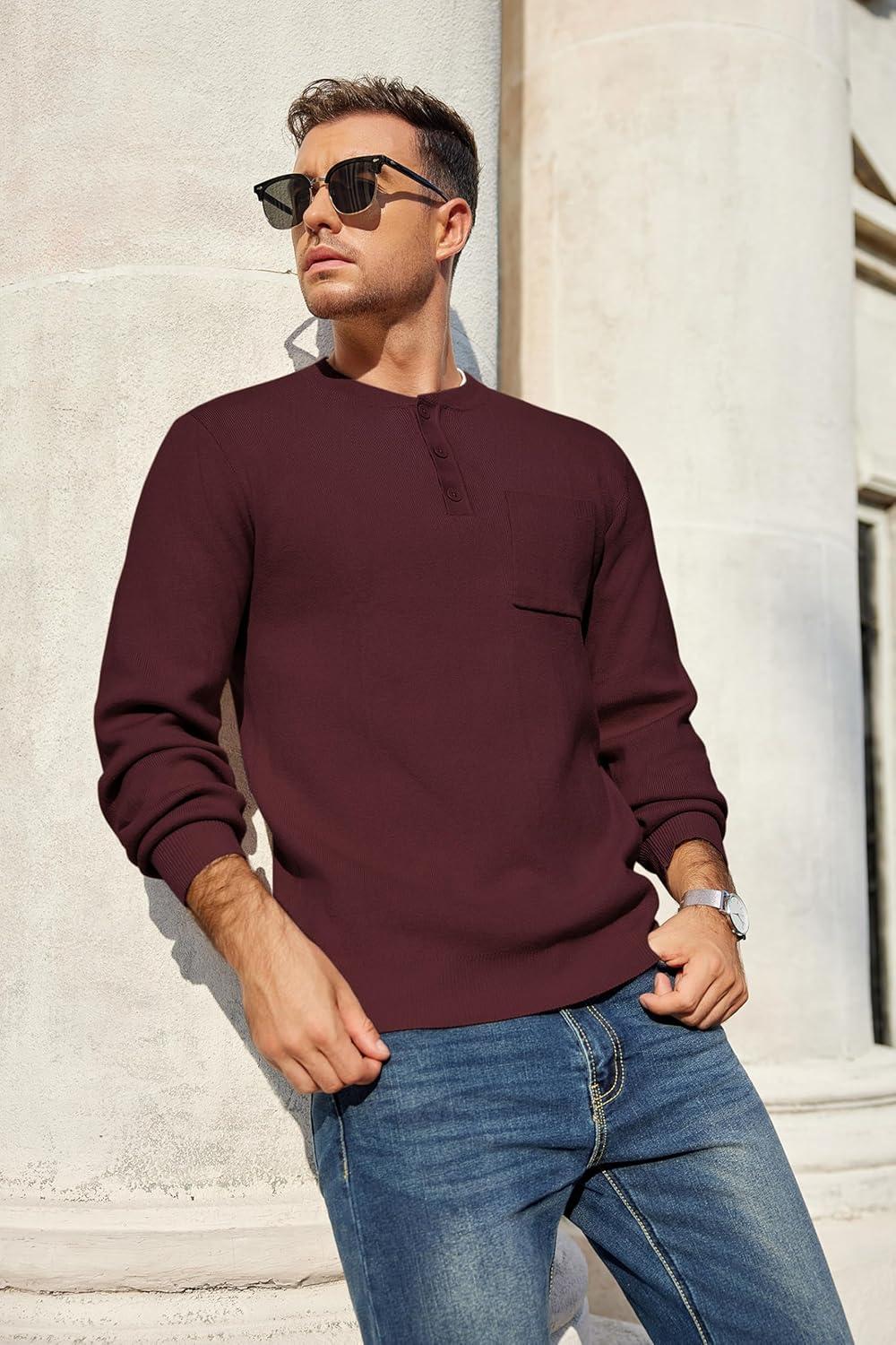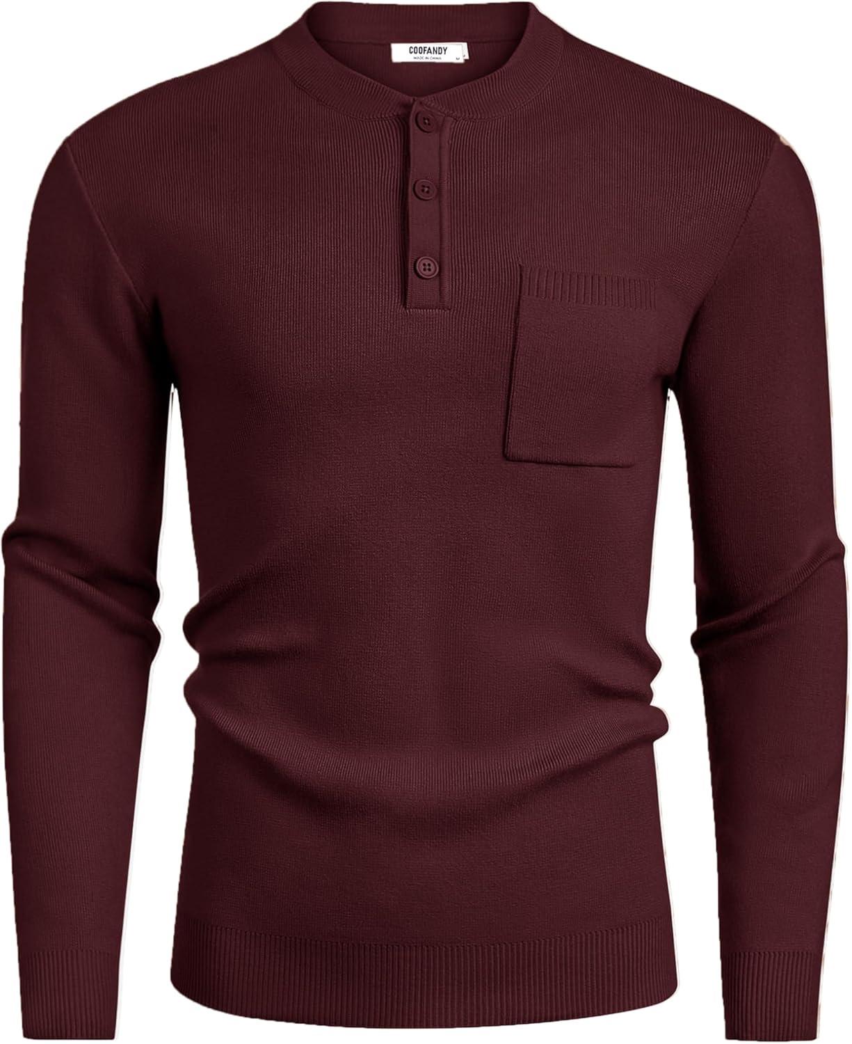 COOFANDY Men’s Henley Knit Sweater Long Sleeve Mid-Weight Soft Pullover Shirt with Chest Pocket(Deep Red)