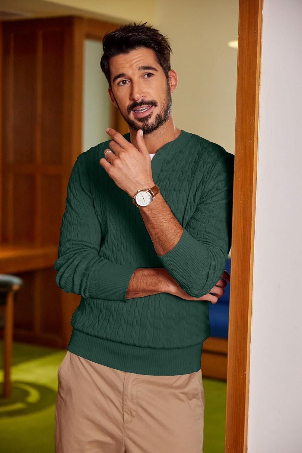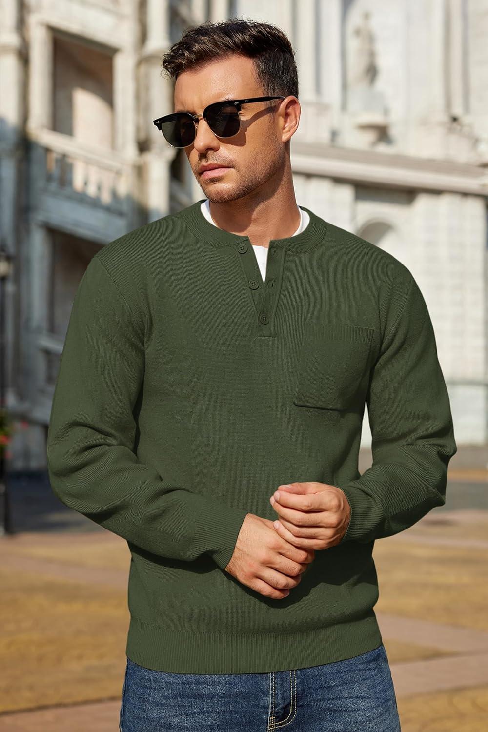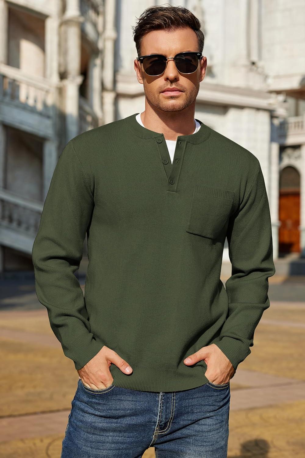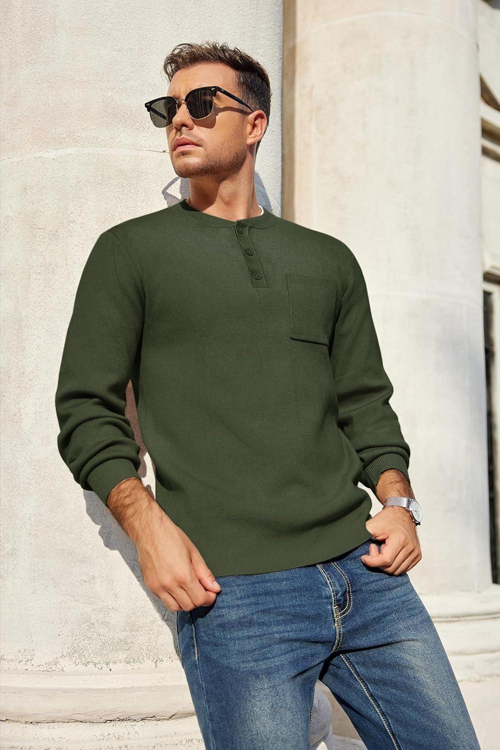 COOFANDY Men’s Henley Knit Sweater Long Sleeve Mid-Weight Soft Pullover Shirt with Chest Pocket(Olive Green)