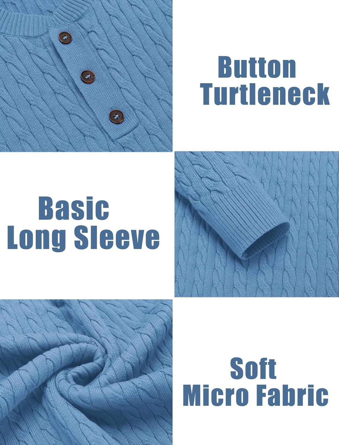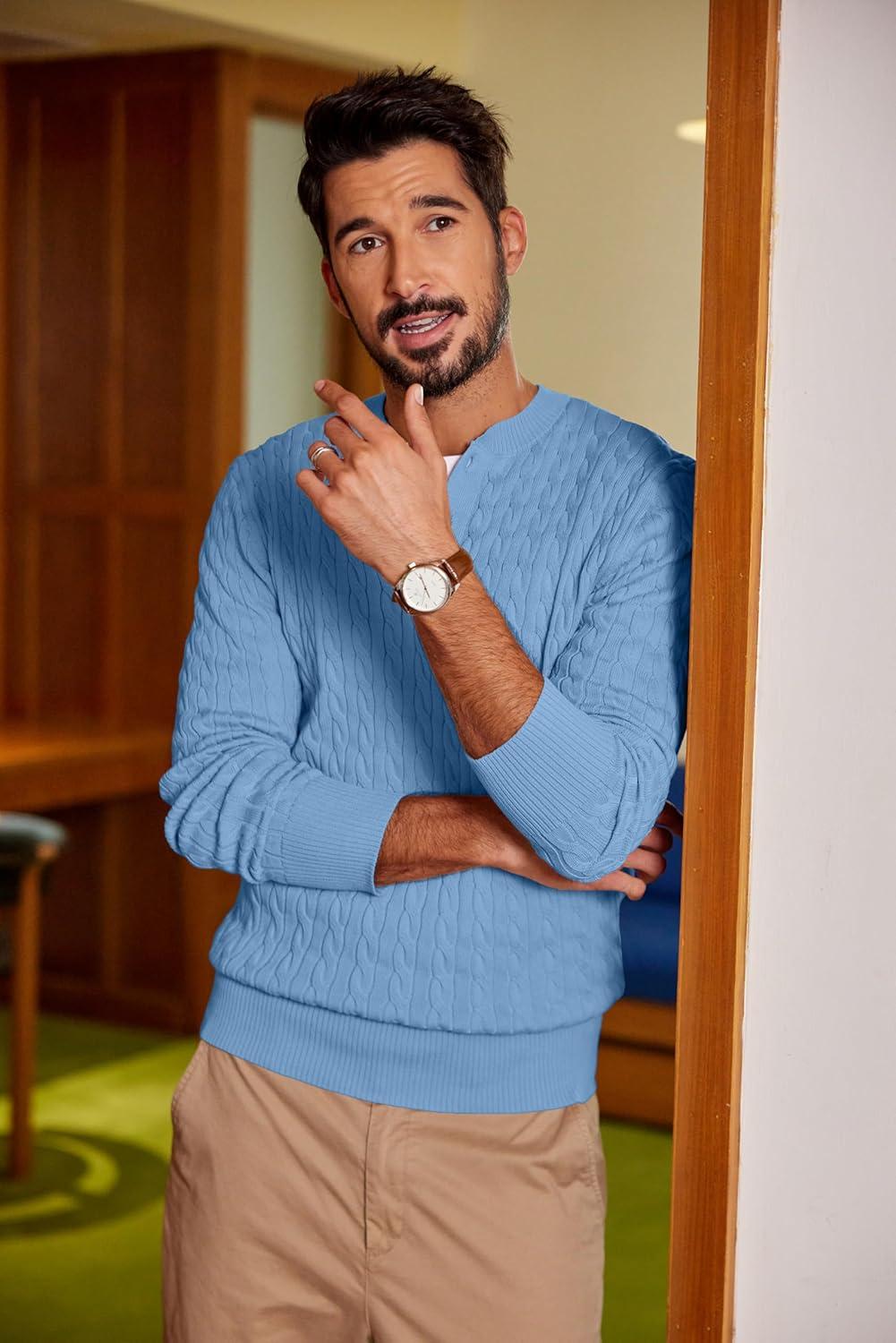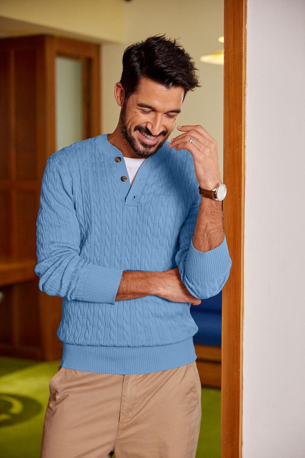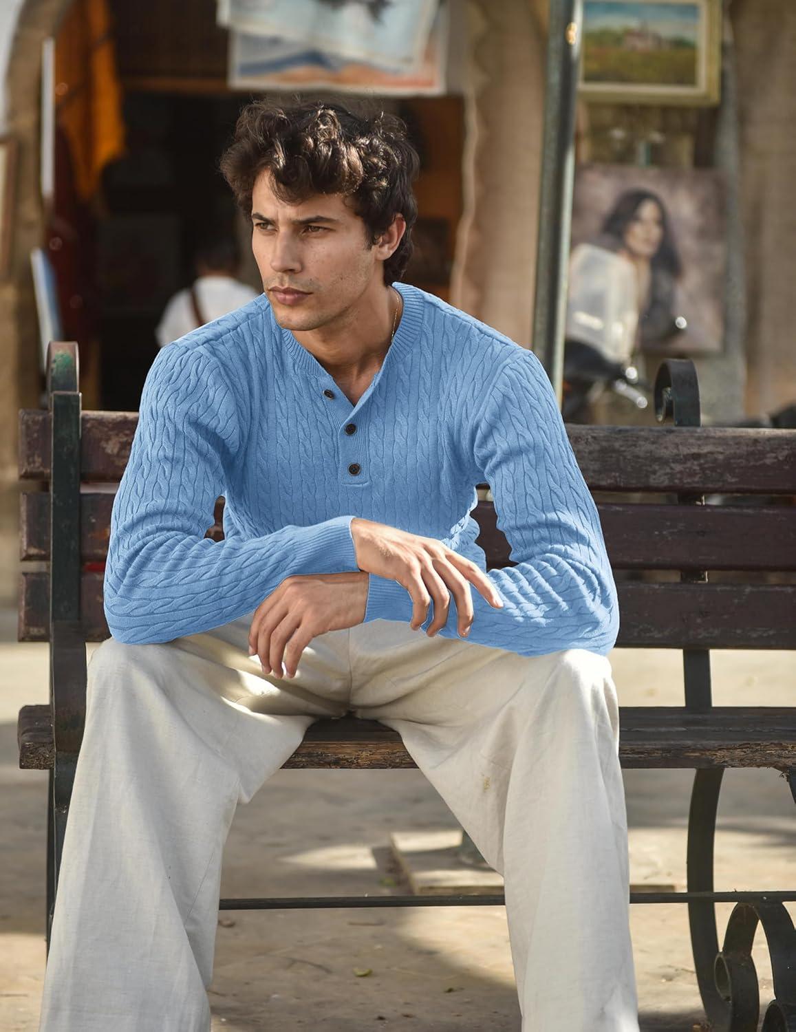 COOFANDY Men’s Henley Knit Sweater Long Sleeve Mid-Weight Soft Pullover Shirt with Chest Pocket(Light Blue)