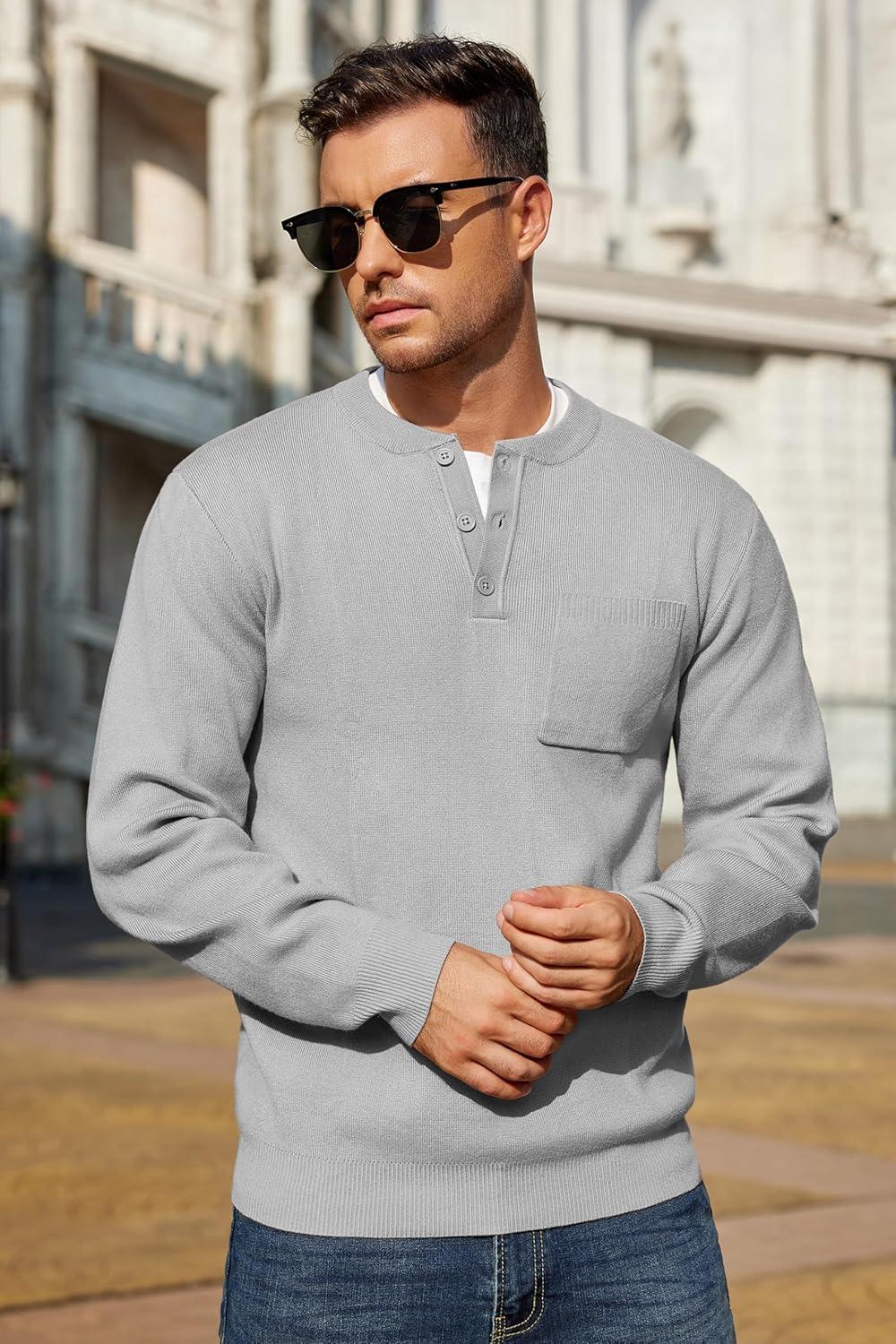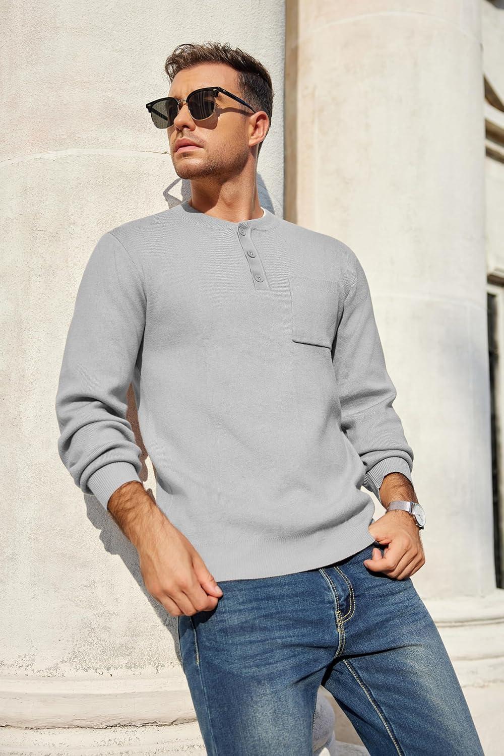 COOFANDY Men’s Henley Knit Sweater Long Sleeve Mid-Weight Soft Pullover Shirt with Chest Pocket(Light Grey)