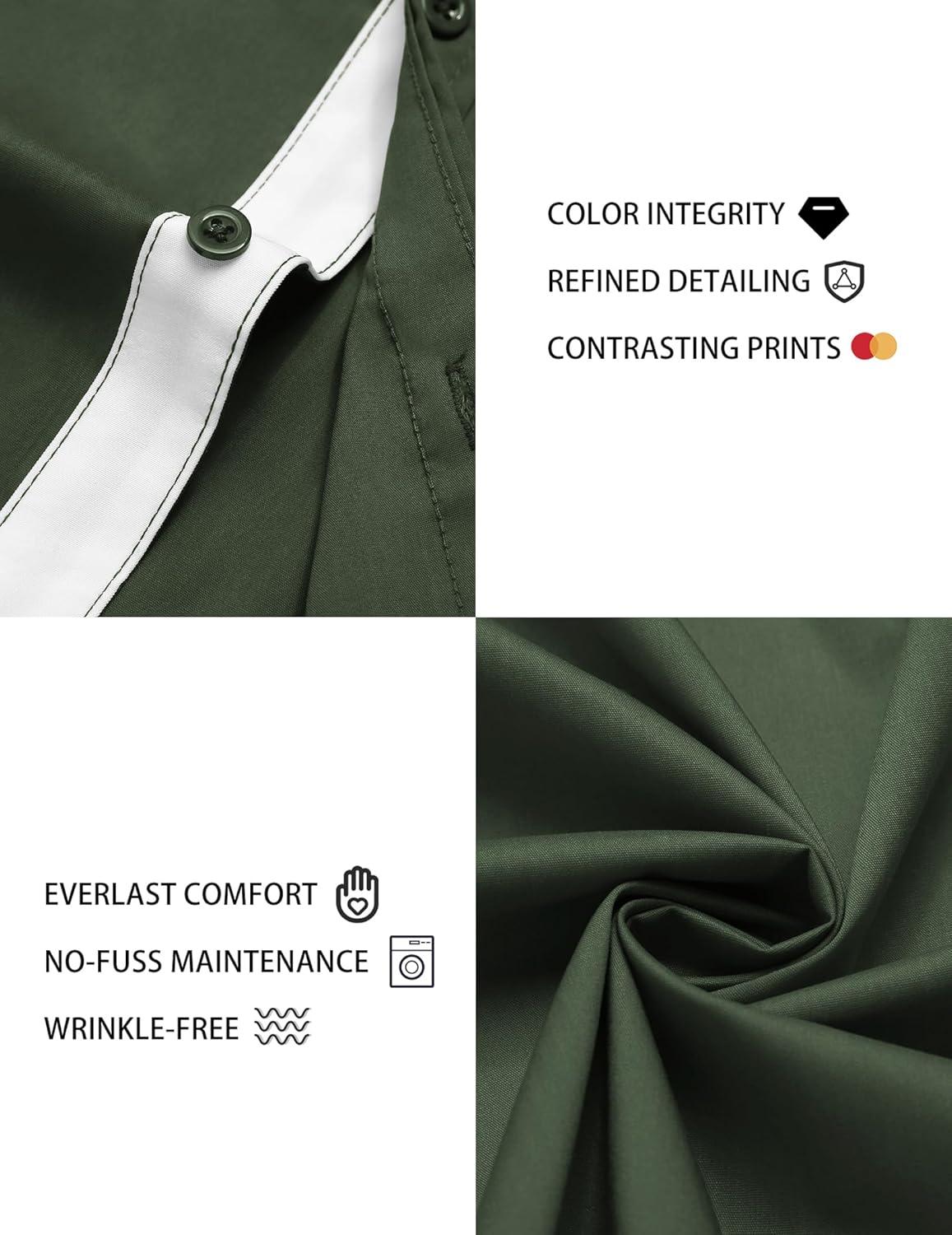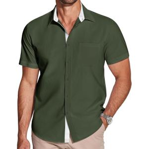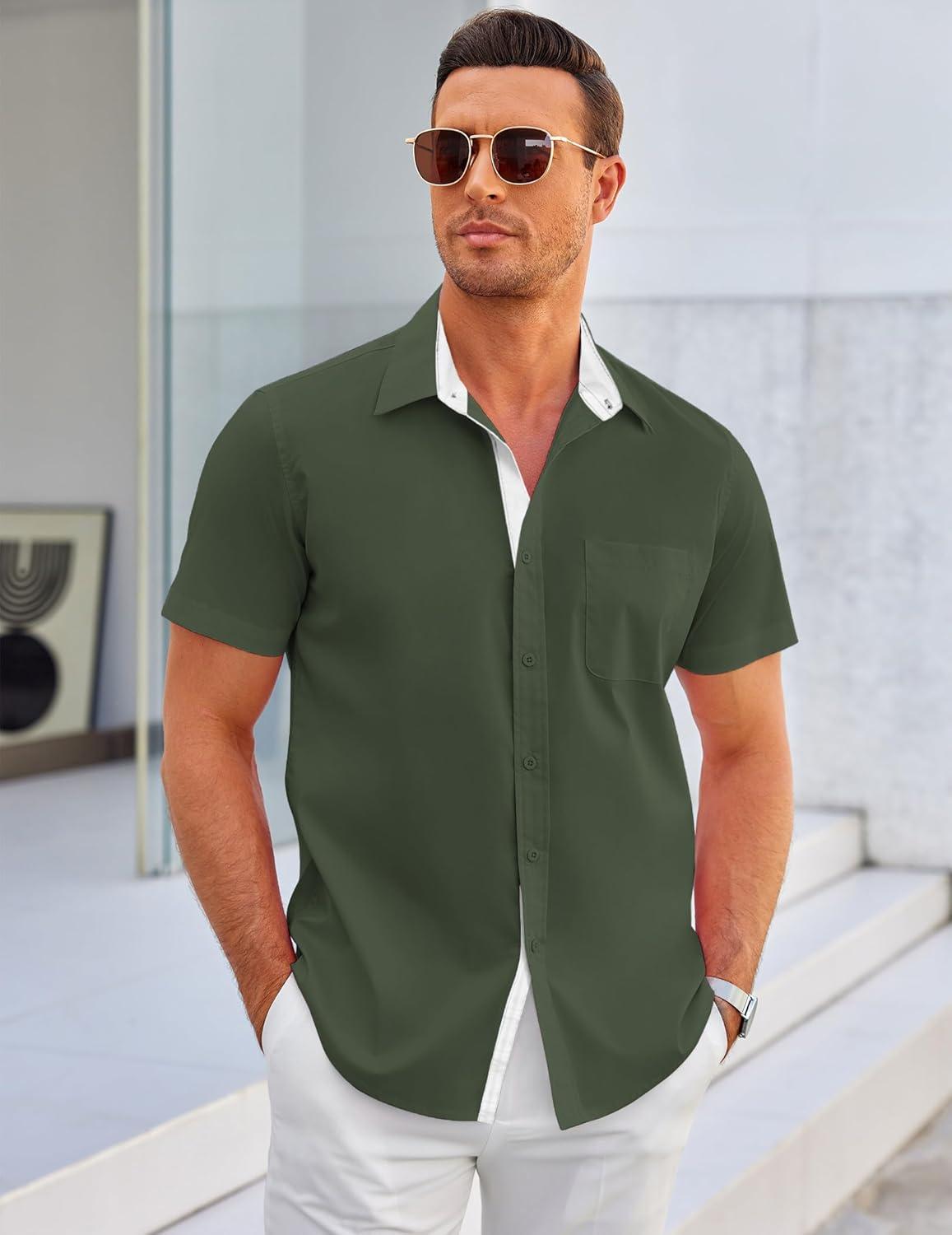 COOFANDY Men’s Muscle Fit Dress Shirts Wrinkle-Free Short Sleeve Casual Button Down Shirt(Army Green-white)