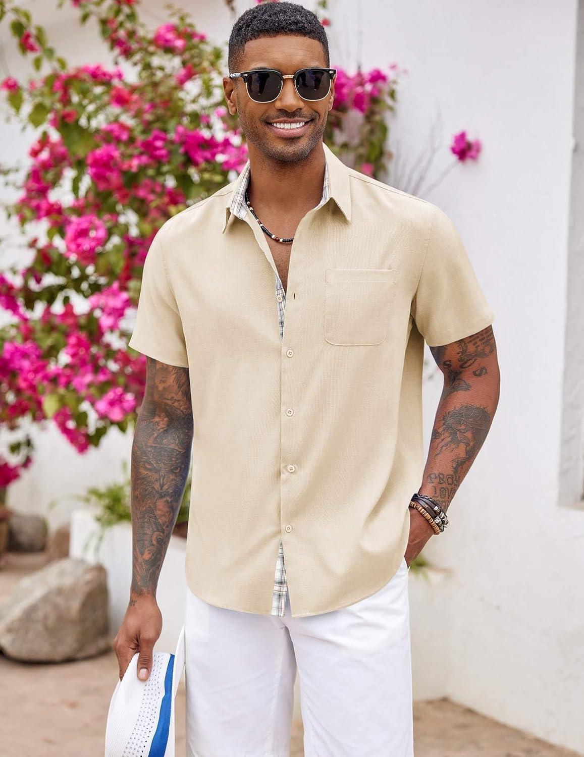 COOFANDY Men’s Muscle Fit Dress Shirts Wrinkle-Free Short Sleeve Casual Button Down Shirt(Beige)