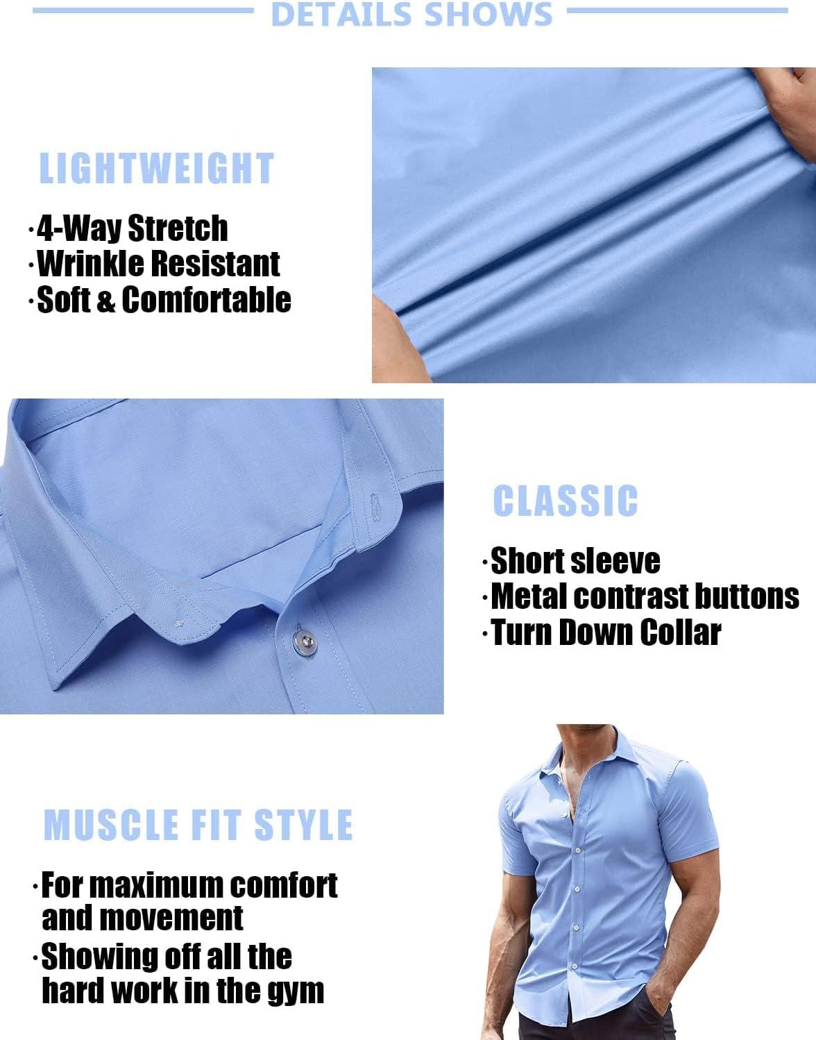 COOFANDY Men’s Muscle Fit Dress Shirts Wrinkle-Free Short Sleeve Casual Button Down Shirt(Blue)