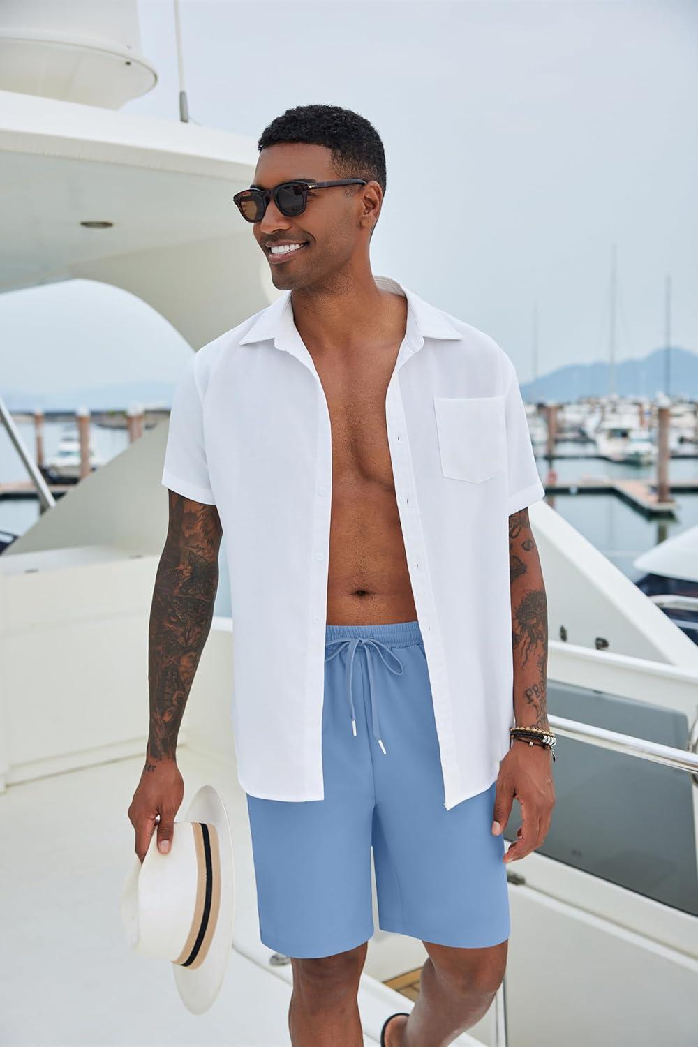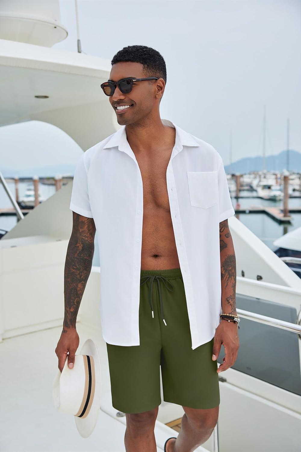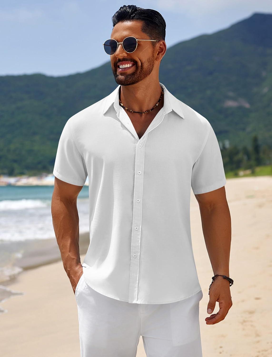 COOFANDY Mens Button Down Shirts Short Sleeve Casual Summer Beach Shirts for Men Vacation Wedding Linen Shirt(White)