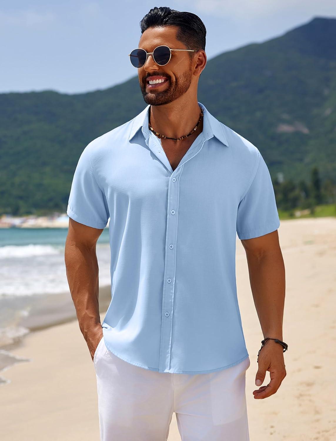 COOFANDY Mens Casual Beach Shirts Short Sleeve Button Down Shirts Summer Vacation Untucked Dress Shirts(Blue)