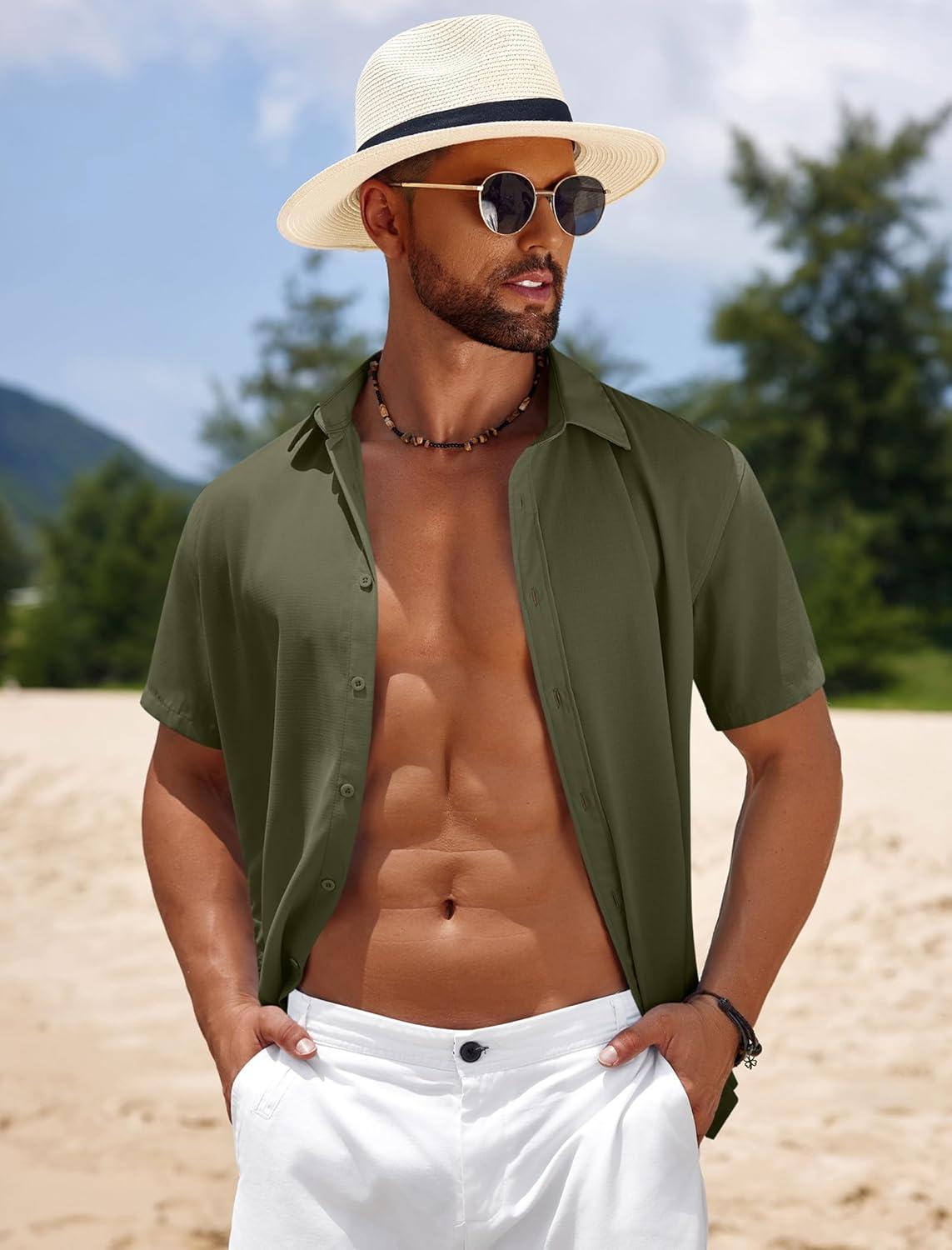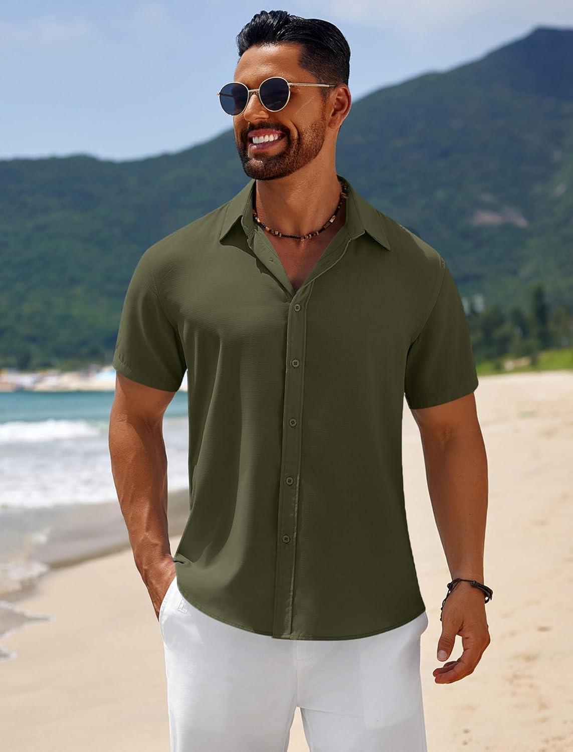 COOFANDY Mens Casual Beach Shirts Short Sleeve Button Down Shirts Summer Vacation Untucked Dress Shirts(Dark Army Green)