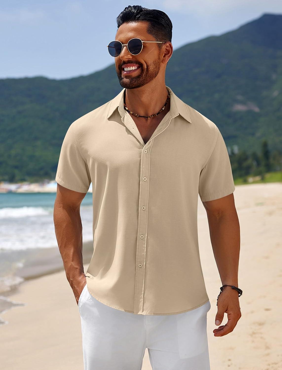 COOFANDY Mens Casual Beach Shirts Short Sleeve Button Down Shirts Summer Vacation Untucked Dress Shirts(Beige)