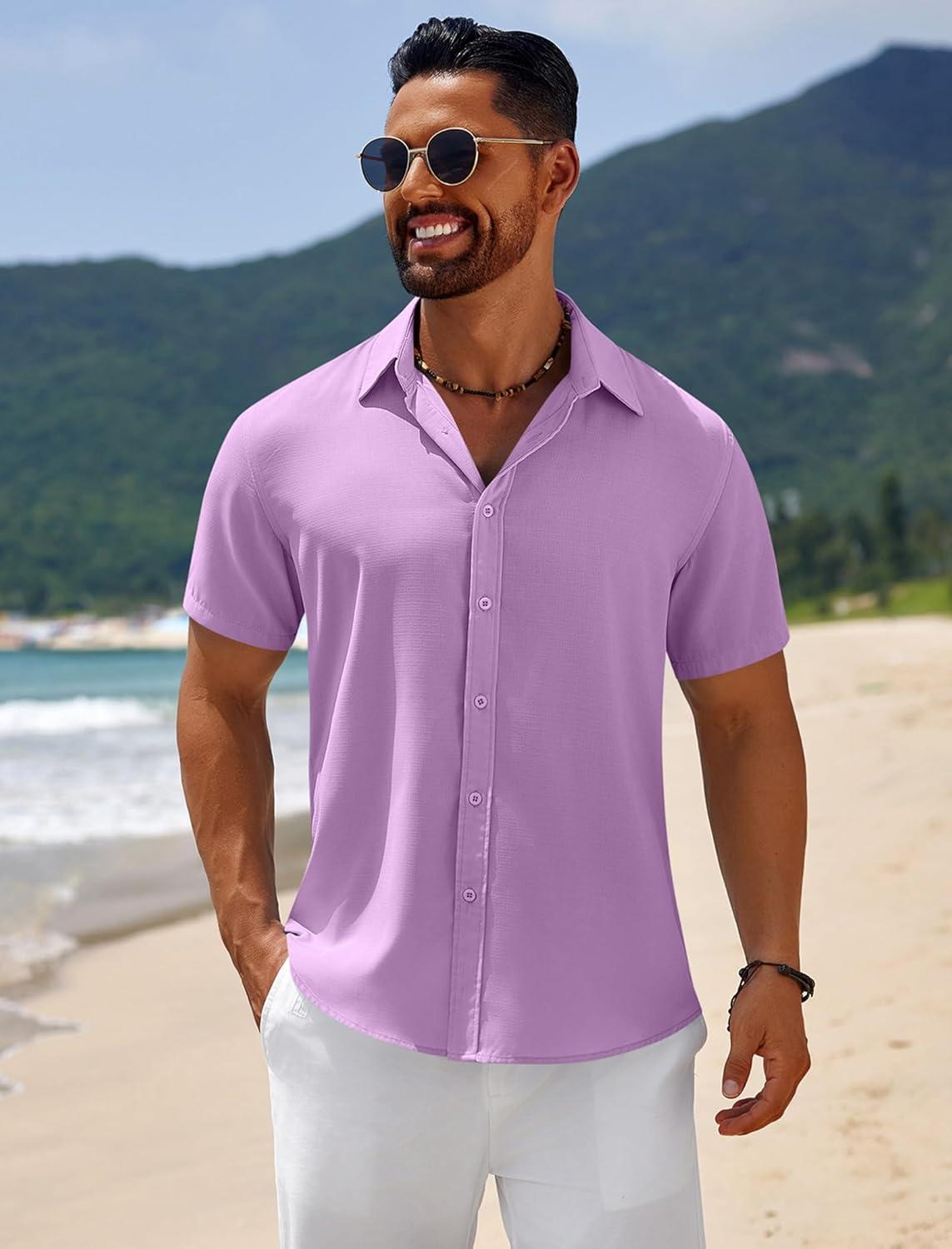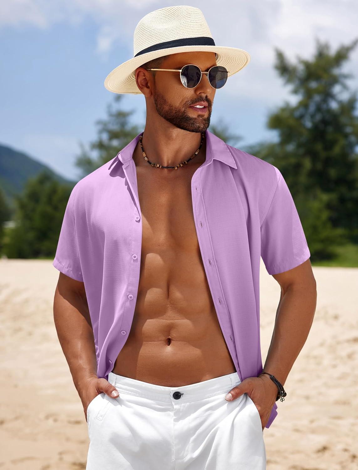 COOFANDY Mens Casual Beach Shirts Short Sleeve Button Down Shirts Summer Vacation Untucked Dress Shirts(Lavender)