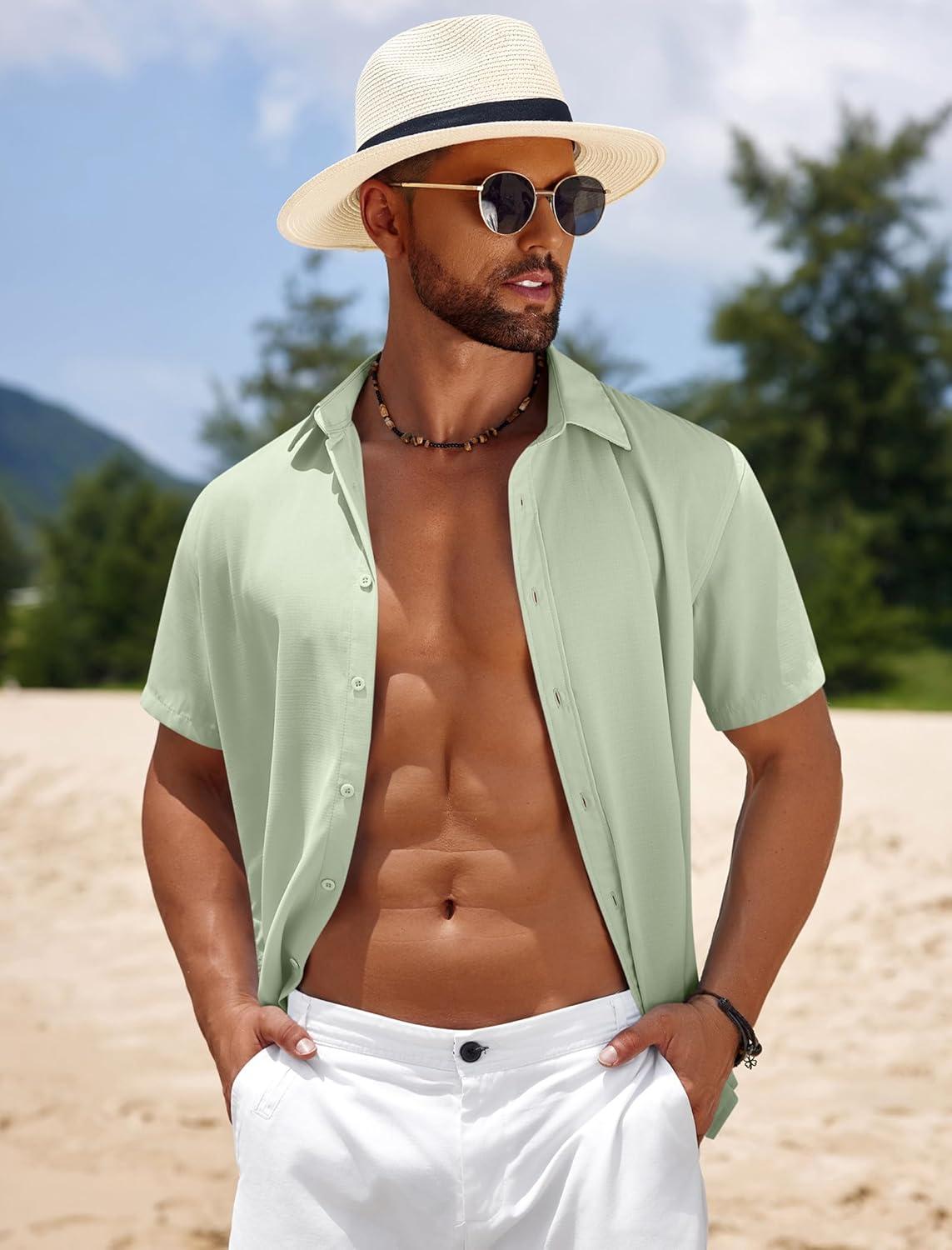 COOFANDY Mens Casual Beach Shirts Short Sleeve Button Down Shirts Summer Vacation Untucked Dress Shirts(Light Green)
