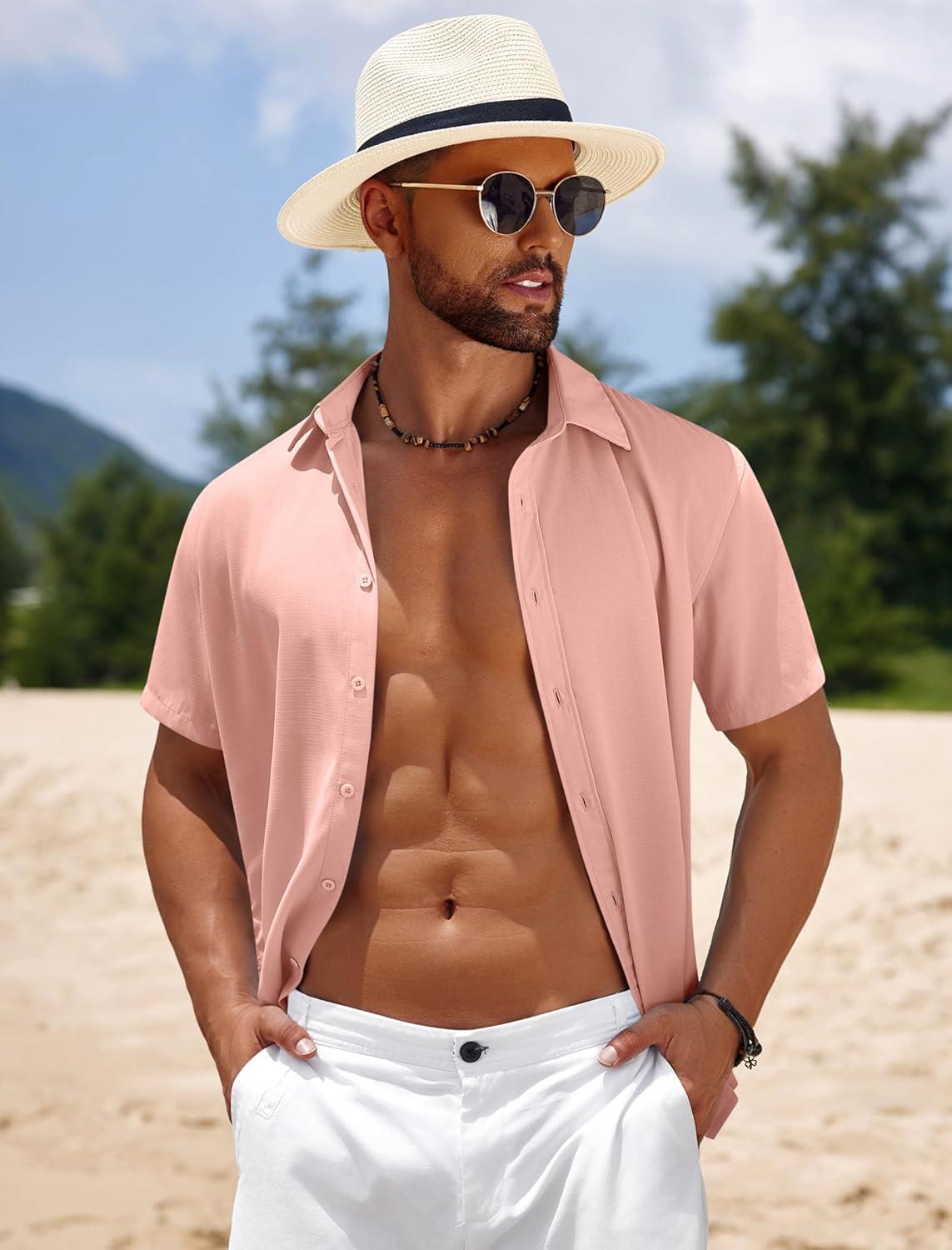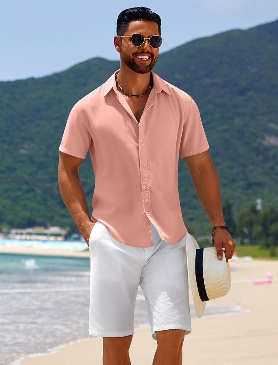 COOFANDY Mens Casual Beach Shirts Short Sleeve Button Down Shirts Summer Vacation Untucked Dress Shirts(Pink)