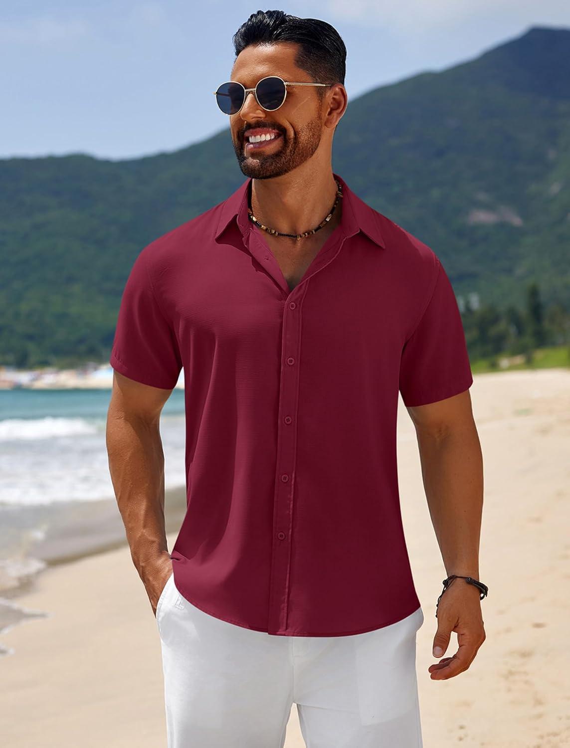 COOFANDY Mens Casual Beach Shirts Short Sleeve Button Down Shirts Summer Vacation Untucked Dress Shirts(Wine Red)