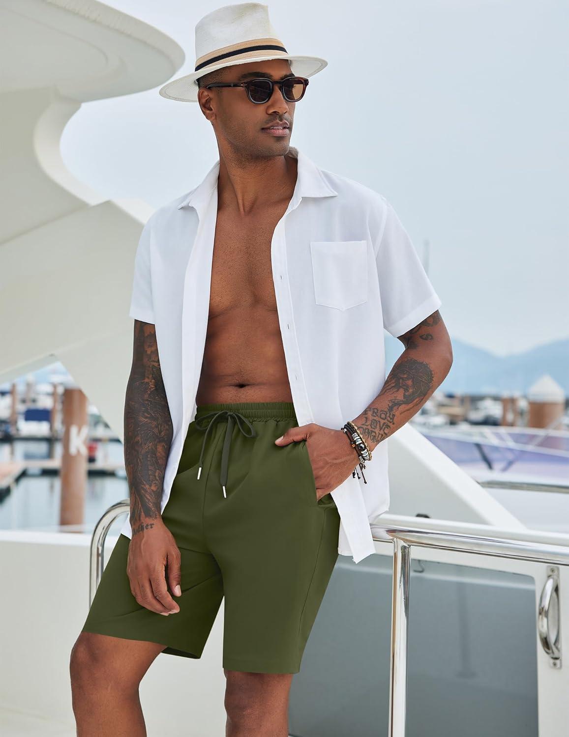 COOFANDY Mens Casual Beach Shorts Summer Elastic Waist Shorts Lightweight Drawstring Golf Shorts(Army Green)