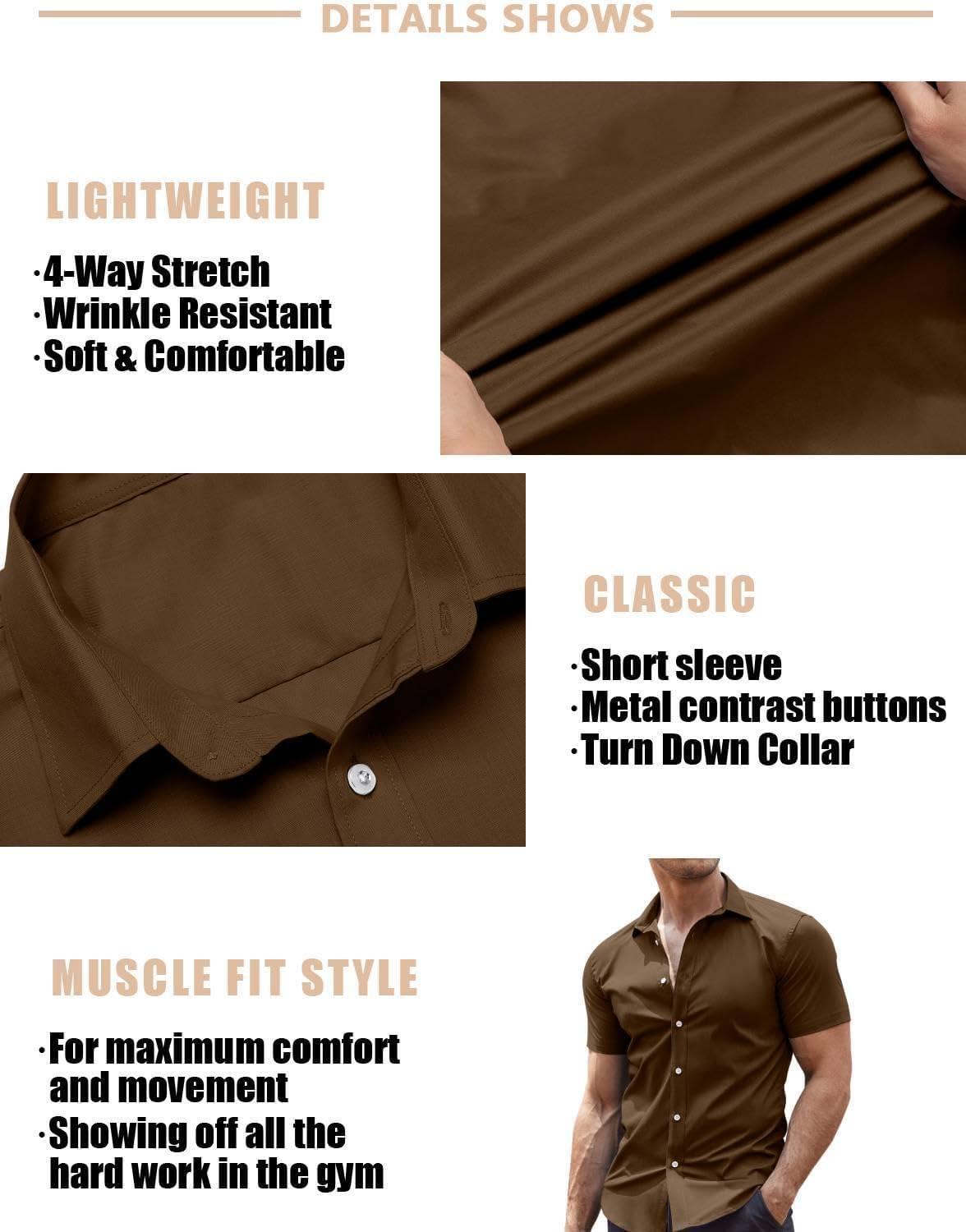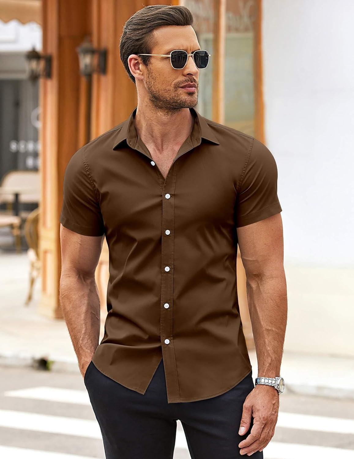 COOFANDY Men’s Muscle Fit Dress Shirts Wrinkle-Free Short Sleeve Casual Button Down Shirt(Brown)