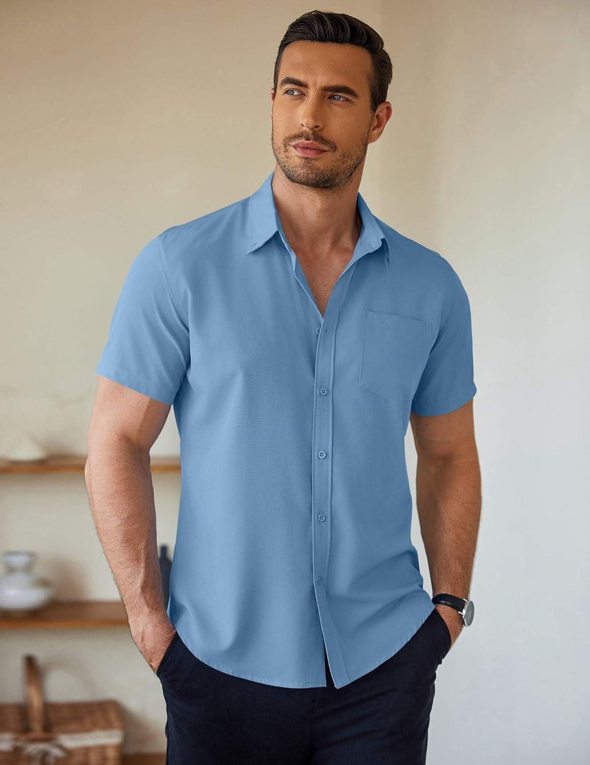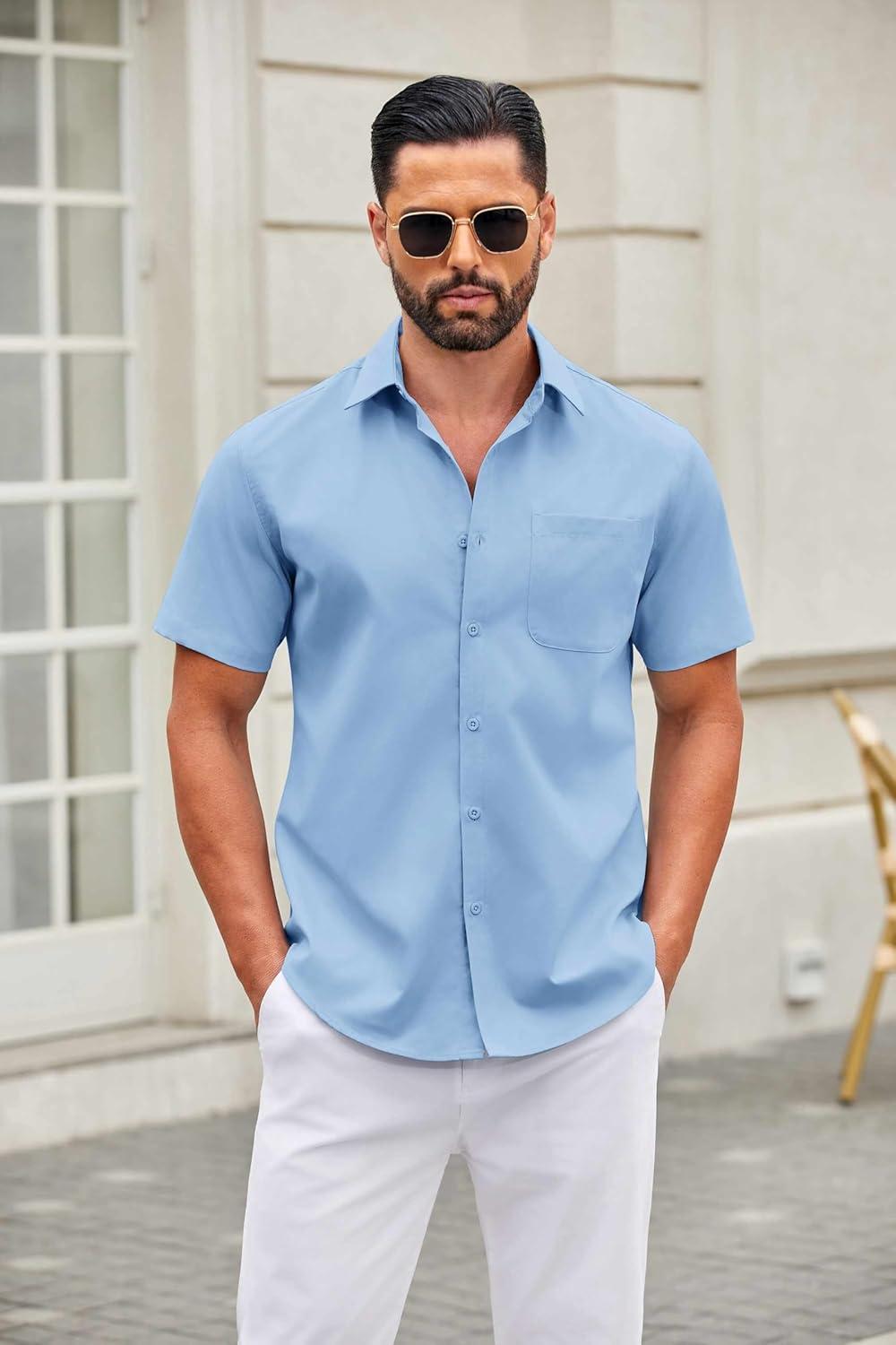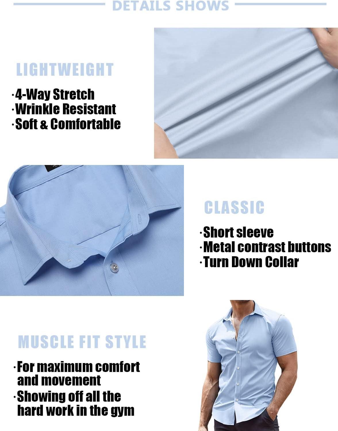 COOFANDY Men’s Muscle Fit Dress Shirts Wrinkle-Free Short Sleeve Casual Button Down Shirt(Light Blue)