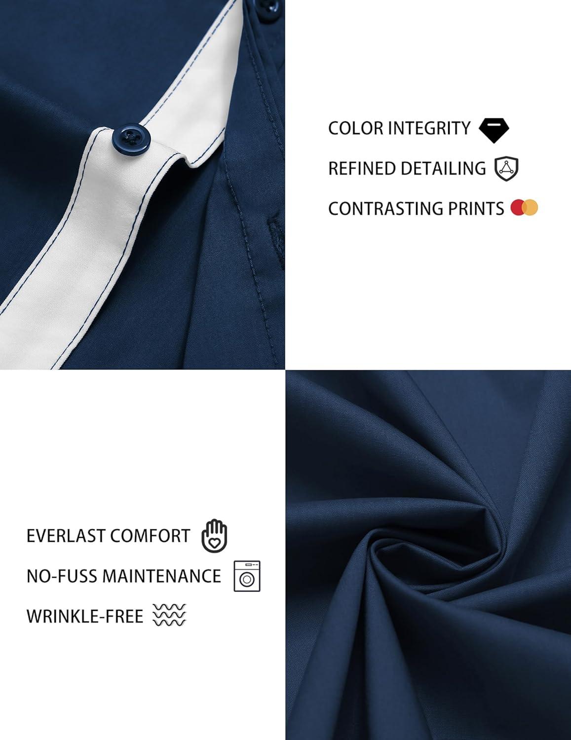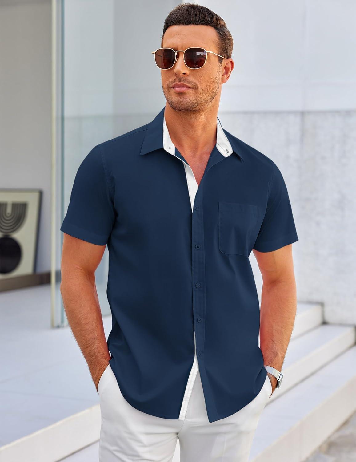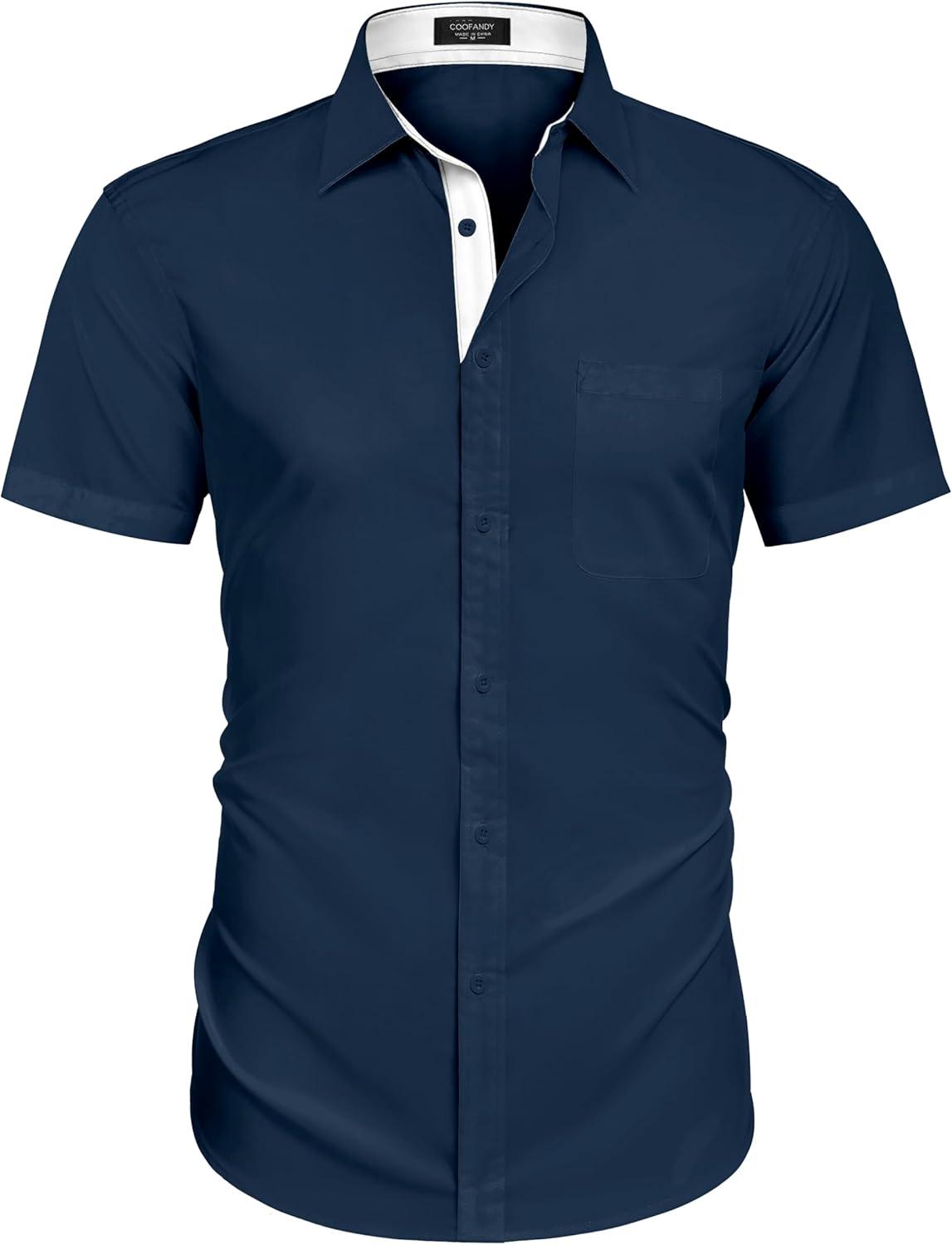COOFANDY Men’s Muscle Fit Dress Shirts Wrinkle-Free Short Sleeve Casual Button Down Shirt(Dark Blue-white)
