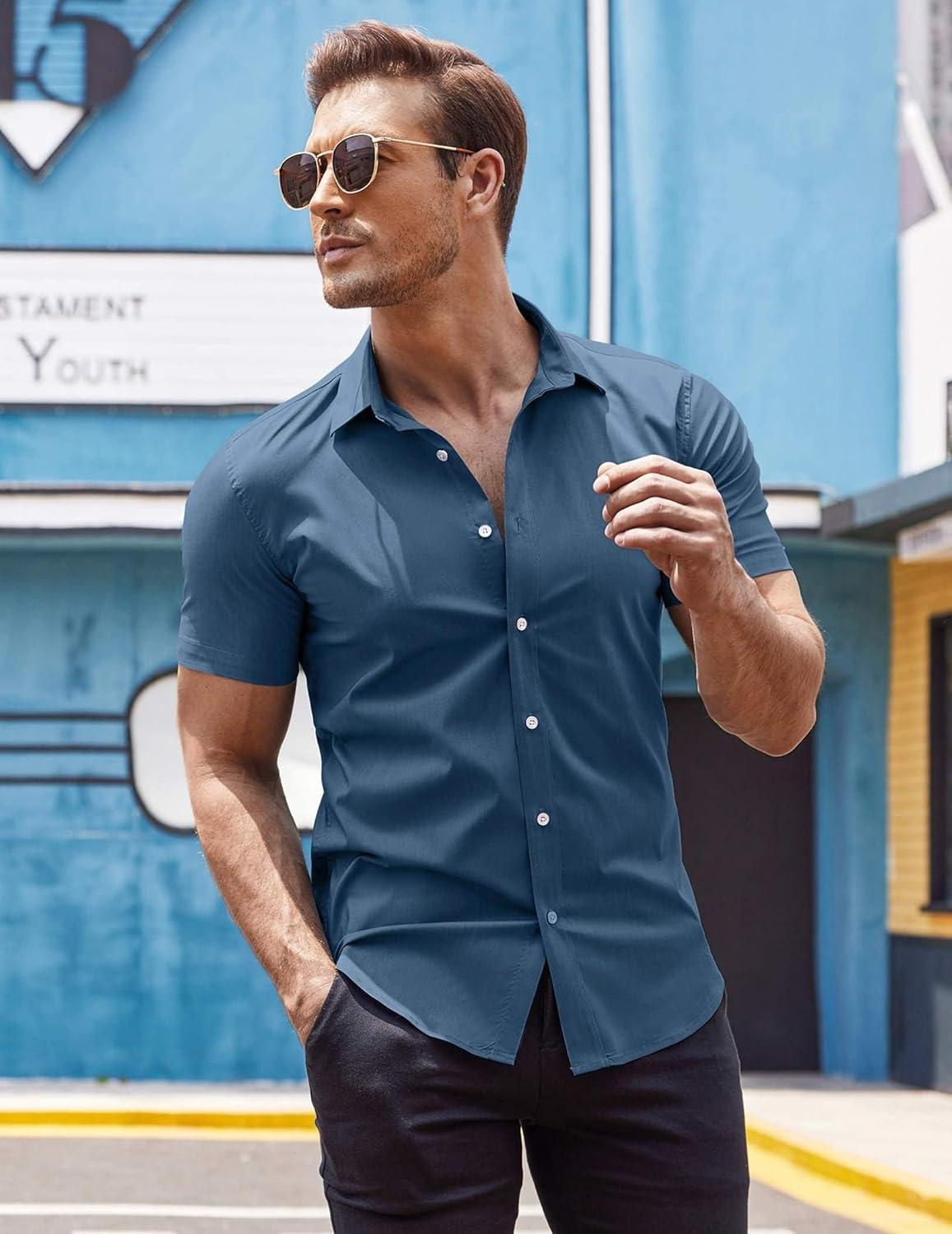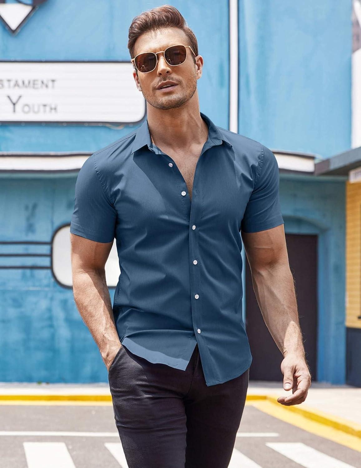 COOFANDY Men’s Muscle Fit Dress Shirts Wrinkle-Free Short Sleeve Casual Button Down Shirt(Captain’s Blue)