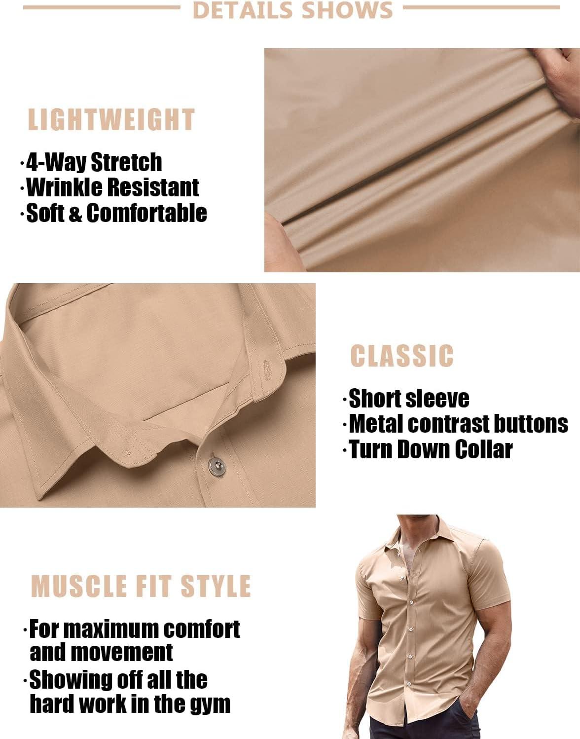 COOFANDY Men’s Muscle Fit Dress Shirts Wrinkle-Free Short Sleeve Casual Button Down Shirt(Khaki)