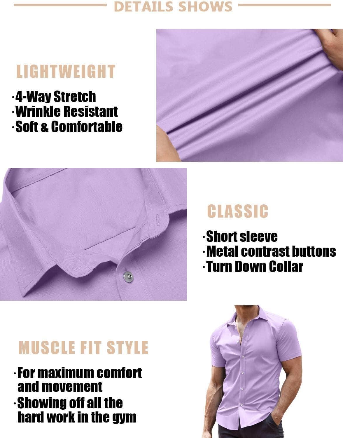 COOFANDY Men’s Muscle Fit Dress Shirts Wrinkle-Free Short Sleeve Casual Button Down Shirt(Lavender)