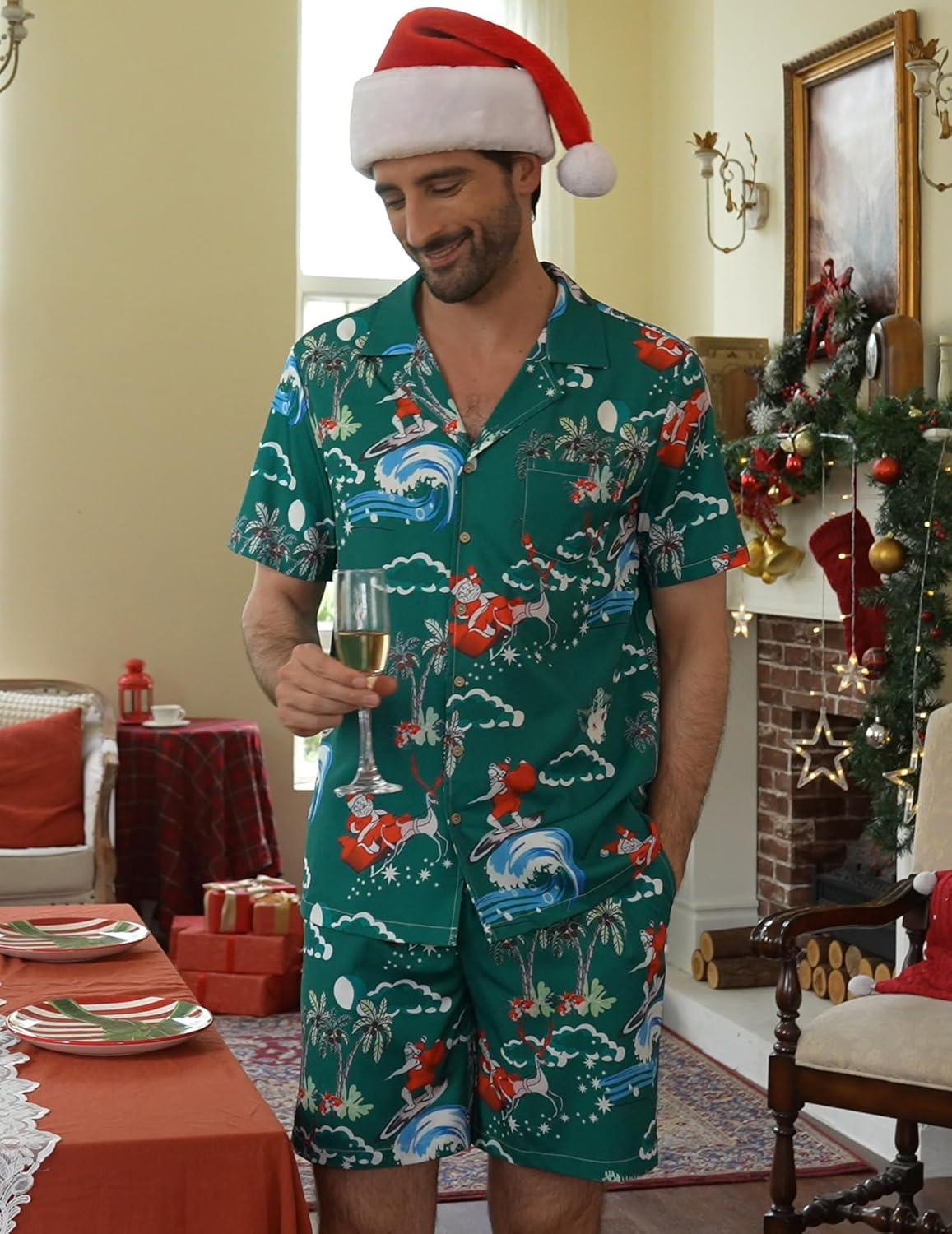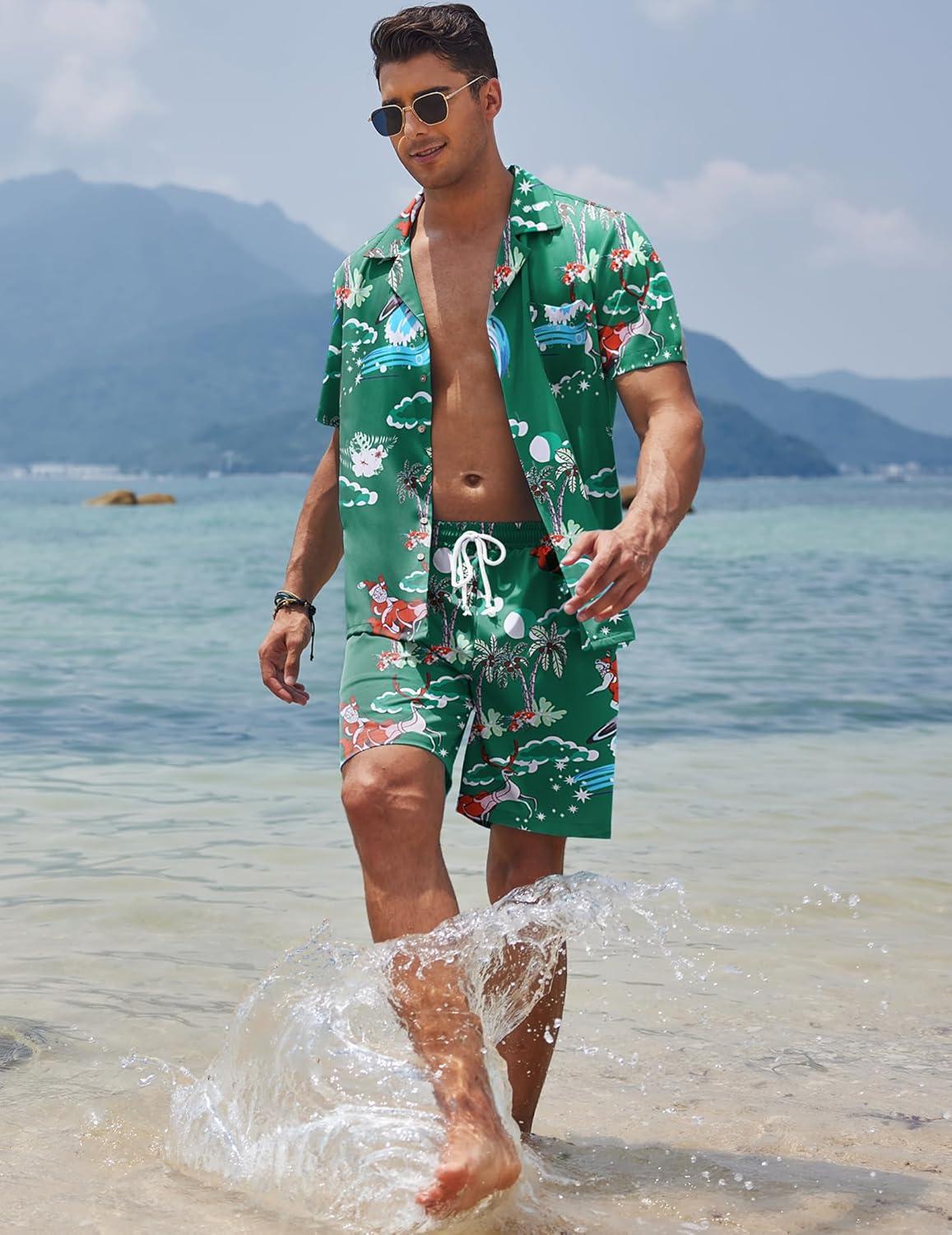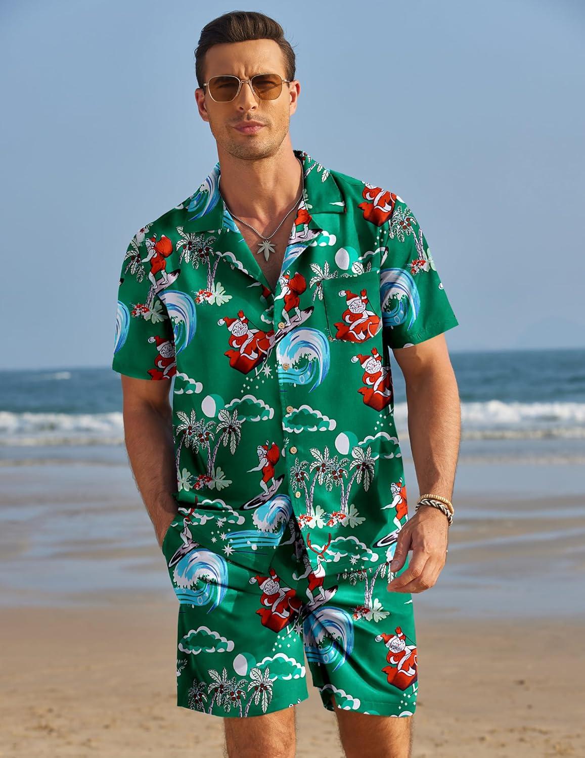 COOFANDY Mens Hawaiian Shirt and Shorts Set 2 Piece Vacation Outfits Floral Button Down Shirt(Green Santa)