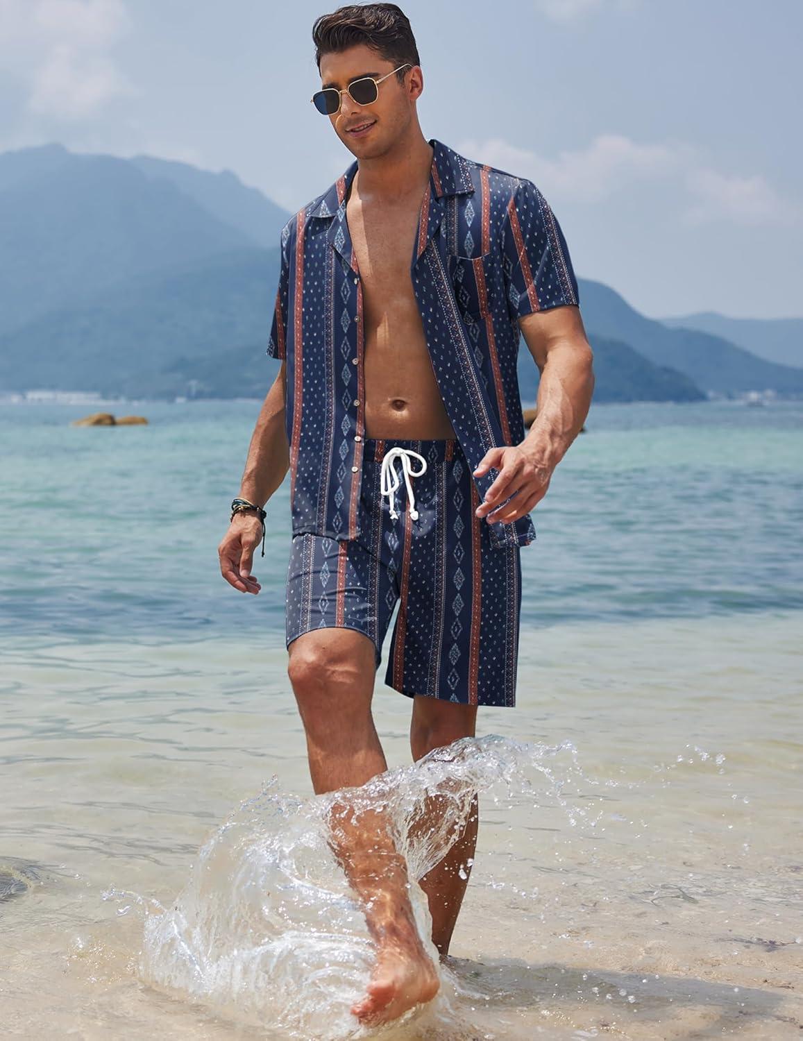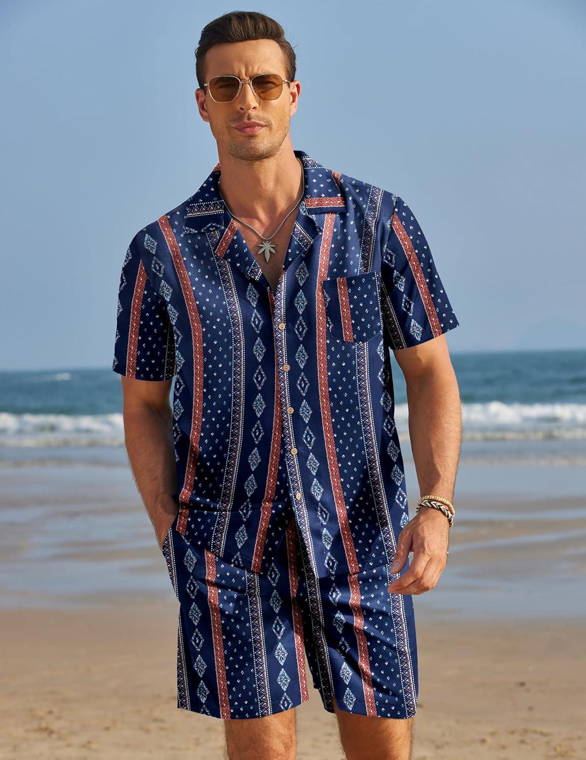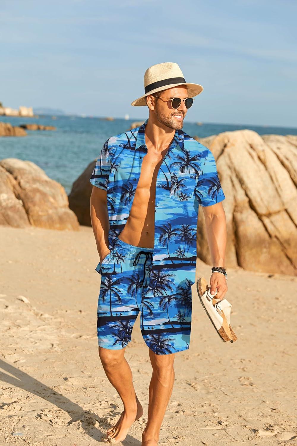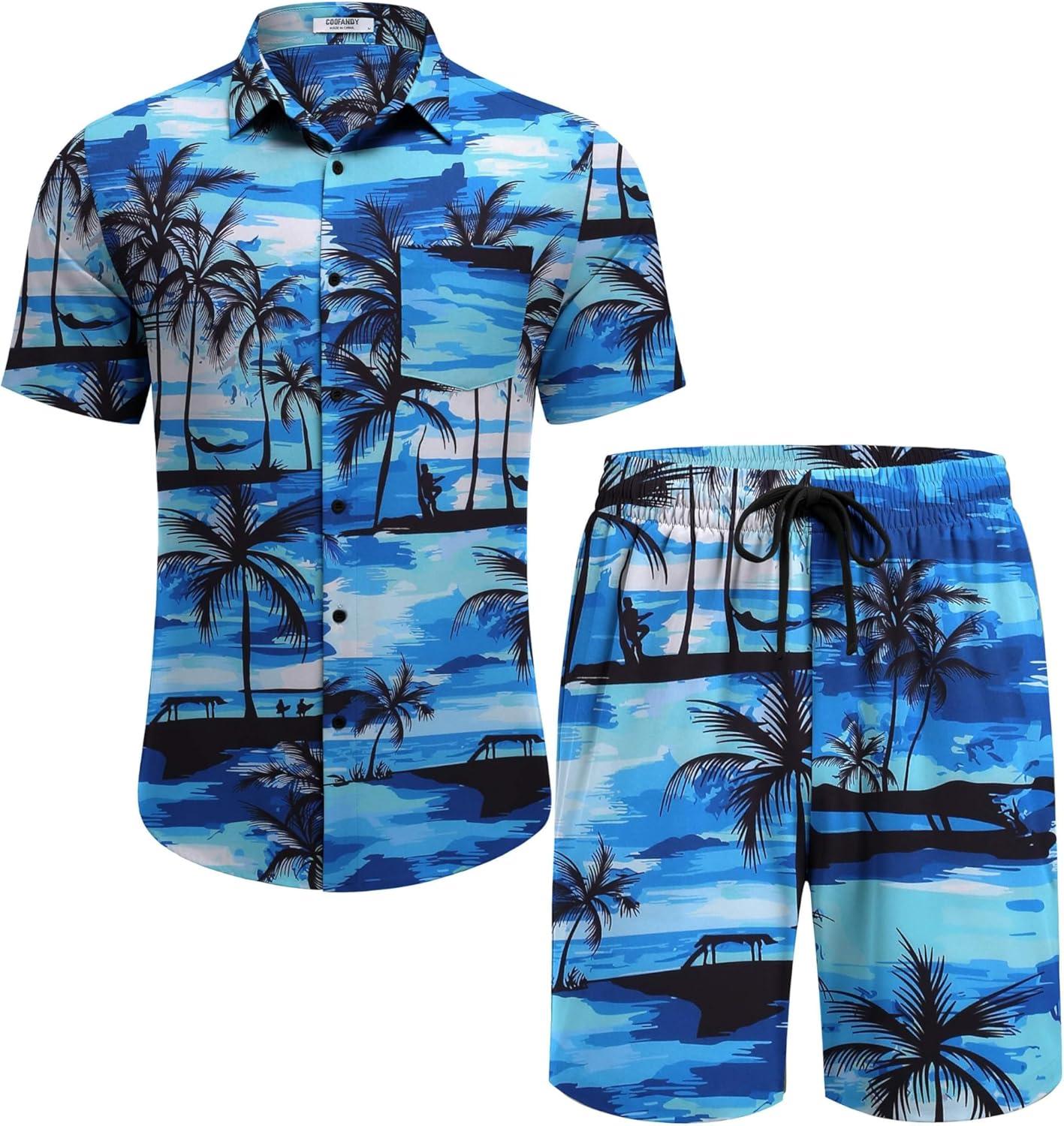 COOFANDY Mens Hawaiian Shirt and Shorts Set 2 Piece Vacation Outfits Floral Button Down Shirt(Island Blue)
