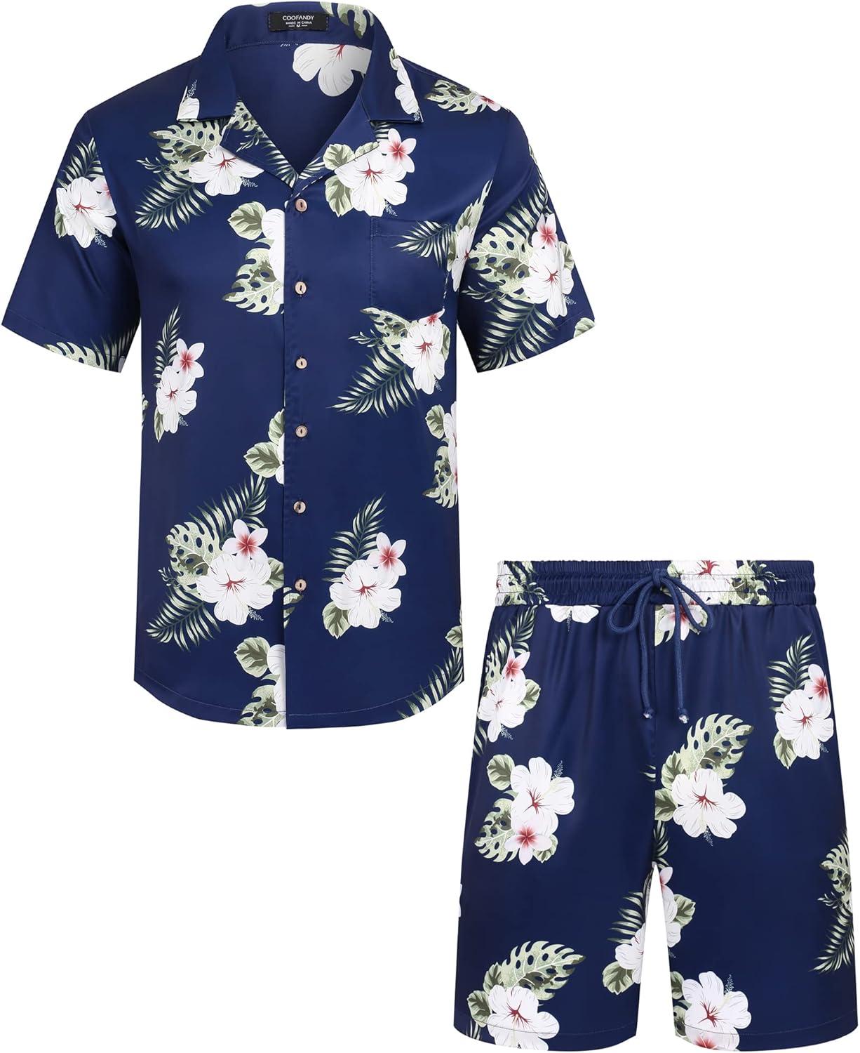 COOFANDY Mens Hawaiian Shirt and Shorts Set 2 Piece Vacation Outfits Floral Button Down Shirt(Navy)