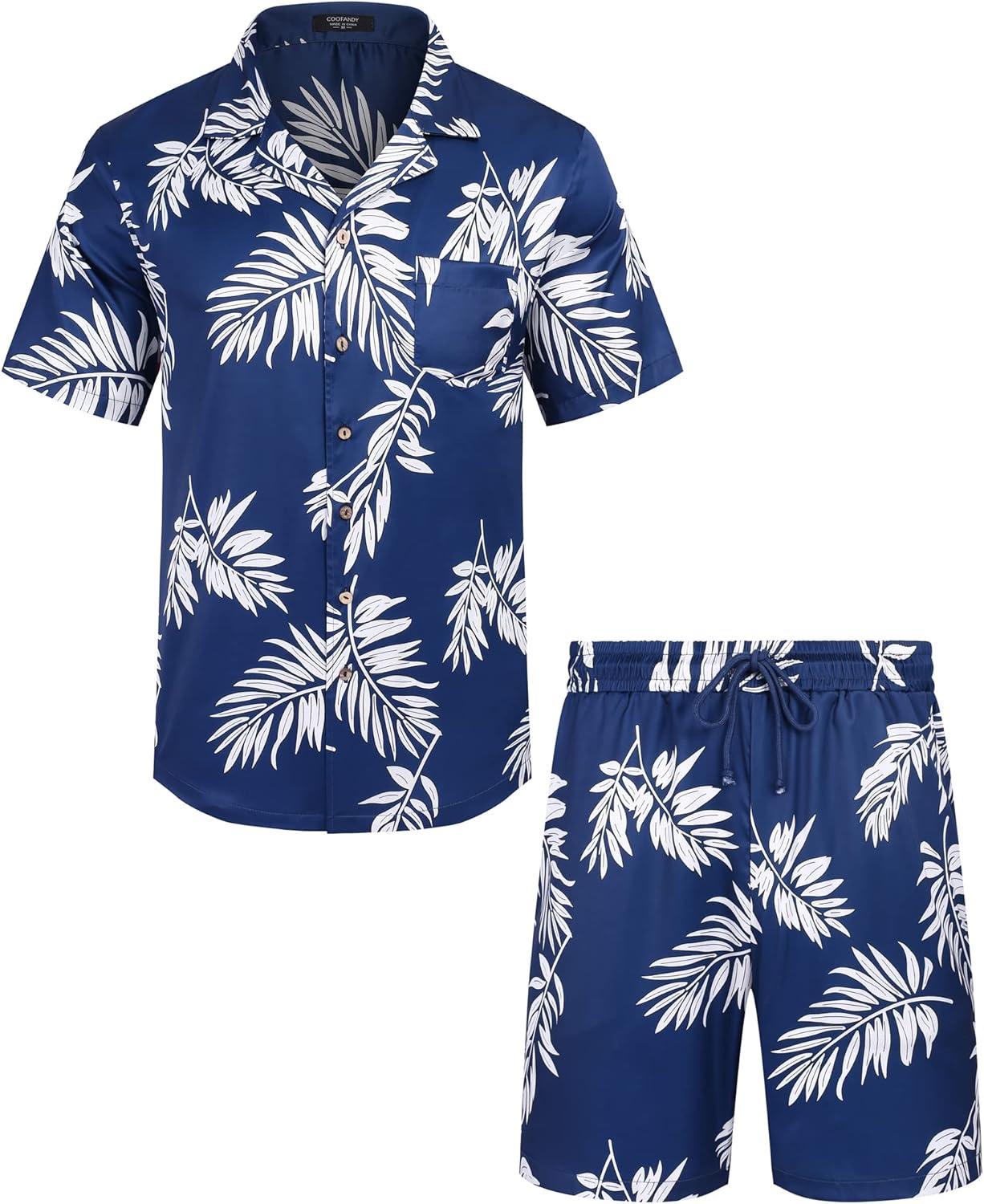 COOFANDY Mens Hawaiian Shirt and Shorts Set 2 Piece Vacation Outfits Floral Button Down Shirt(Navy Blue)