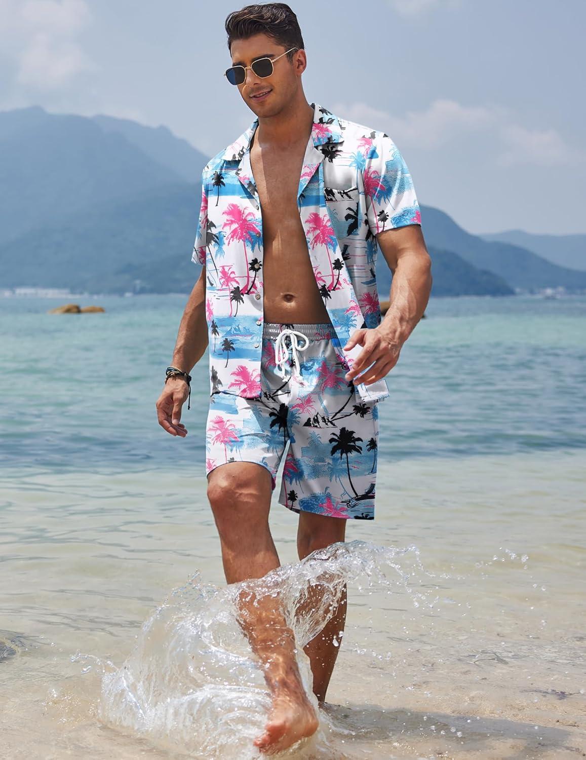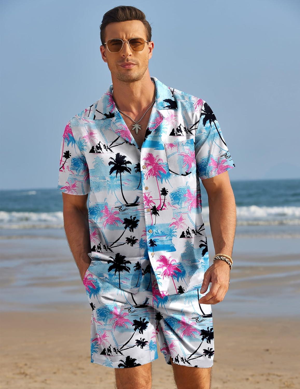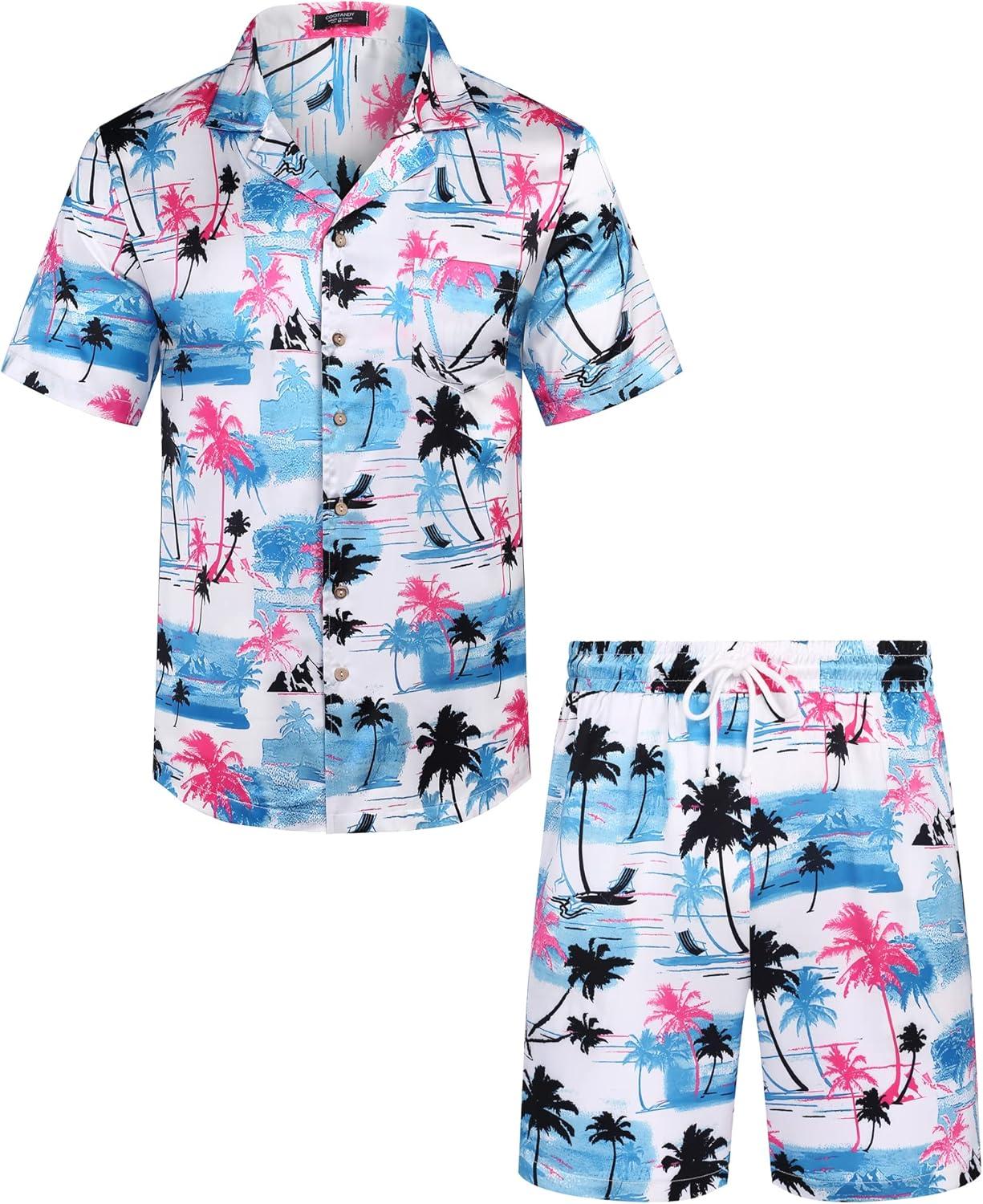 COOFANDY Mens Hawaiian Shirt and Shorts Set 2 Piece Vacation Outfits Floral Button Down Shirt(Palm Tree)