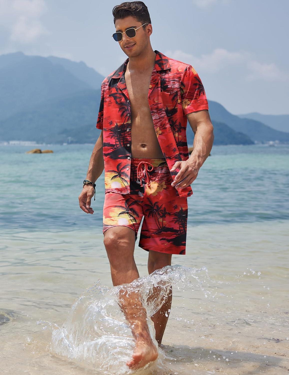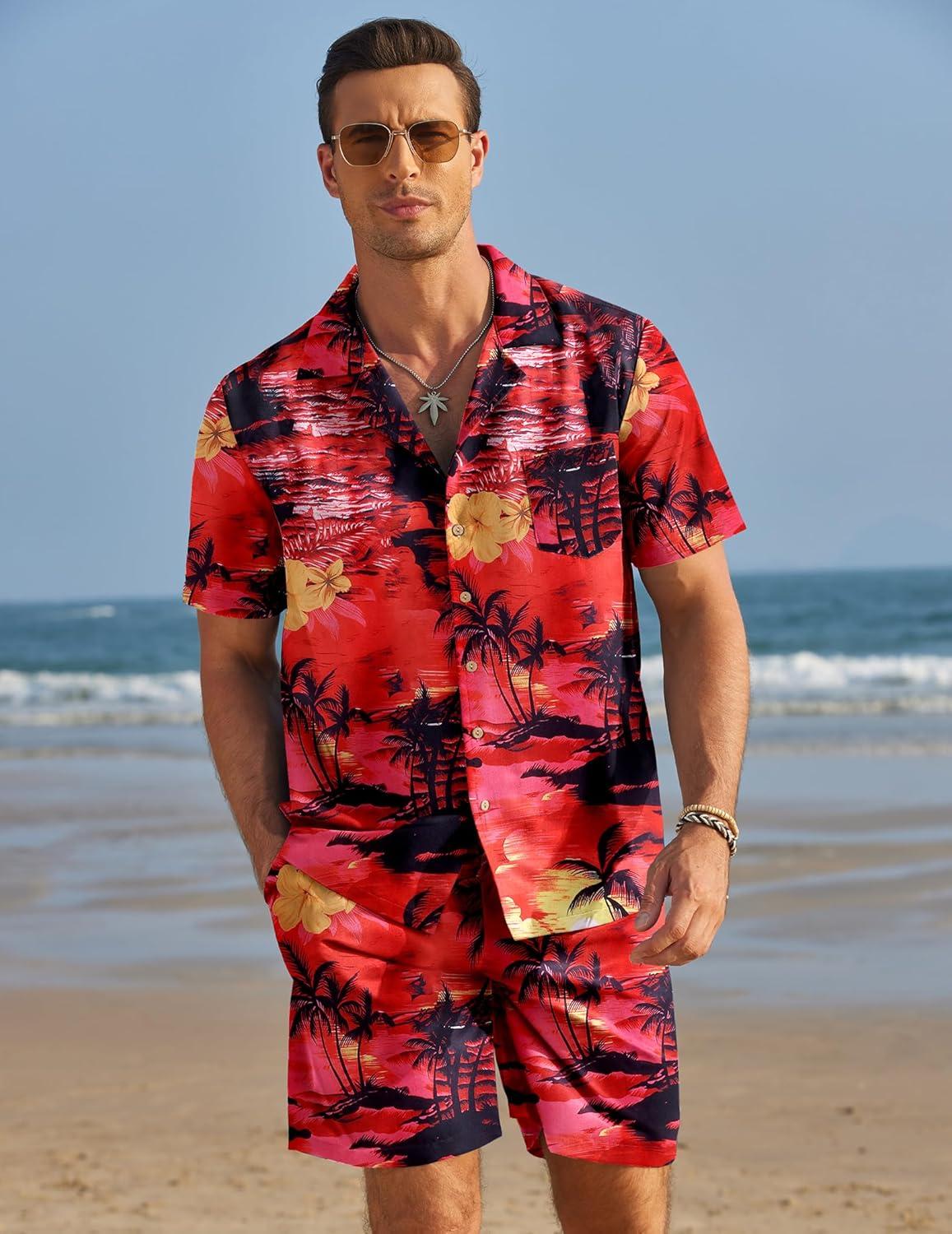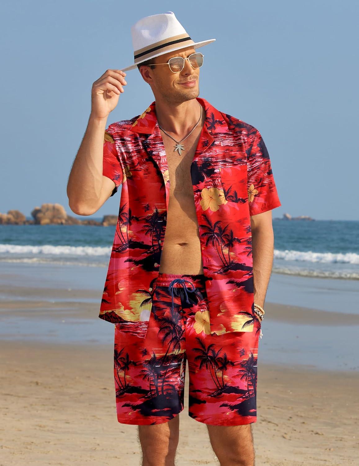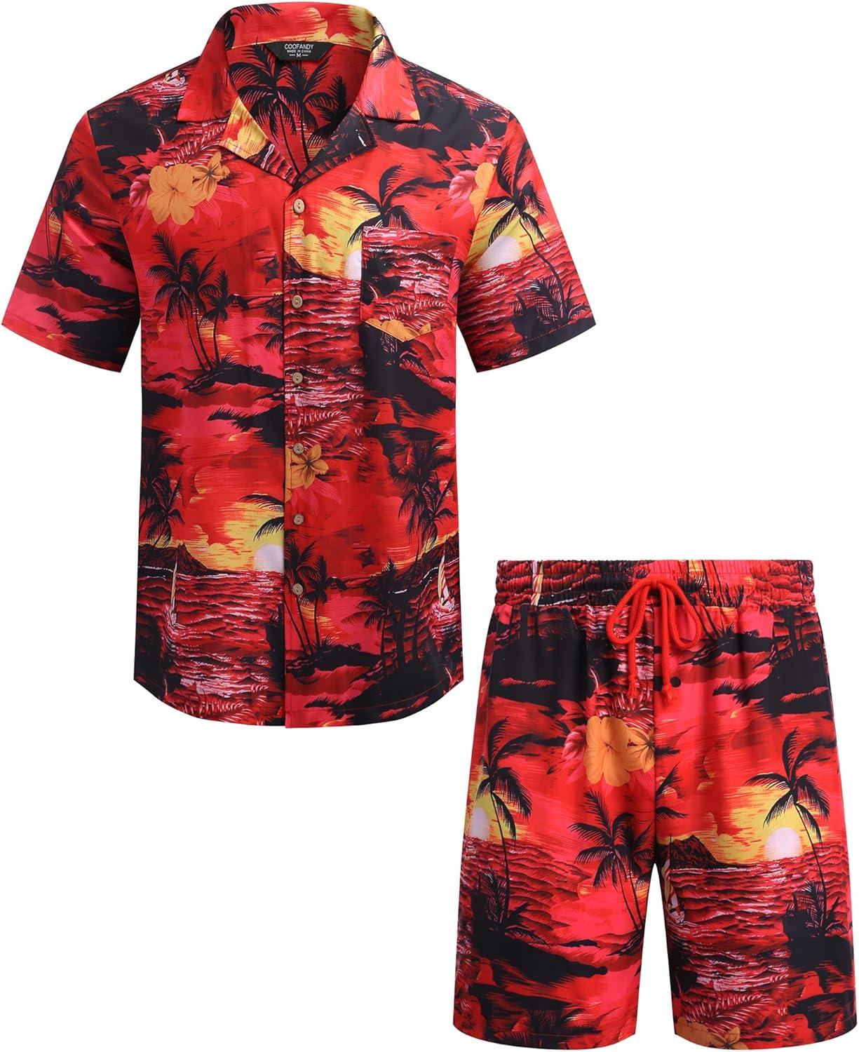 COOFANDY Mens Hawaiian Shirt and Shorts Set 2 Piece Vacation Outfits Floral Button Down Shirt(Red)
