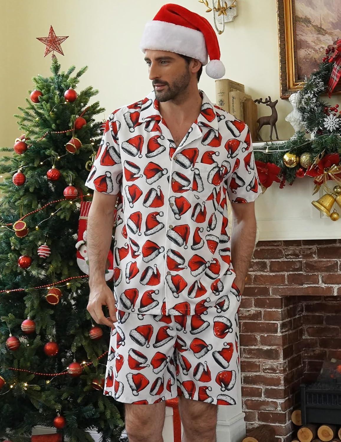 COOFANDY Mens Hawaiian Shirt and Shorts Set 2 Piece Vacation Outfits Floral Button Down Shirt(Santa Hat)