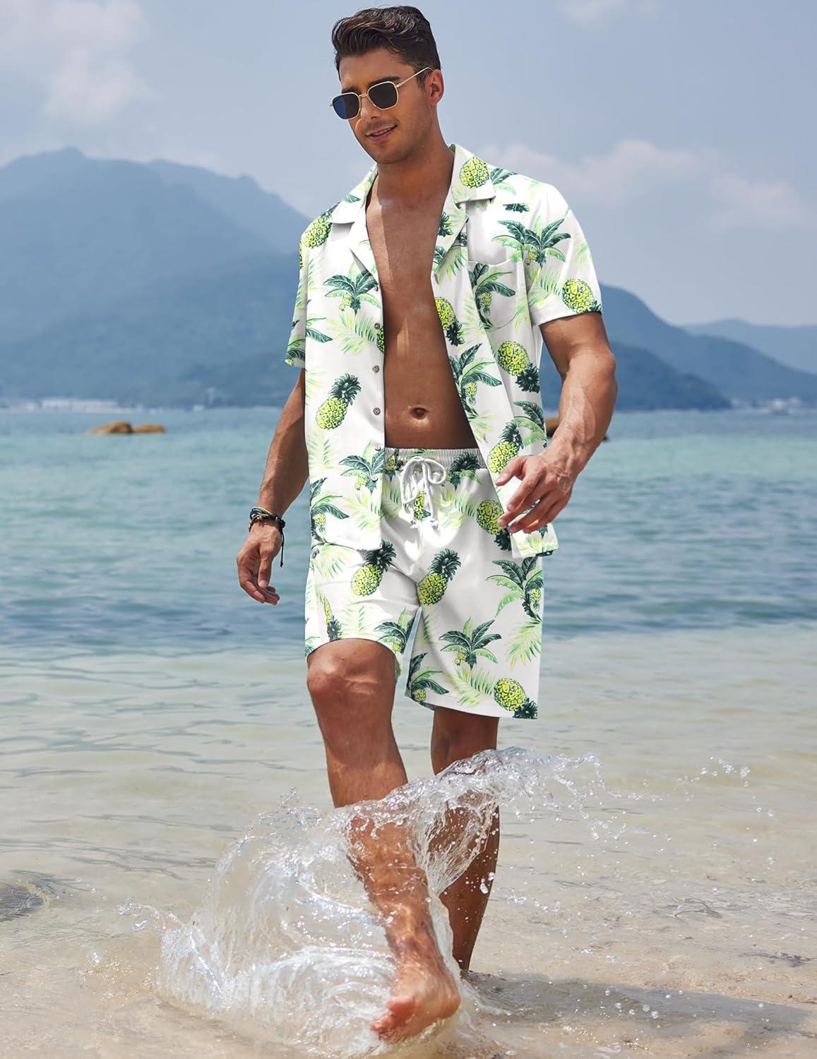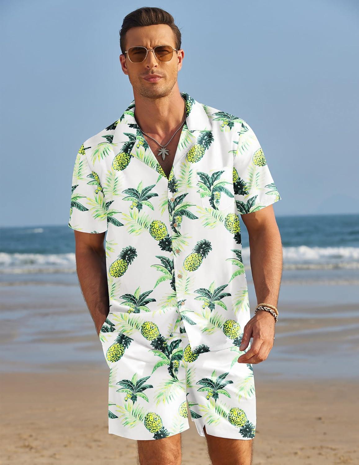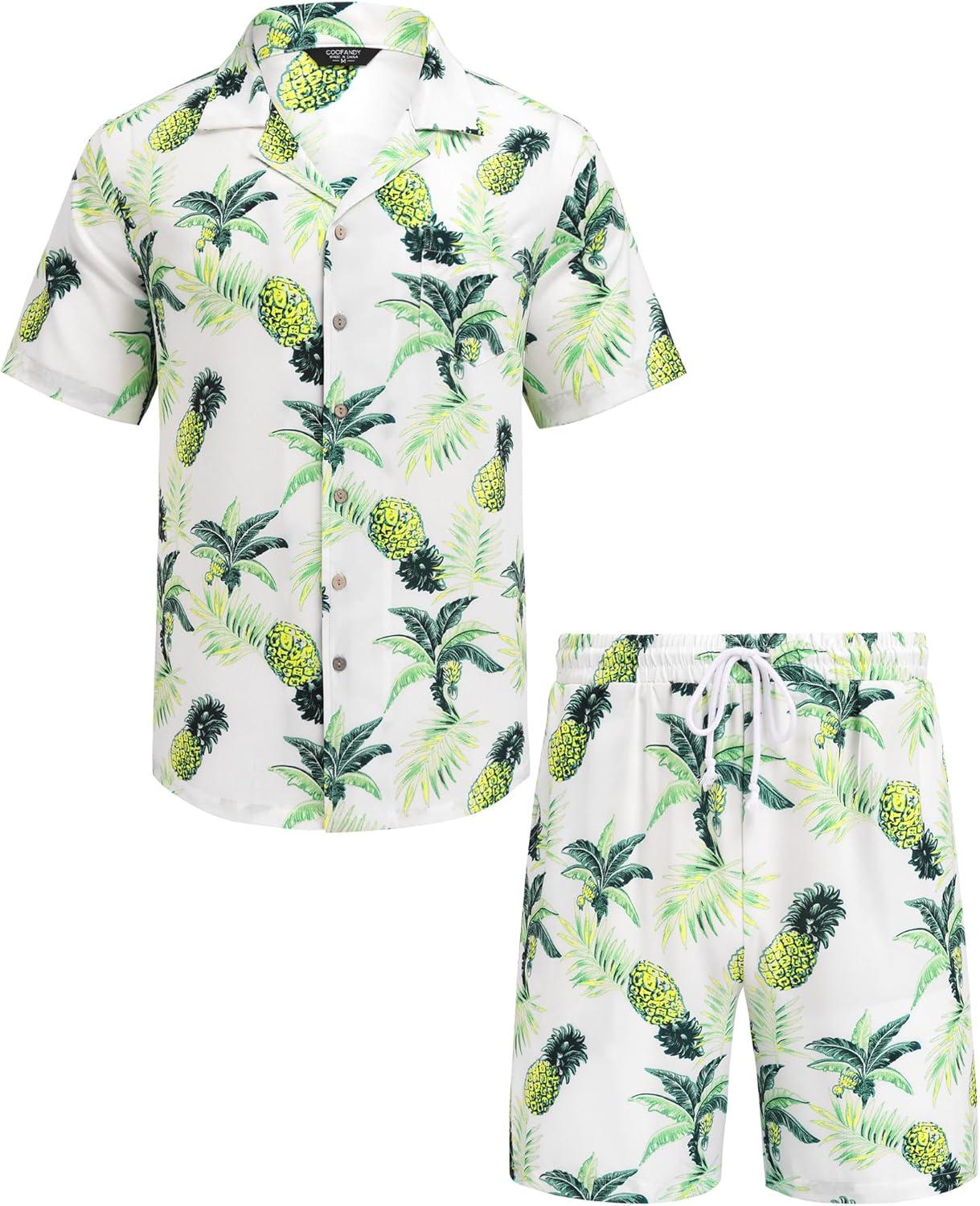 COOFANDY Mens Hawaiian Shirt and Shorts Set 2 Piece Vacation Outfits Floral Button Down Shirt(Pineapple Leaf Black)