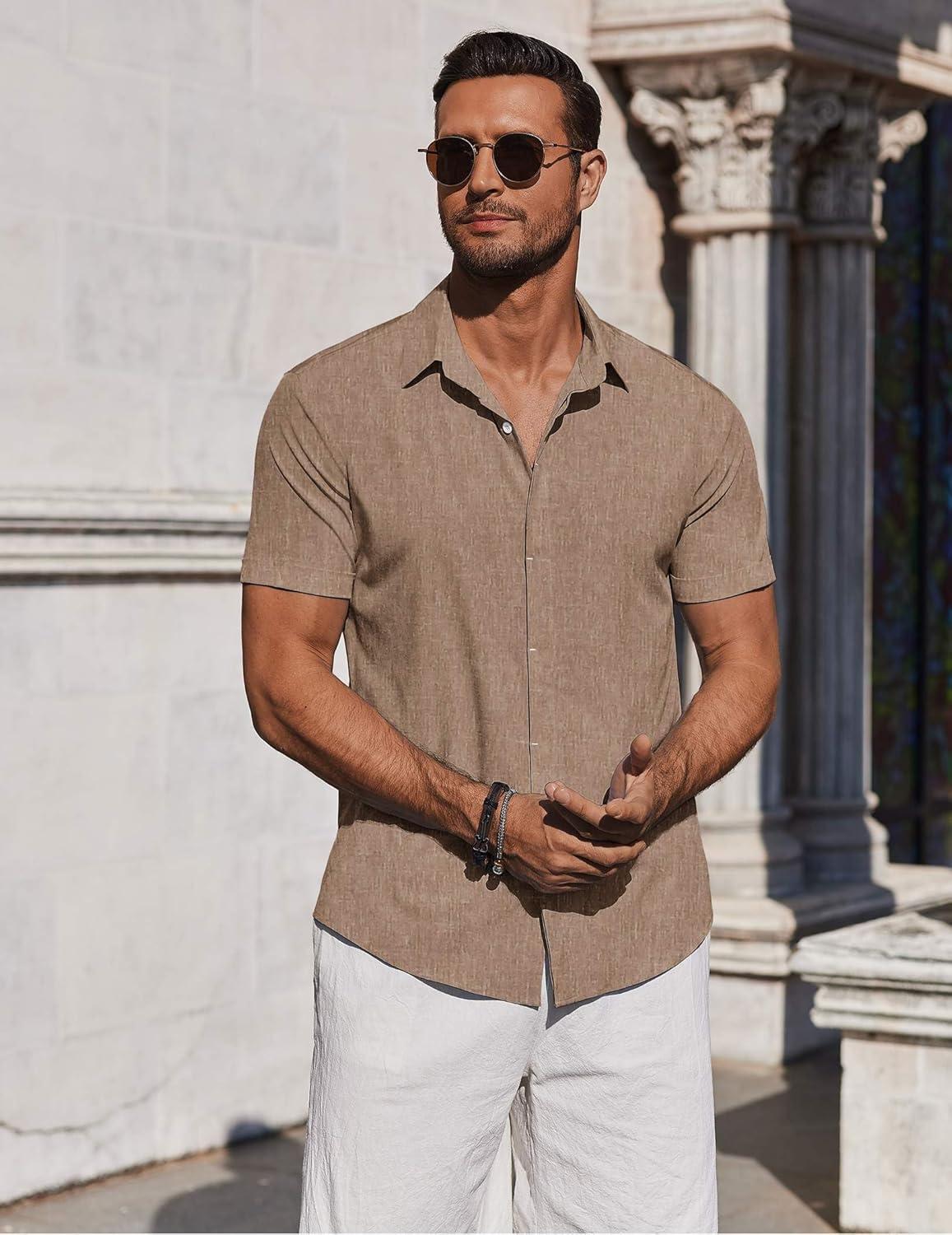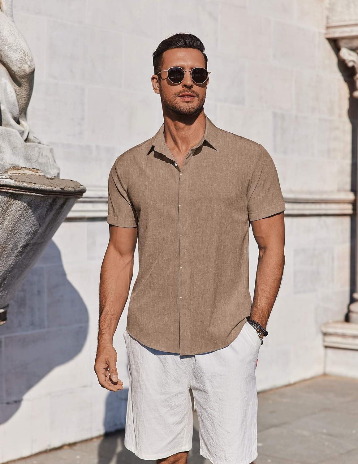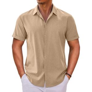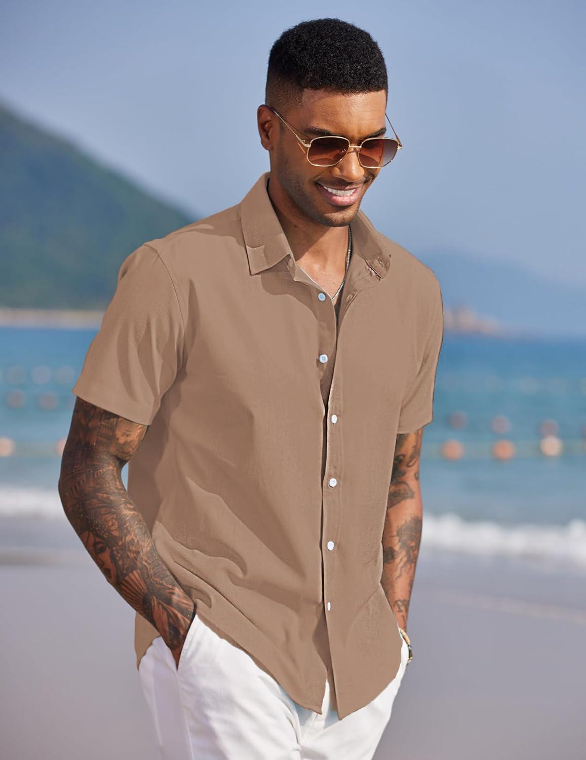 COOFANDY Mens Button Down Shirts Short Sleeve Casual Summer Beach Shirts for Men Vacation Wedding Linen Shirt(Khaki)