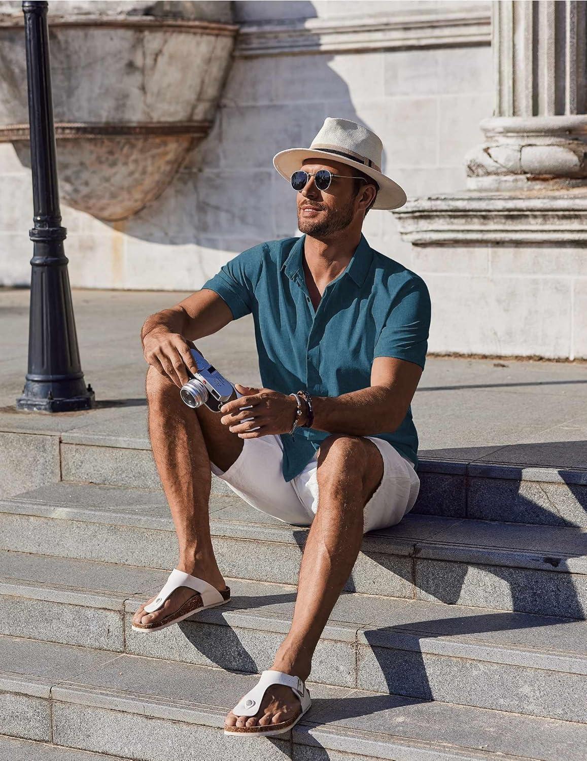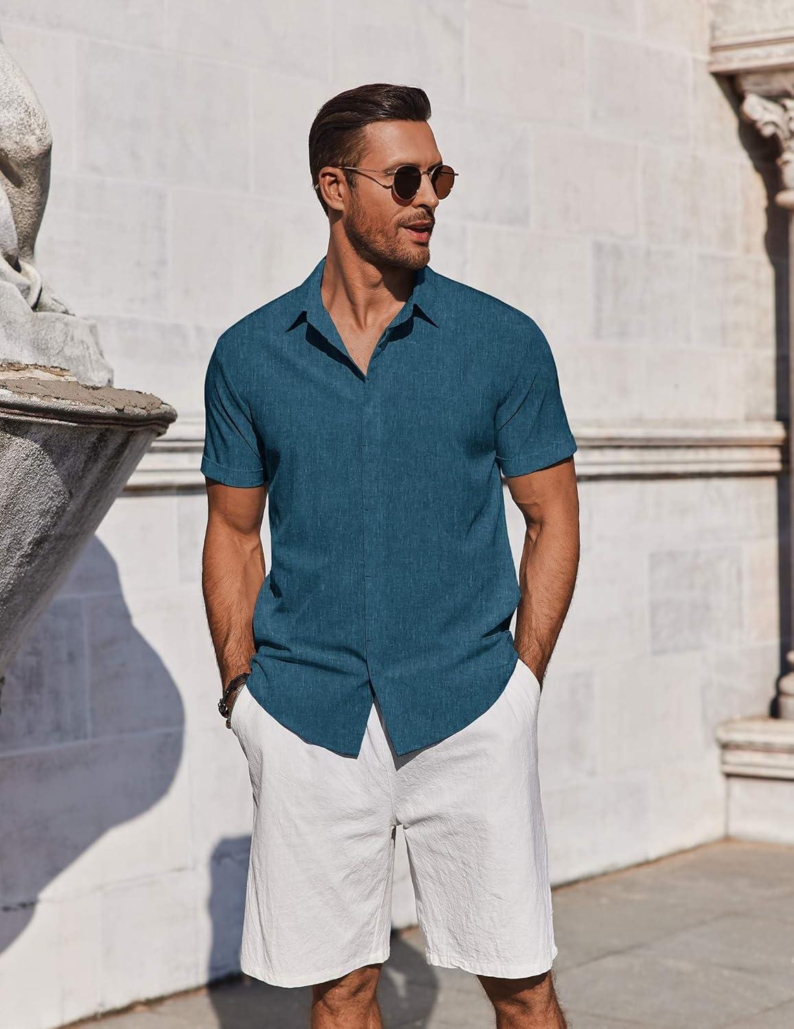COOFANDY Mens Button Down Shirts Short Sleeve Casual Summer Beach Shirts for Men Vacation Wedding Linen Shirt(Clear Blue)
