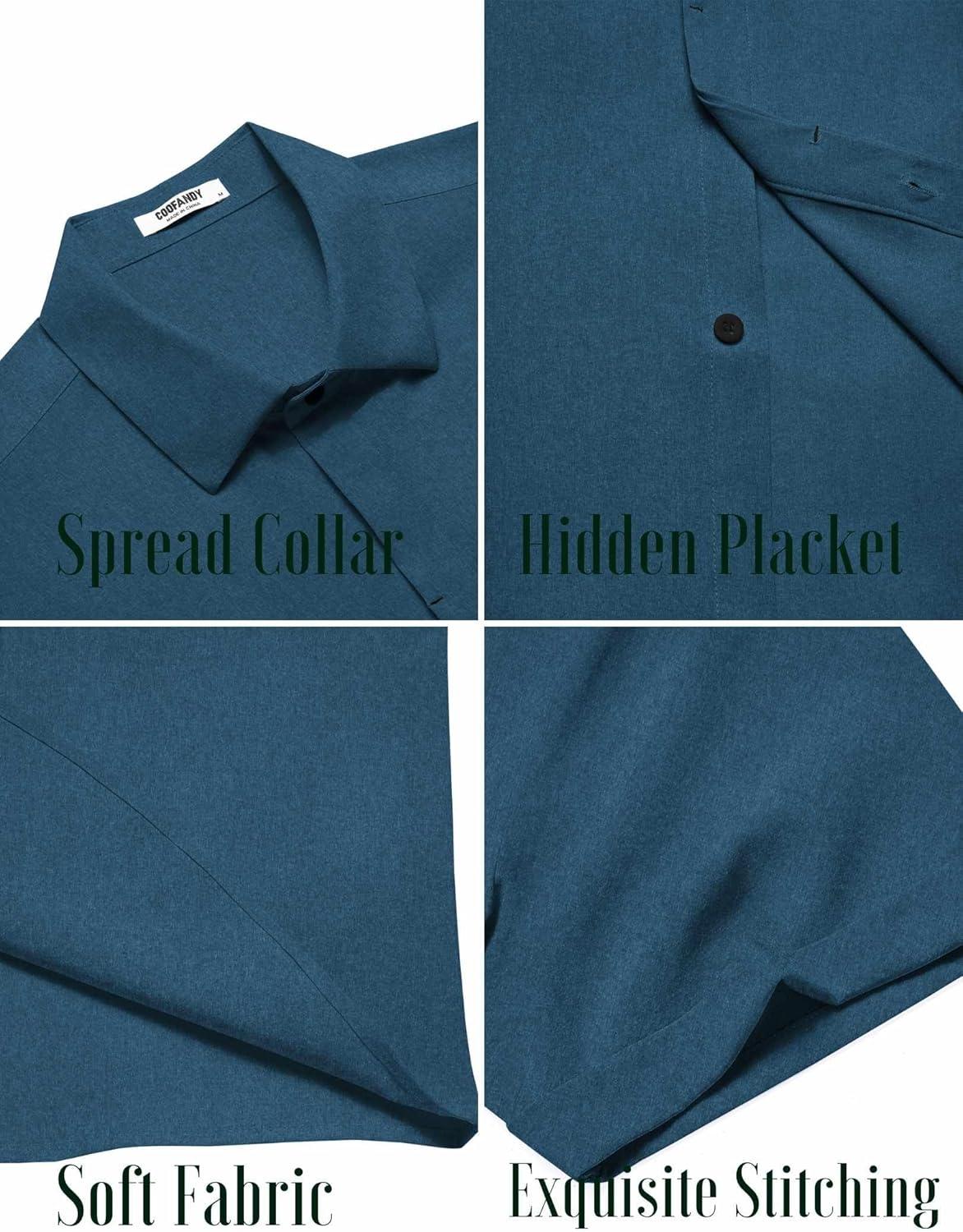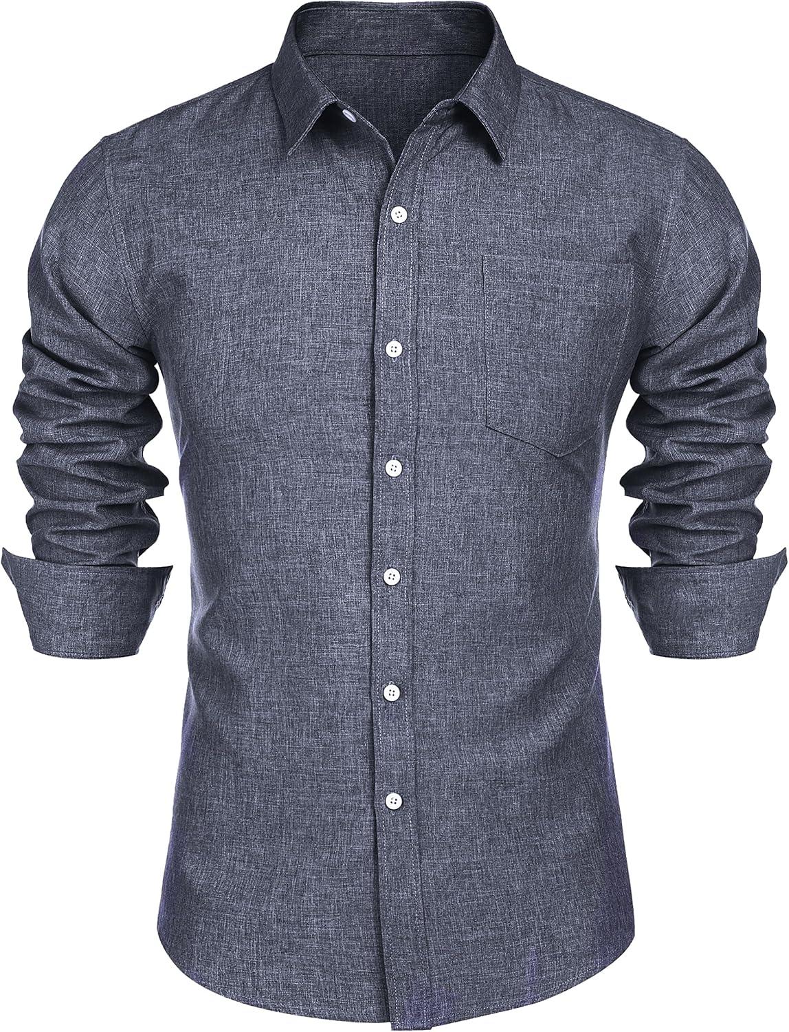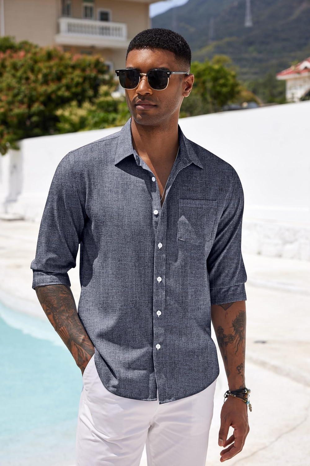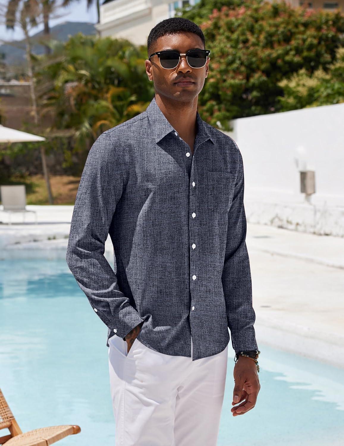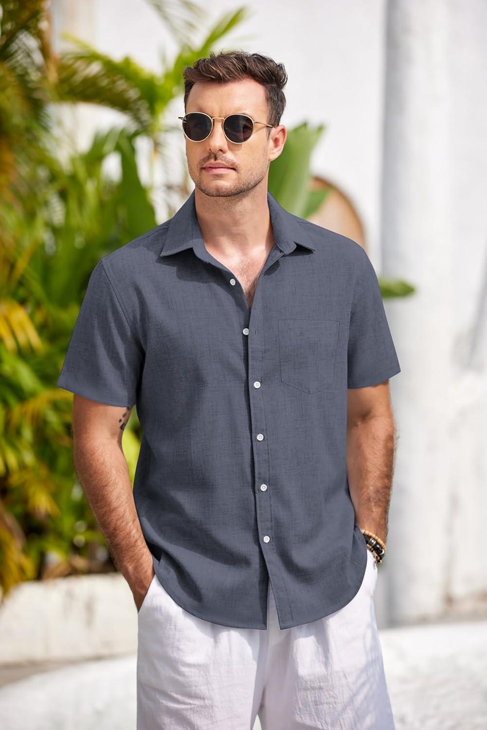 COOFANDY Mens Button Down Shirts Short Sleeve Casual Summer Beach Shirts for Men Vacation Wedding Linen Shirt(Dark Blue Grey)