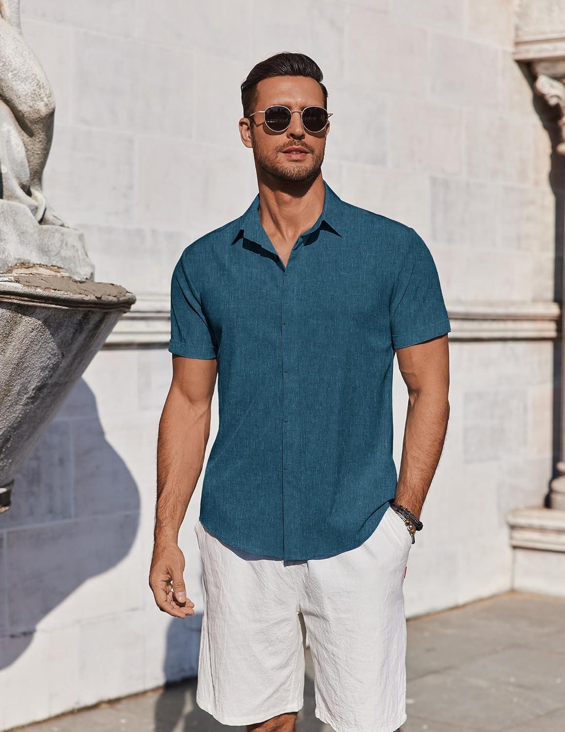 COOFANDY Mens Button Down Shirts Short Sleeve Casual Summer Beach Shirts for Men Vacation Wedding Linen Shirt(Denim Blue)
