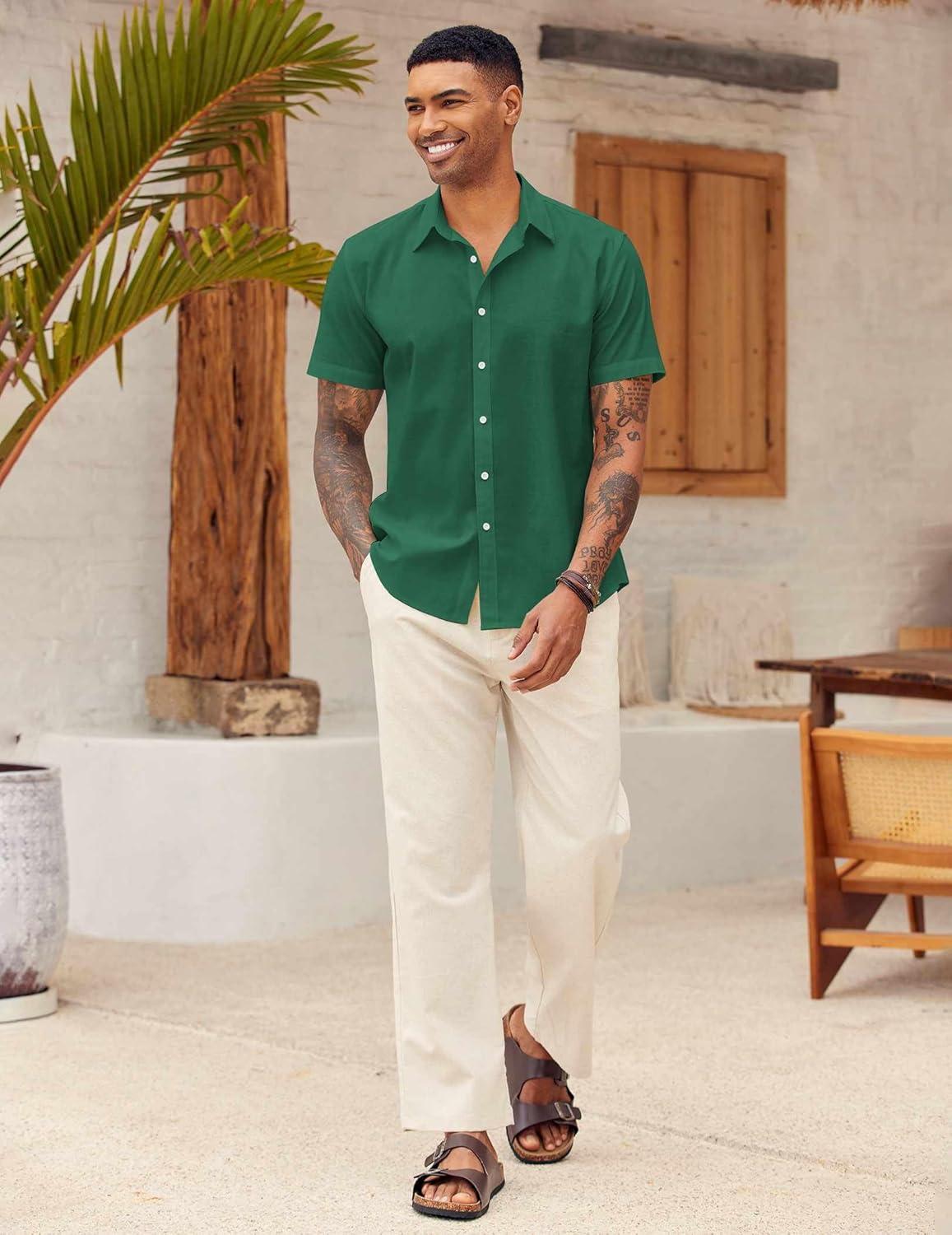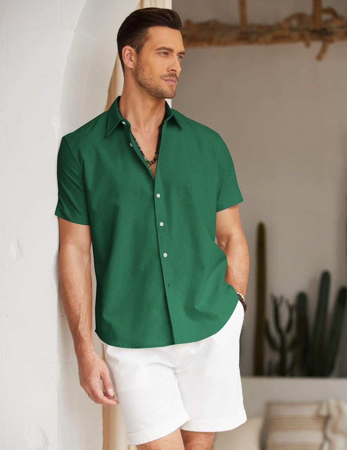 COOFANDY Mens Button Down Shirts Short Sleeve Casual Summer Beach Shirts for Men Vacation Wedding Linen Shirt(Evergreen)