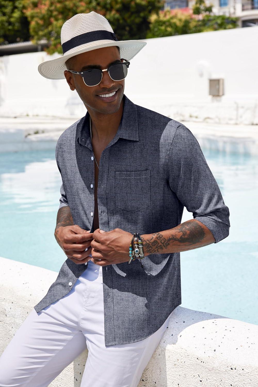 COOFANDY Mens Button Down Shirts Short Sleeve Casual Summer Beach Shirts for Men Vacation Wedding Linen Shirt(Gray& Blue)