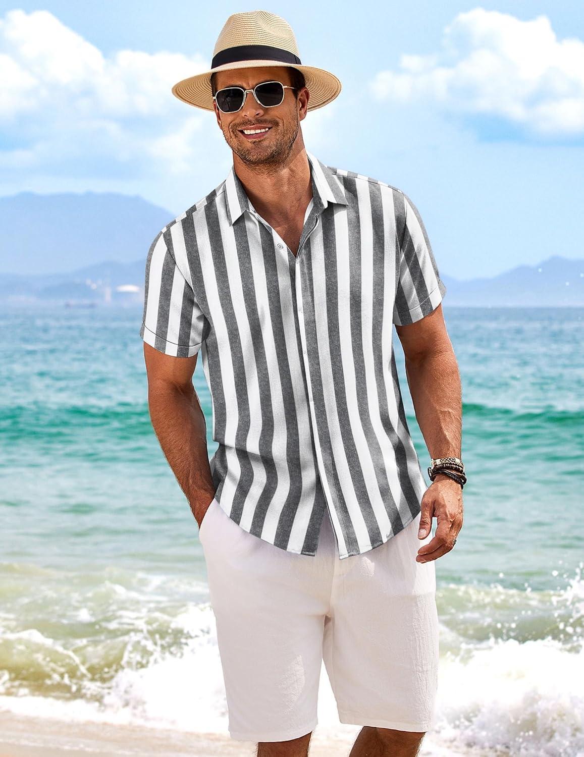 COOFANDY Mens Button Down Shirts Short Sleeve Casual Summer Beach Shirts for Men Vacation Wedding Linen Shirt(Grey-white Stripes)