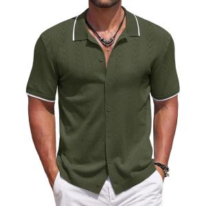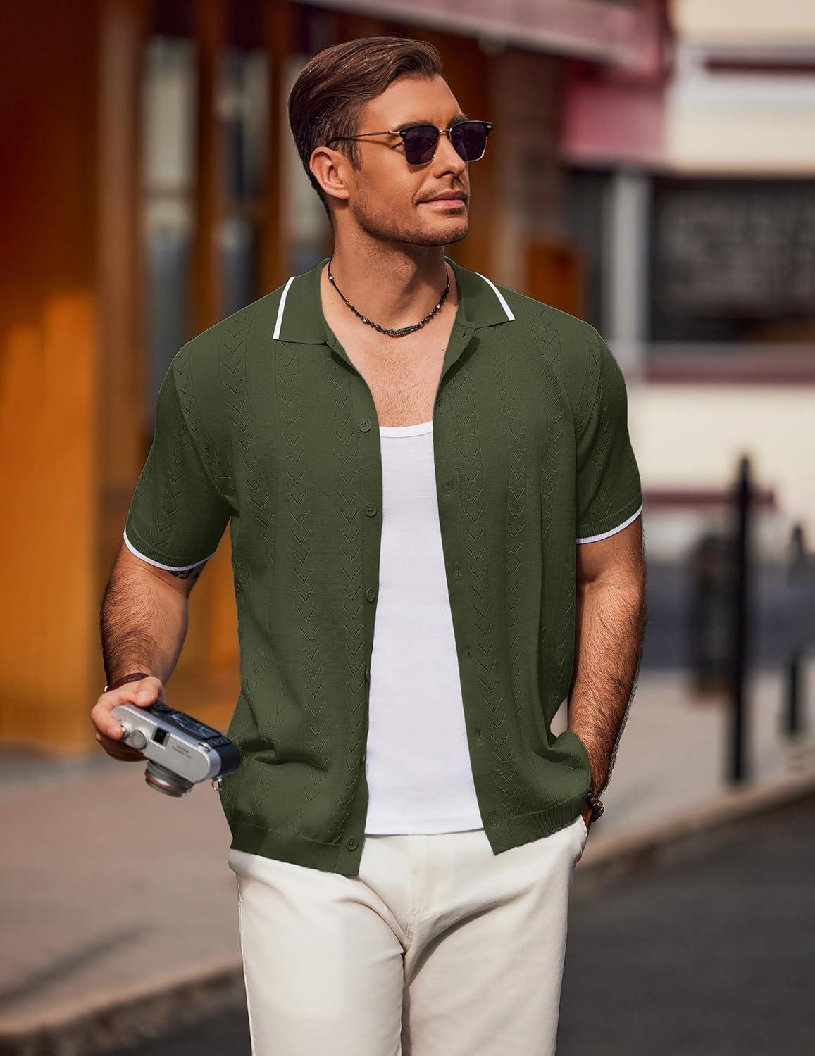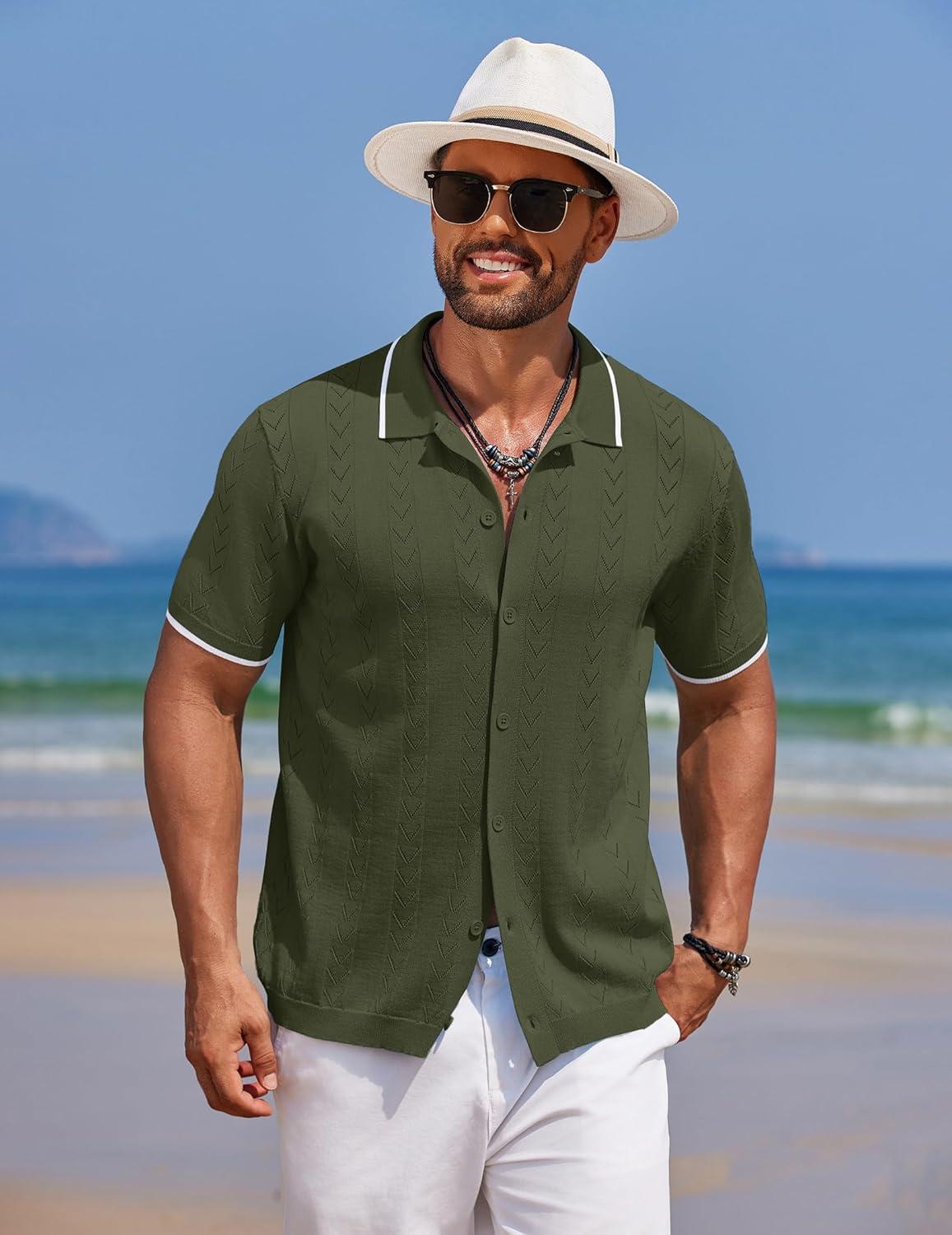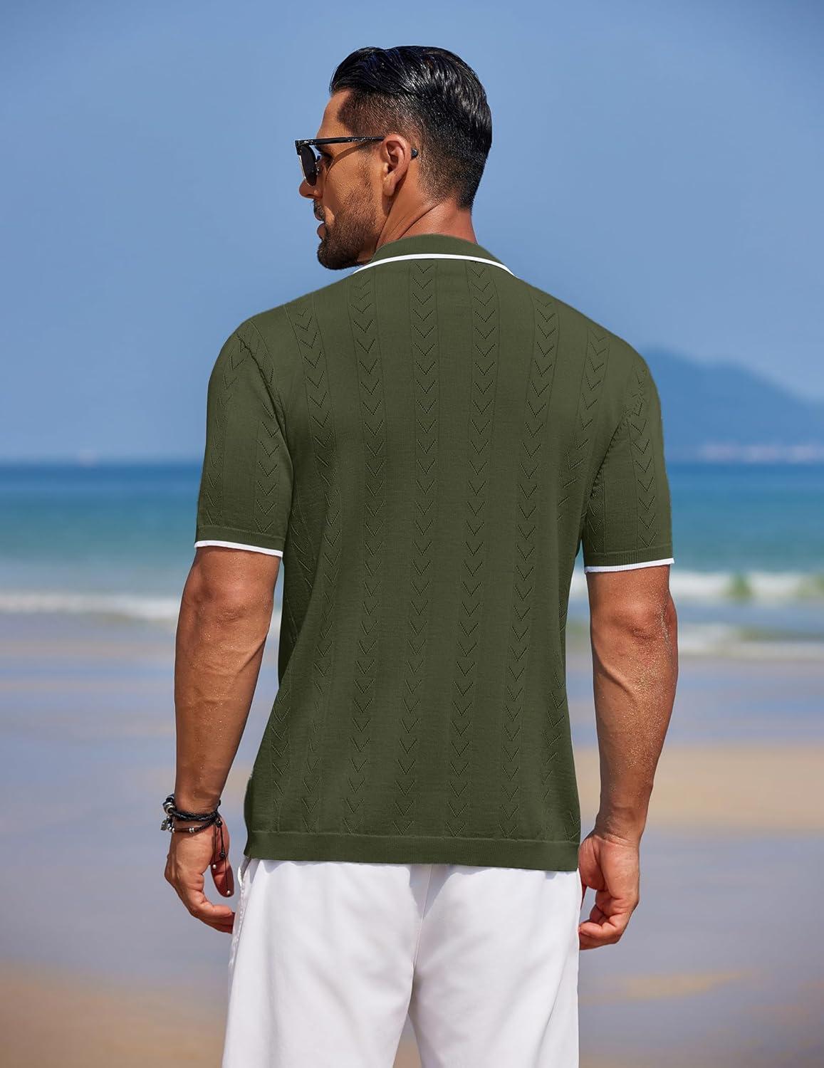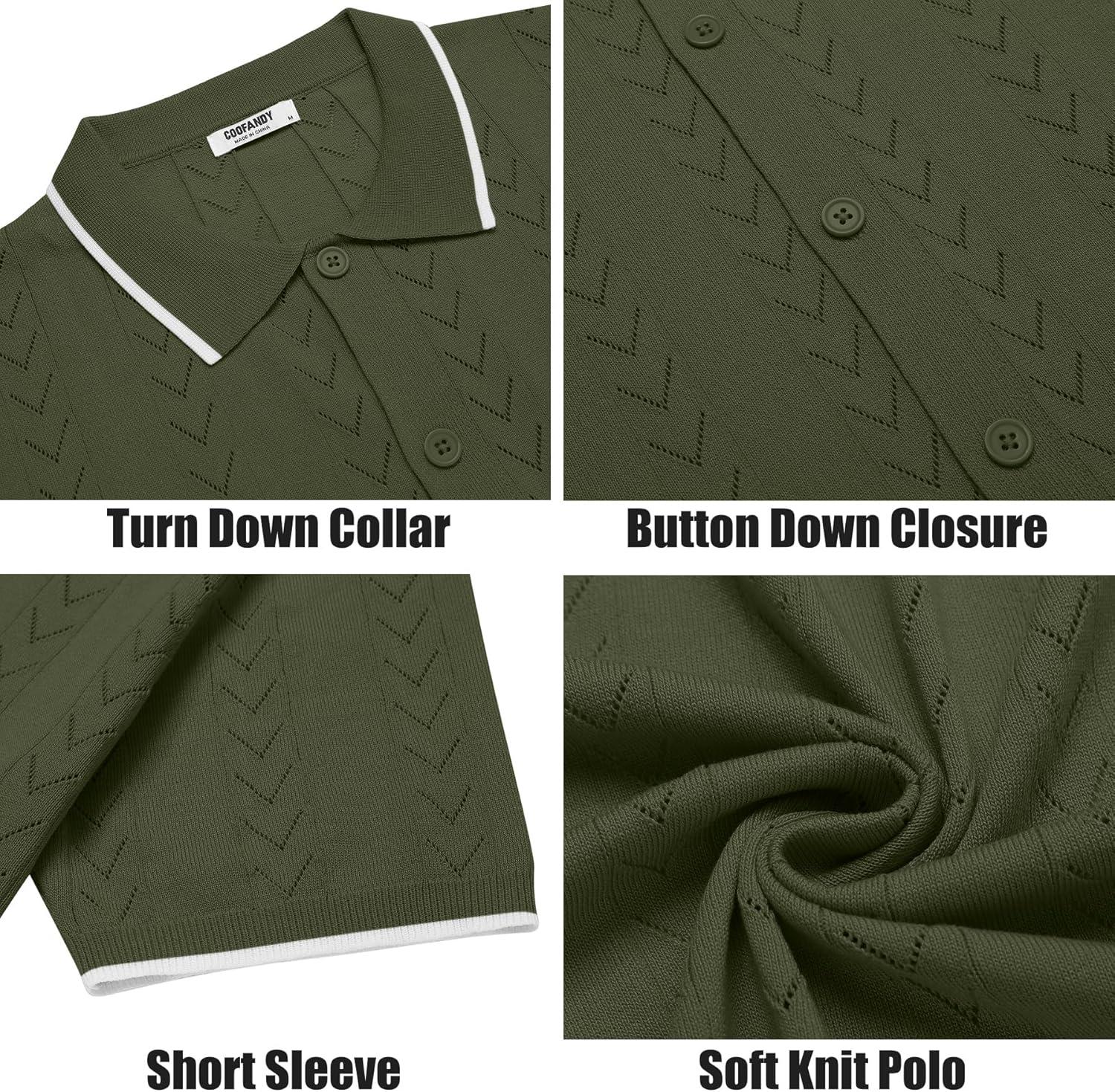 COOFANDY Mens Knit Polo Shirts Button Down Short Sleeve Shirt Summer Casual Beach Vacation Tops(Army Green)