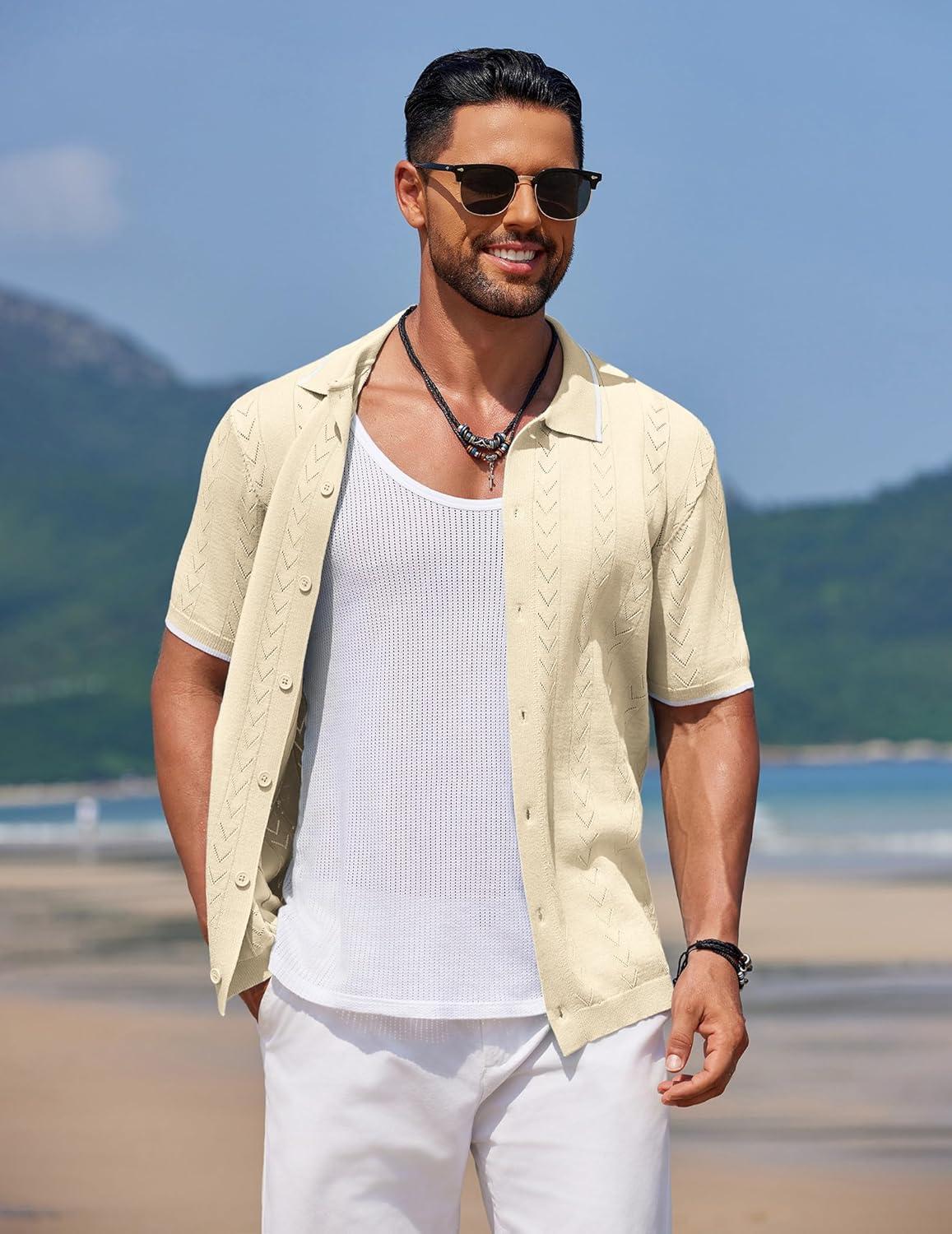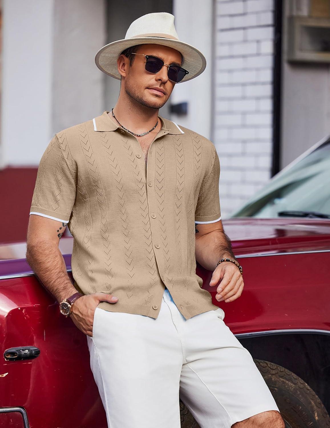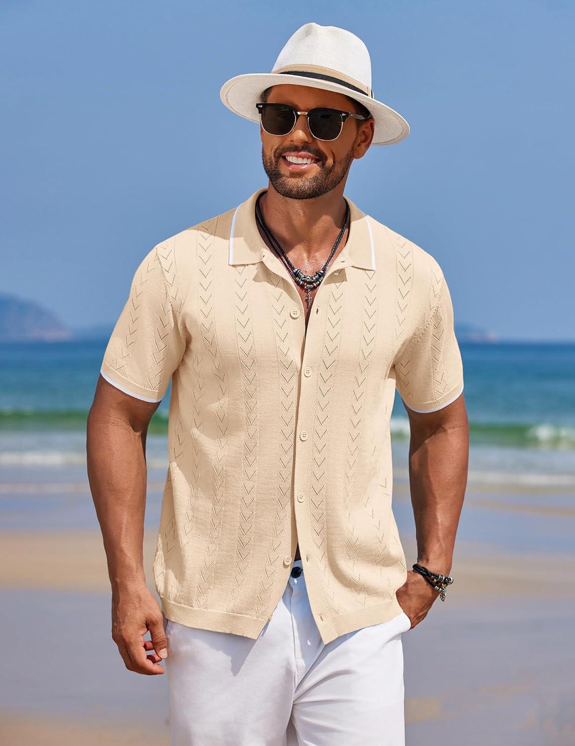 COOFANDY Mens Knit Polo Shirts Button Down Short Sleeve Shirt Summer Casual Beach Vacation Tops(Beige)